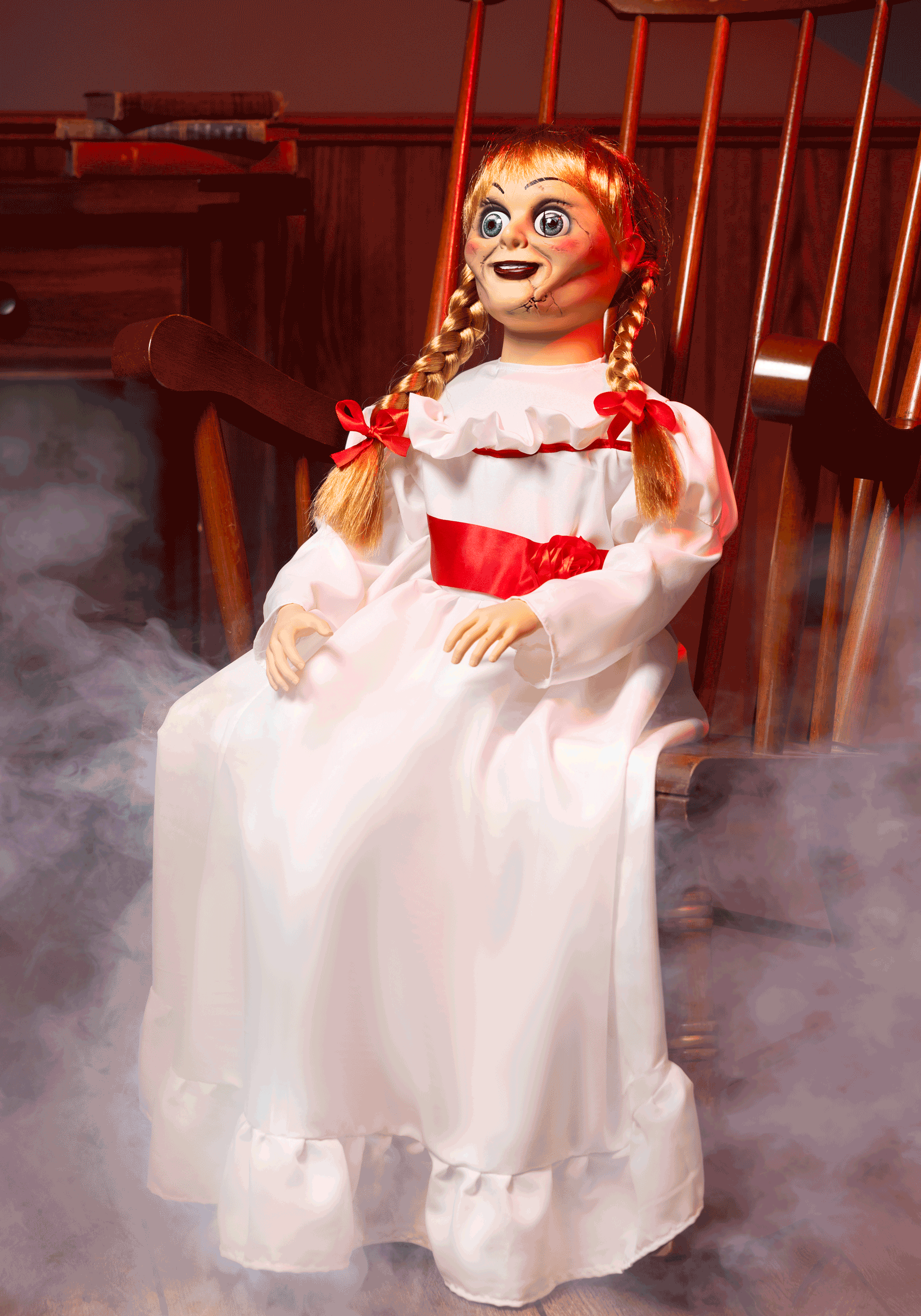 - Annabelle is in a seated position, plays eerie music, head moves side to side, posable arms