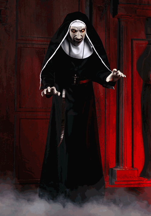 She watches in silence. She waits in the shadows. And when the time is right... she strikes! The Nun Animated Halloween Decoration is a terrifyingly lifelike recreation of Valak, the demon that has haunted The Conjuring universe. With her piercing yellow eyes, deathly pale face, and wicked, fang-lined snarl, she is the embodiment of pure evil. Whether standing in the corner of a dimly lit room or guarding the entrance to your haunted house, this sinister sister will ensure that no soul leaves unscathed.
