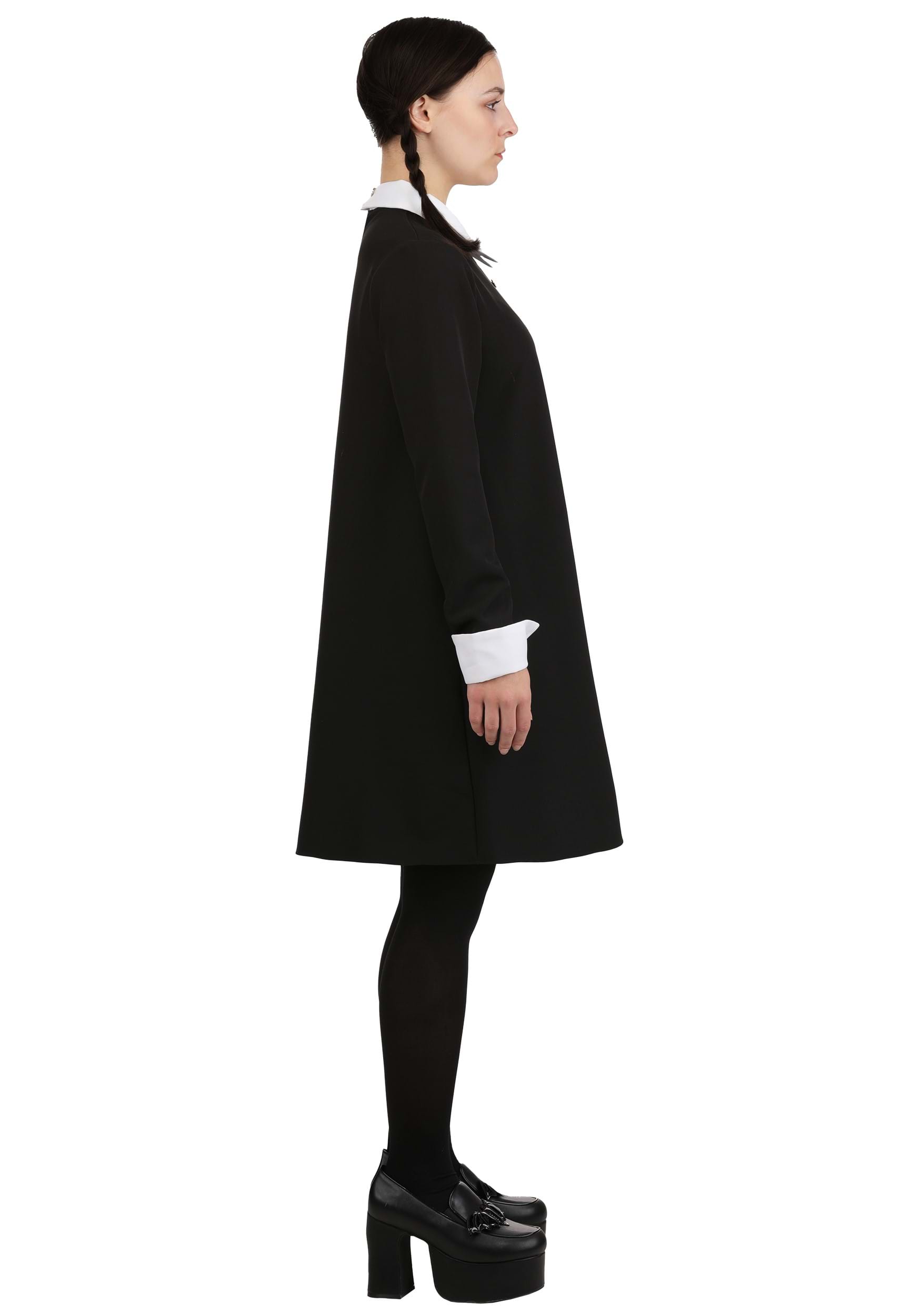 A bright white collar and matching cuffs provide the essential contrast, perfectly framing the all-black body of the dress. These clean lines sharpen the look with vintage precision, just like Wednesday wore it during her most unsettling one-liners and stoic piano recitals. Paired with black tights and a pair of braids, the effect is pure classic creep.