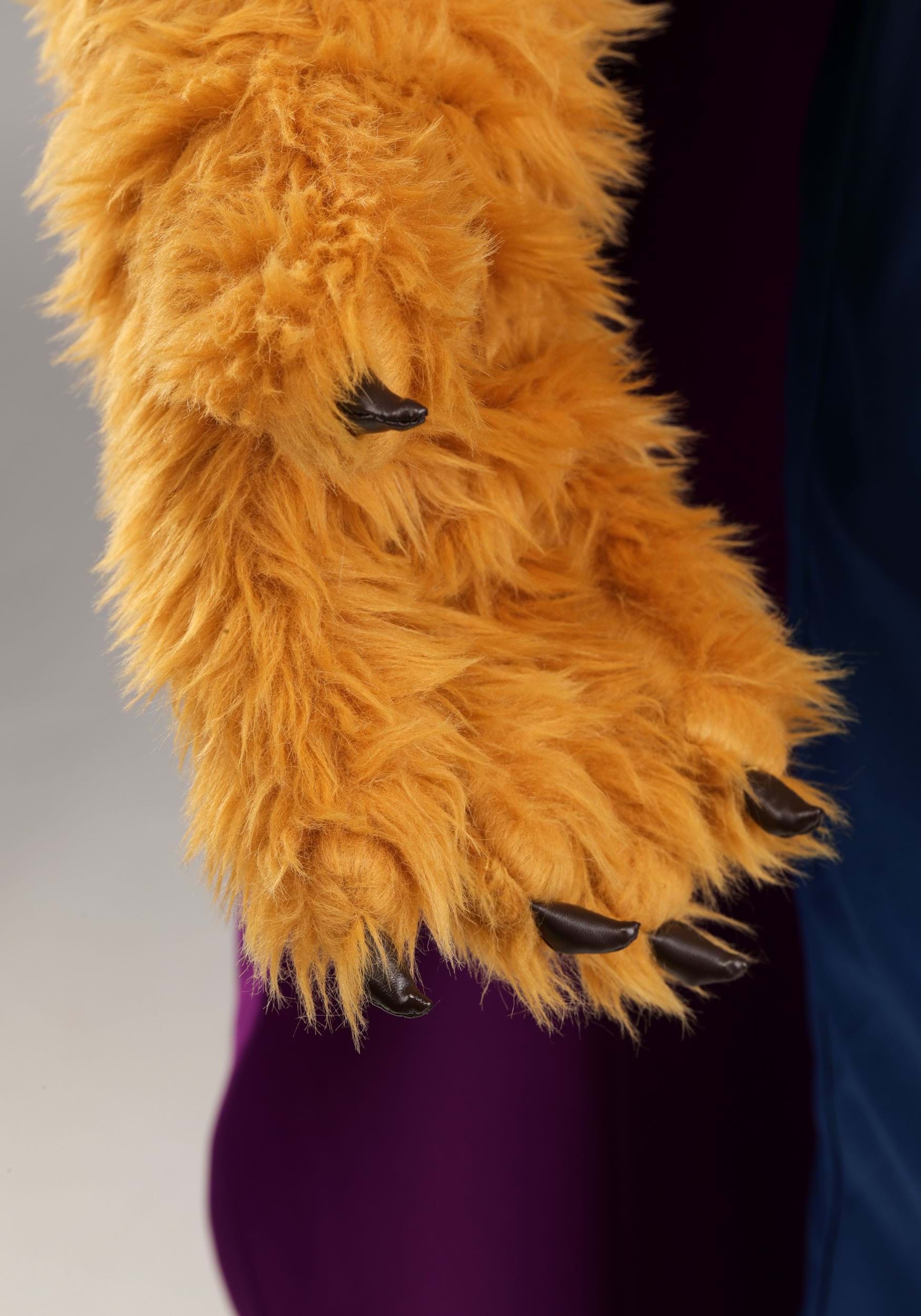 - Shirt: Brown Faux Fur: 54% acrylic 46% polyester, Yellow Faux Fur:58% polyester 42% acrylic, Lining: 100% polyester, Pants: Top Shell: 100% polyester ,Top Lining: 100% polyester, Bottom: 58% polyester 42% acrylic, Tail: 58% polyester 42% acrylic, Cloak: 100% polyester