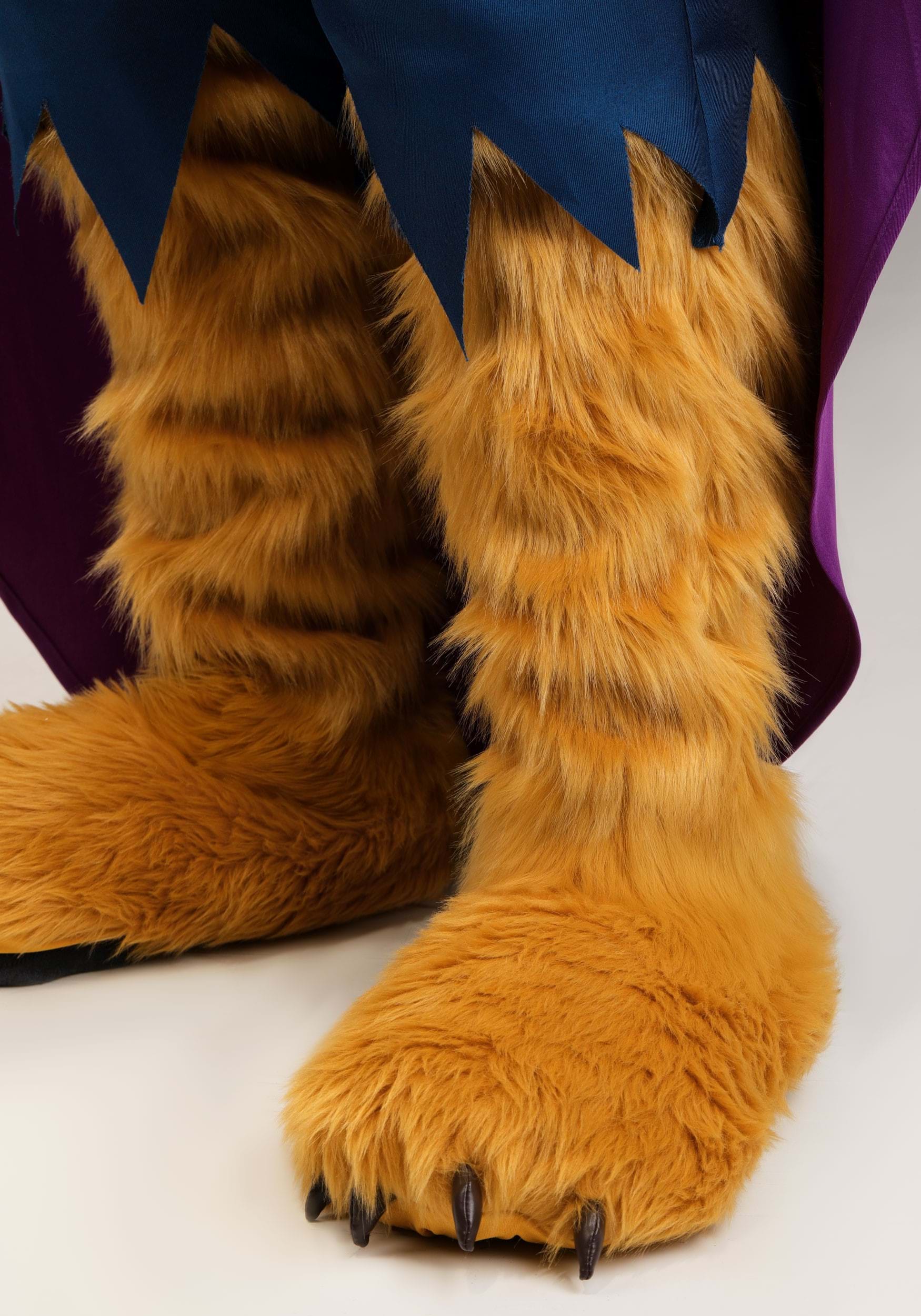 The shirt's padding creates a broad, powerful frame, while the elastic-waist pants feature sculpted leg padding and wild fur accents. Adjustable gloves and shoe covers boast faux leather claws for a finishing touch. Fastened by a molded clasp, the sweeping purple cape fits over your shoulders for added drama!