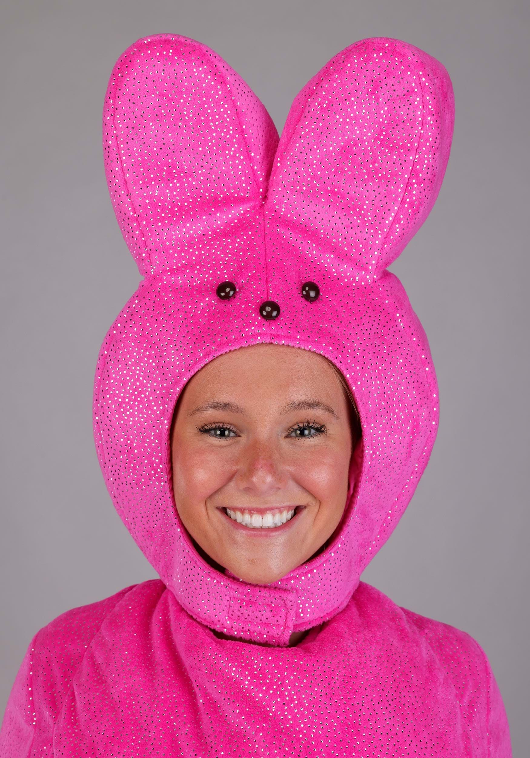 Topping off this confectionery dream is the headpiece, shaped just like the iconic Peeps bunny—with tall ears, black dot eyes, and an irresistible grin. It secures gently under the chin, completing the transformation into a life-sized candy classic. The Peeps logo on the front is the final touch, making sure everyone knows this isn't just a bunny—it's the bunny.