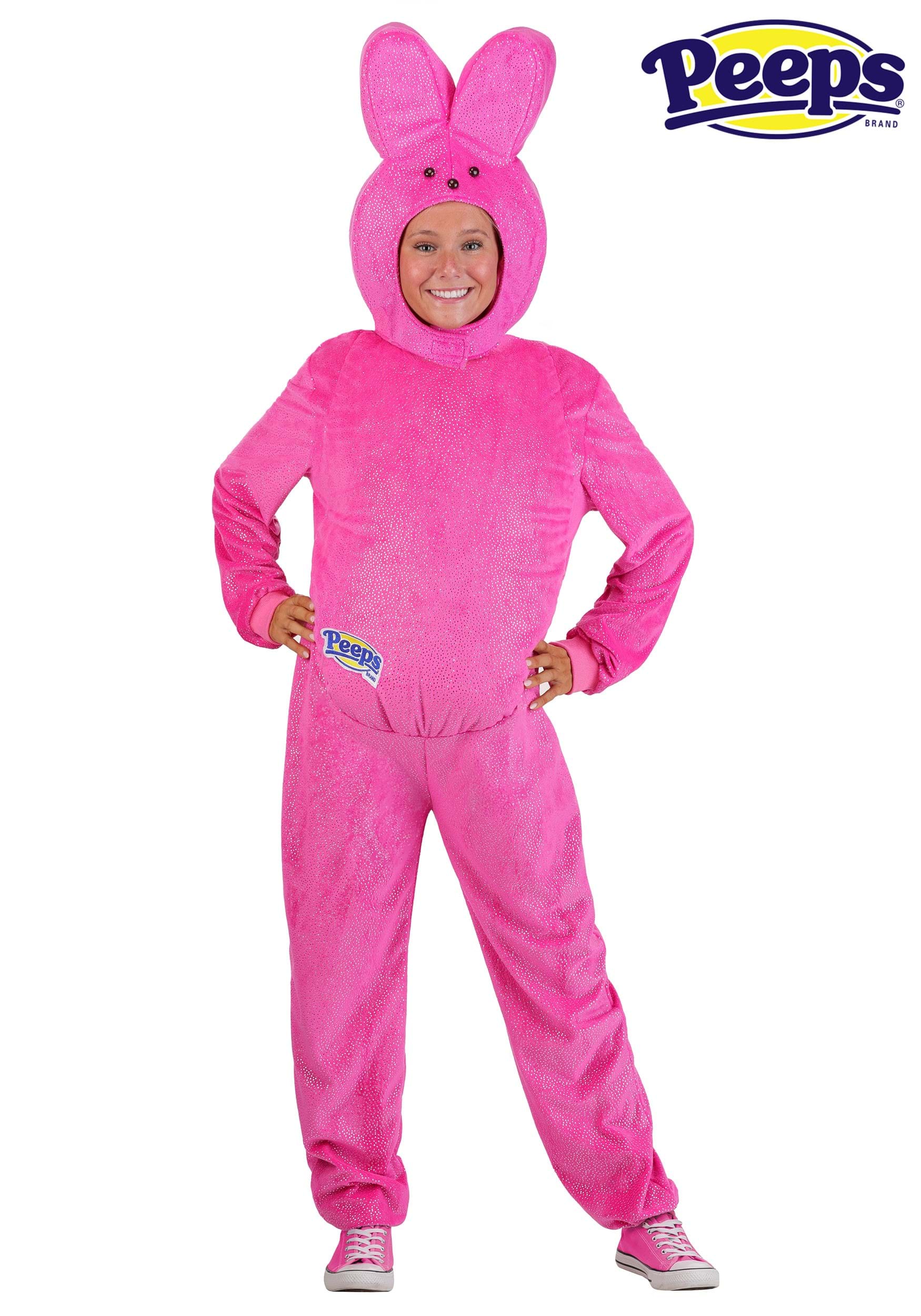 Crafted from soft, cozy polyester, the jumpsuit and headpiece are dappled with a sparkling texture that mimics the signature sugar-dusted look of a real Peeps bunny. Every glittering shimmer invites admiration, creating a candy-coated glow under the moonlight—or any porch light welcoming trick-or-treaters!