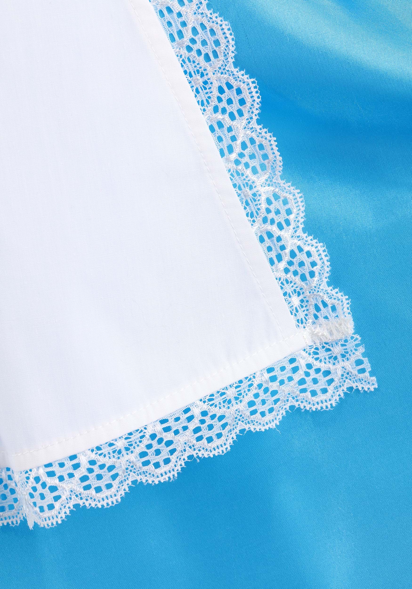 - Woven collar, sleeves cuffs and sewn on apron, apron has scalloped edge, pre tied bow sewn on apron belt secures on the back over the zipper with hook and loop fastener