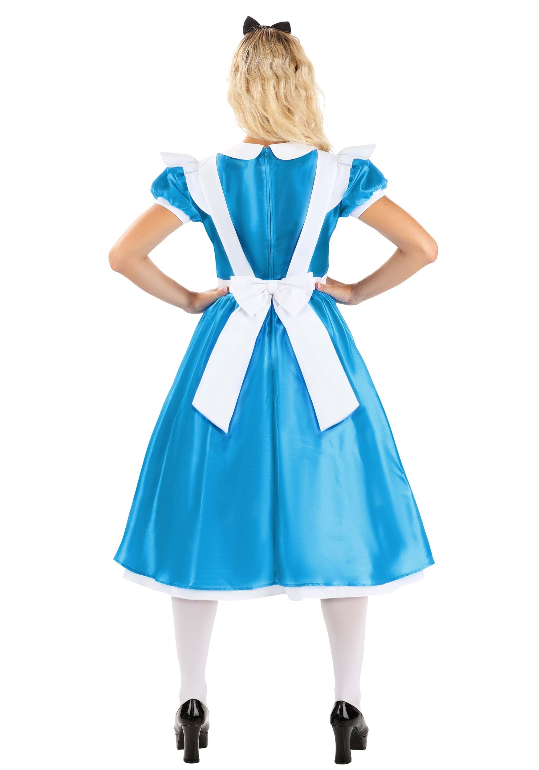 The light blue satin dress shimmers with a soft sheen, and the attached white apron ties in the back with a matching ribbon, creating Alice's signature look. A small white collar at the neckline adds a polished touch. The included black headband, topped with a bow, completes the look and makes this officially licensed costume the perfect choice for anyone dreaming of Wonderland.