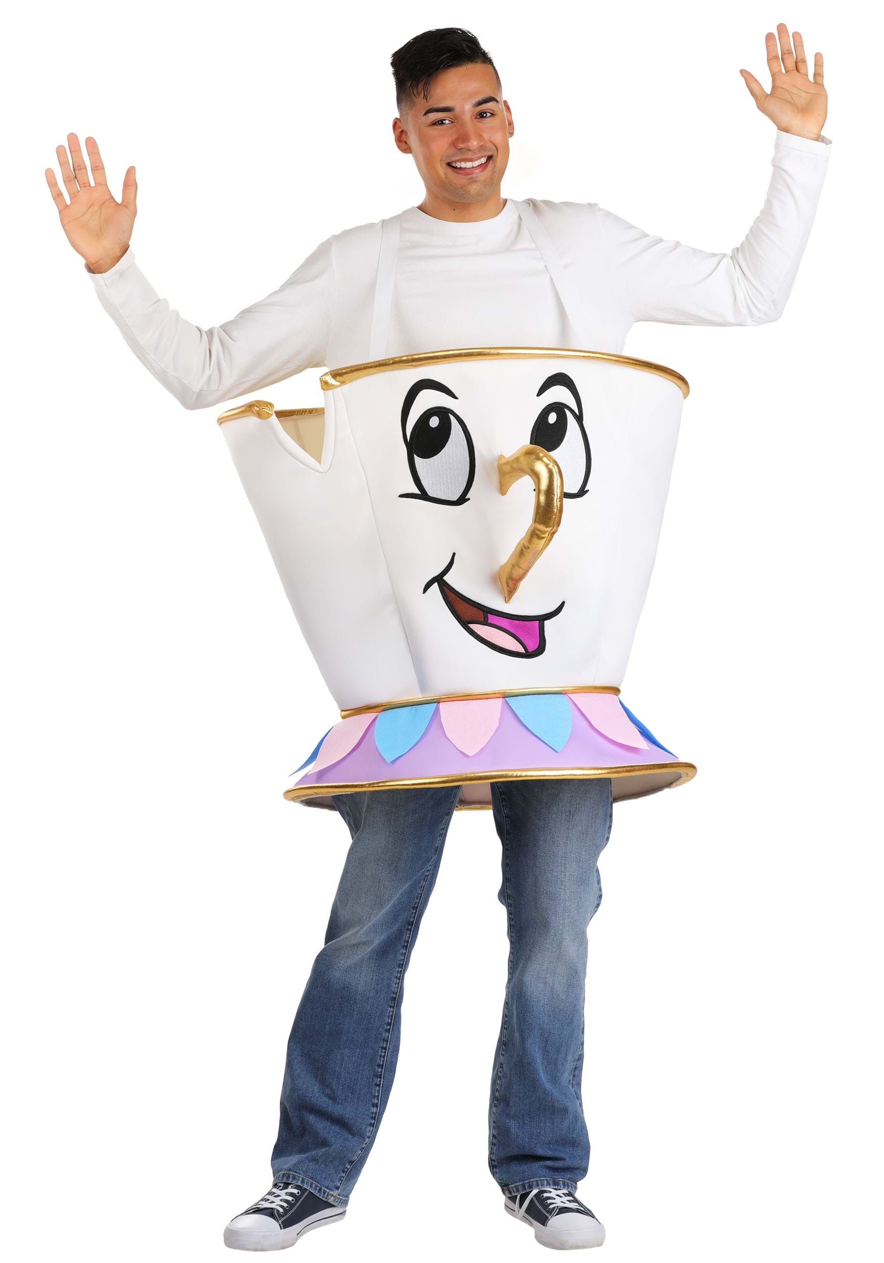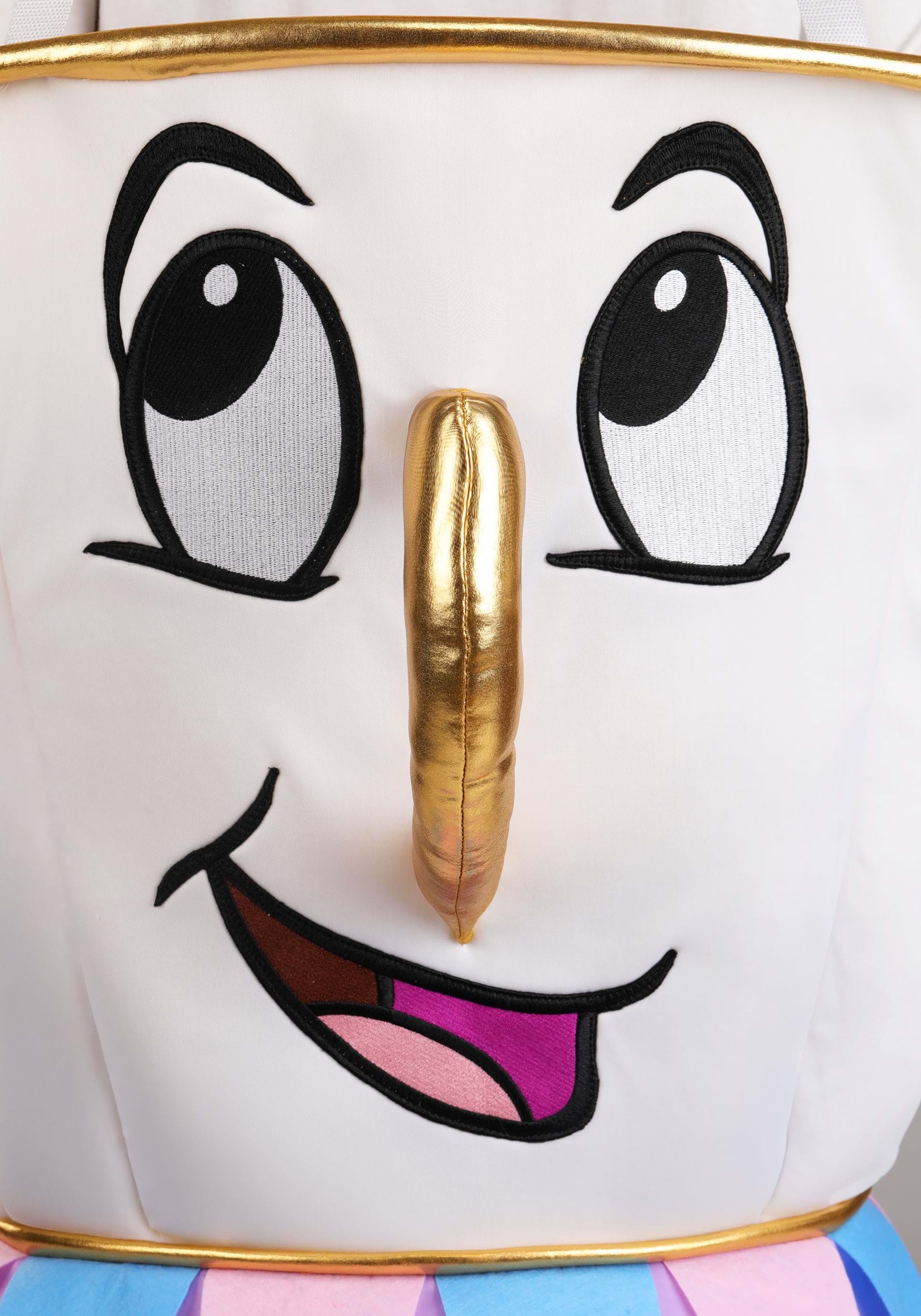 This one-piece Disney Beauty and the Beast Chip Costume is shaped like a teacup and made with a soft, foam-backed jersey construction. The lightweight material ensures a comfortable fit while still maintaining its shape. Gold trim accents the design, adding an elegant, enchanted touch. The costume stays secure with a pair of suspender-style straps that adjust for a customizable fit.
