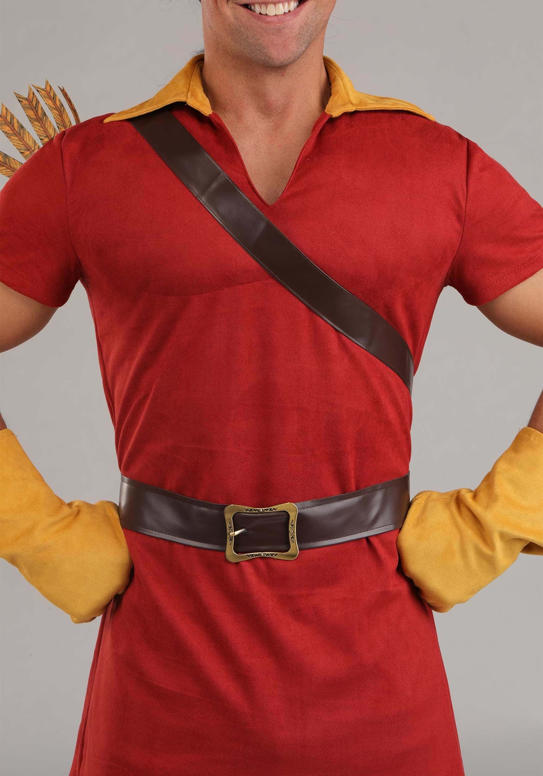 The stretch brushed suede tunic boasts padded fiberfill for Gaston's muscular shape, complete with a gold-tone collar. Next up, show off the dark jersey pants and dramatically flared gloves while your faux leather boot covers stay put with elastic support. A coordinating faux leather quiver includes sublimated feather details, and the synthetic wig sports Gaston's signature swoop and ponytail.