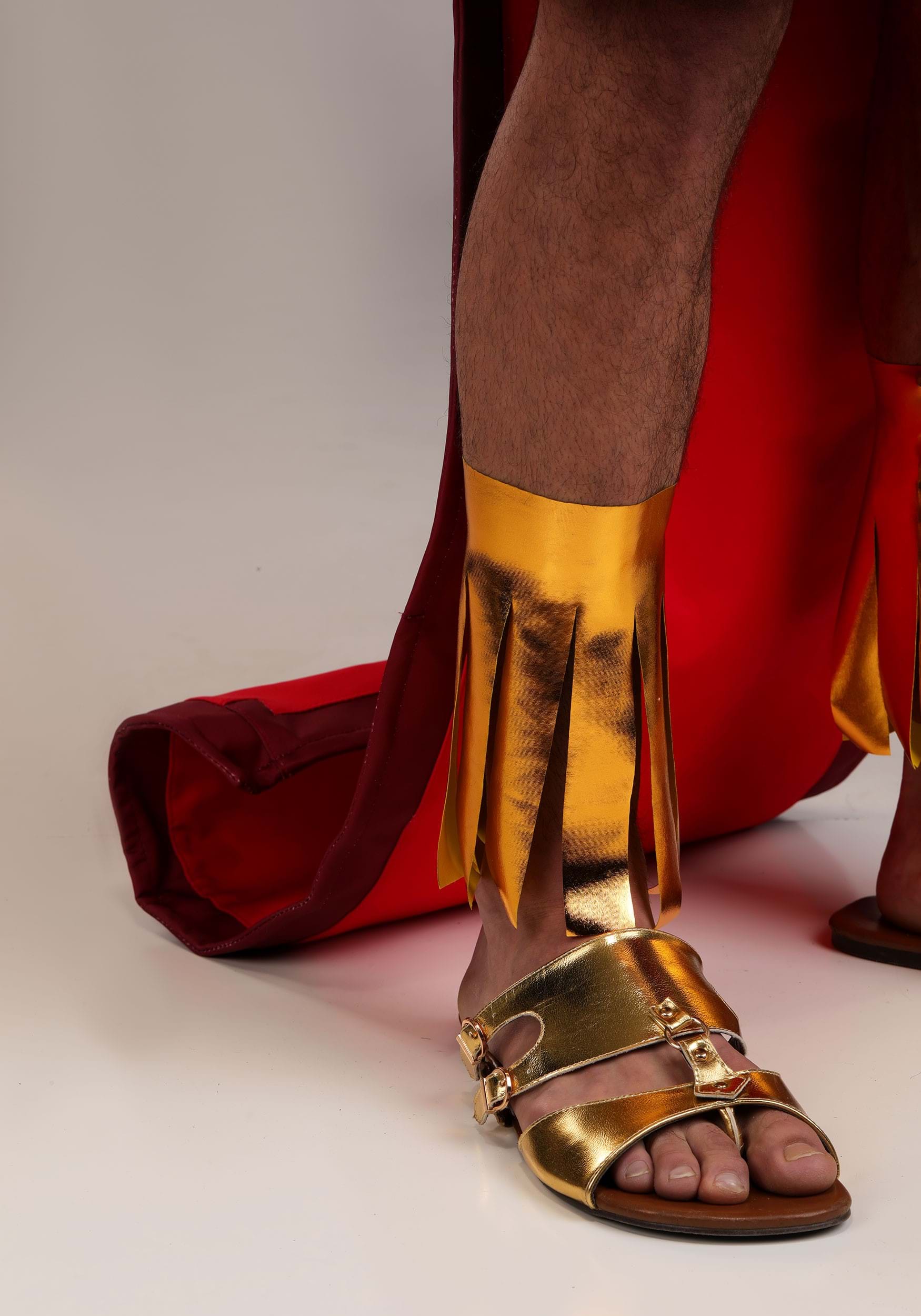 This deluxe costume features a rose-toned tunic edged in regal purple and glittering gold. A bold golden collar graces the neckline, and the tunic's sculpted train mirrors Kuzco's imperial flair. Hook-and-loop fasteners in back make for simple wear, while a matching belt with a gold-tipped end ties the look together. The metallic gold headpiece and coordinating cuffs complete this polished, perfectly pomp ensemble.