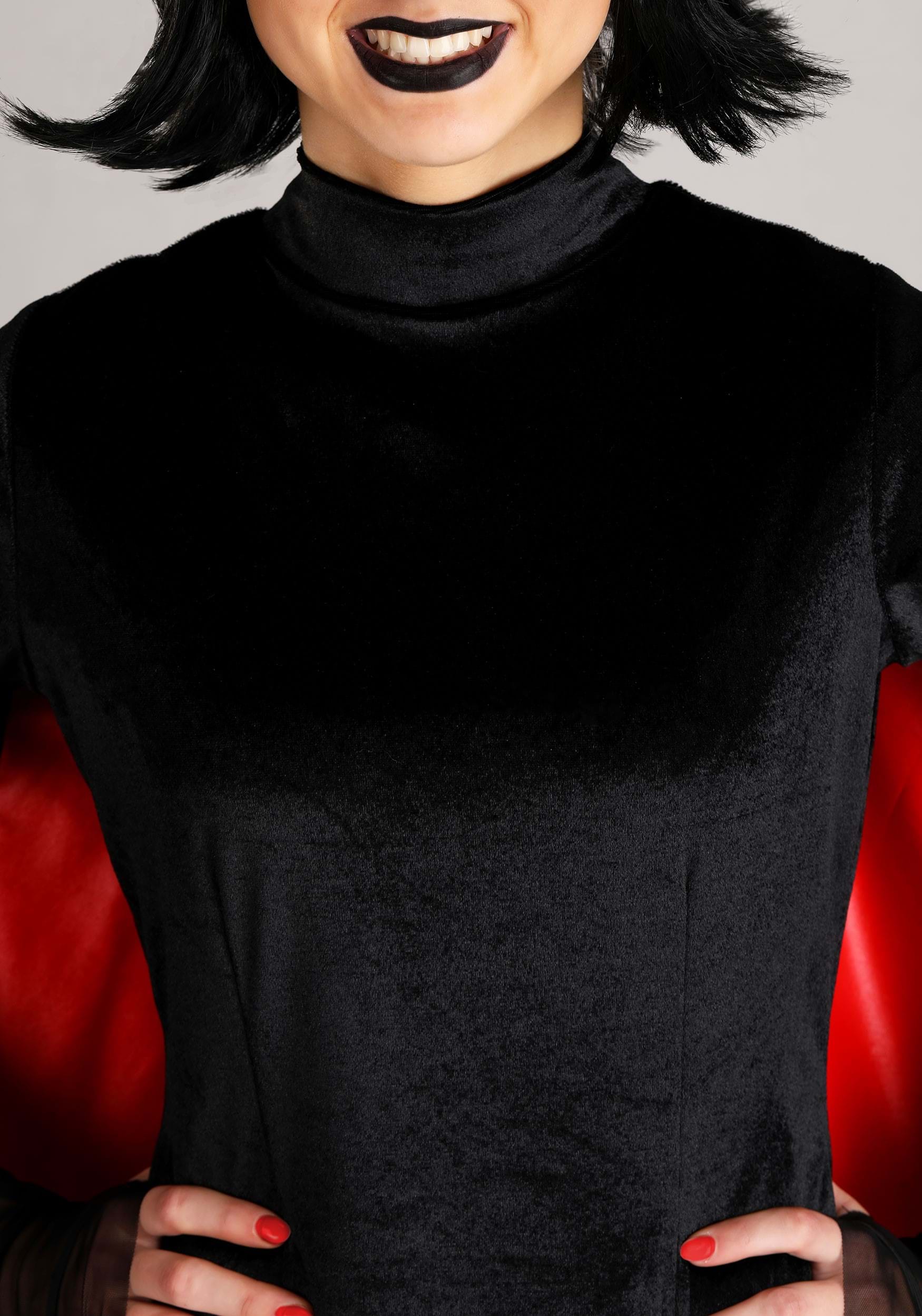 This officially licensed Deluxe Mavis Costume for adults is an exclusive design offering all the details needed to capture the iconic look of Hotel Transylvania's favorite vampire teen. Crafted from 100% polyester, the black stretch velvet dress is comfortably fitted and stylish. Its mock-neck collar plays on the classic vampire style, while its short sleeves and mid-thigh length keep it modern. A zipper down the back ensures getting dressed is easy.