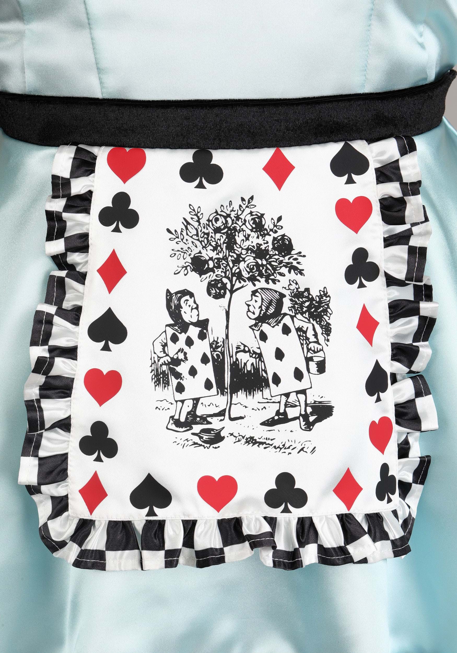 The light blue dress is crafted from heavyweight satin, giving it a structured fit and a luxurious sheen. At the bust, a black satin bow adds a dramatic accent, while the attached apron is decorated with a detailed playing card motif featuring two card soldiers at the center. A black-and-white diamond print trim lines the hem, adding a graphic punch that sets this version of Alice apart from the traditional tale.
