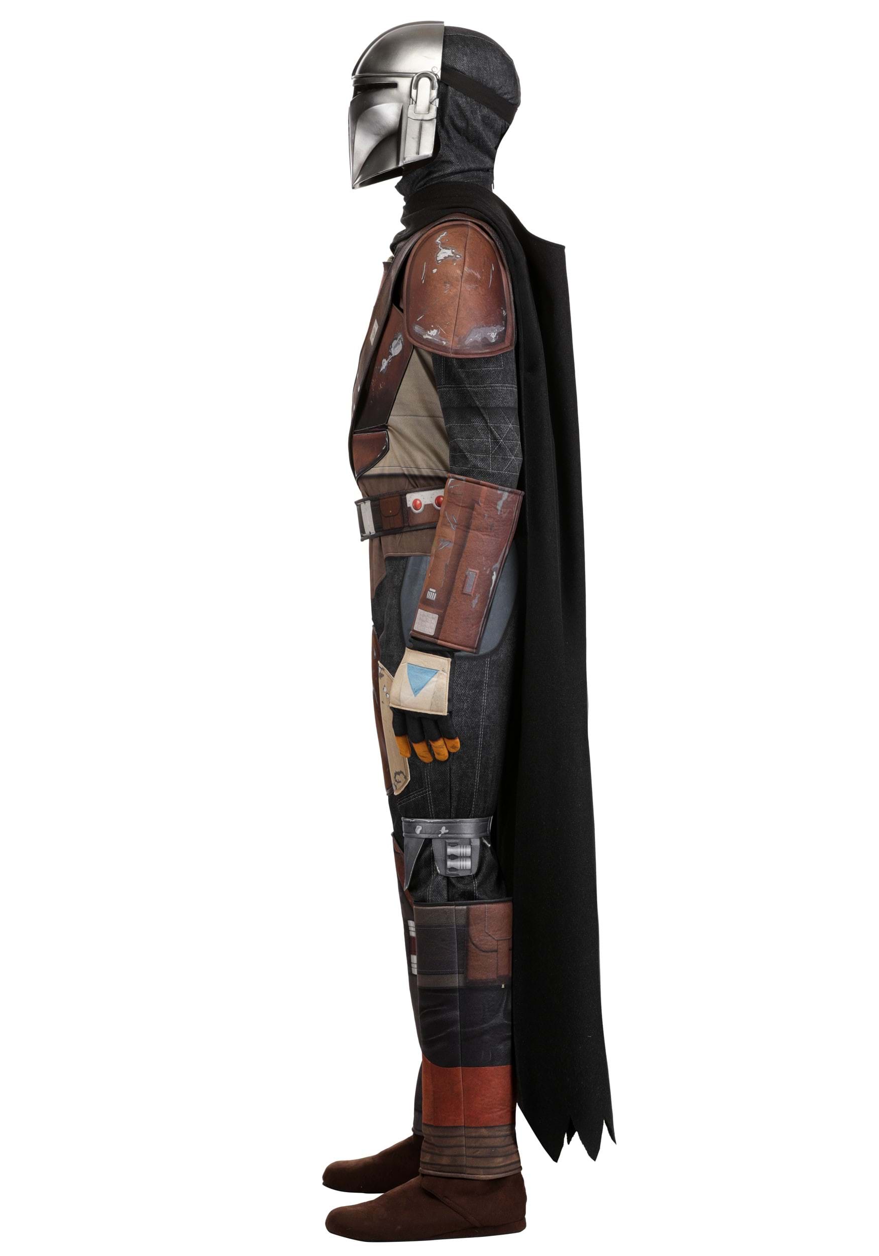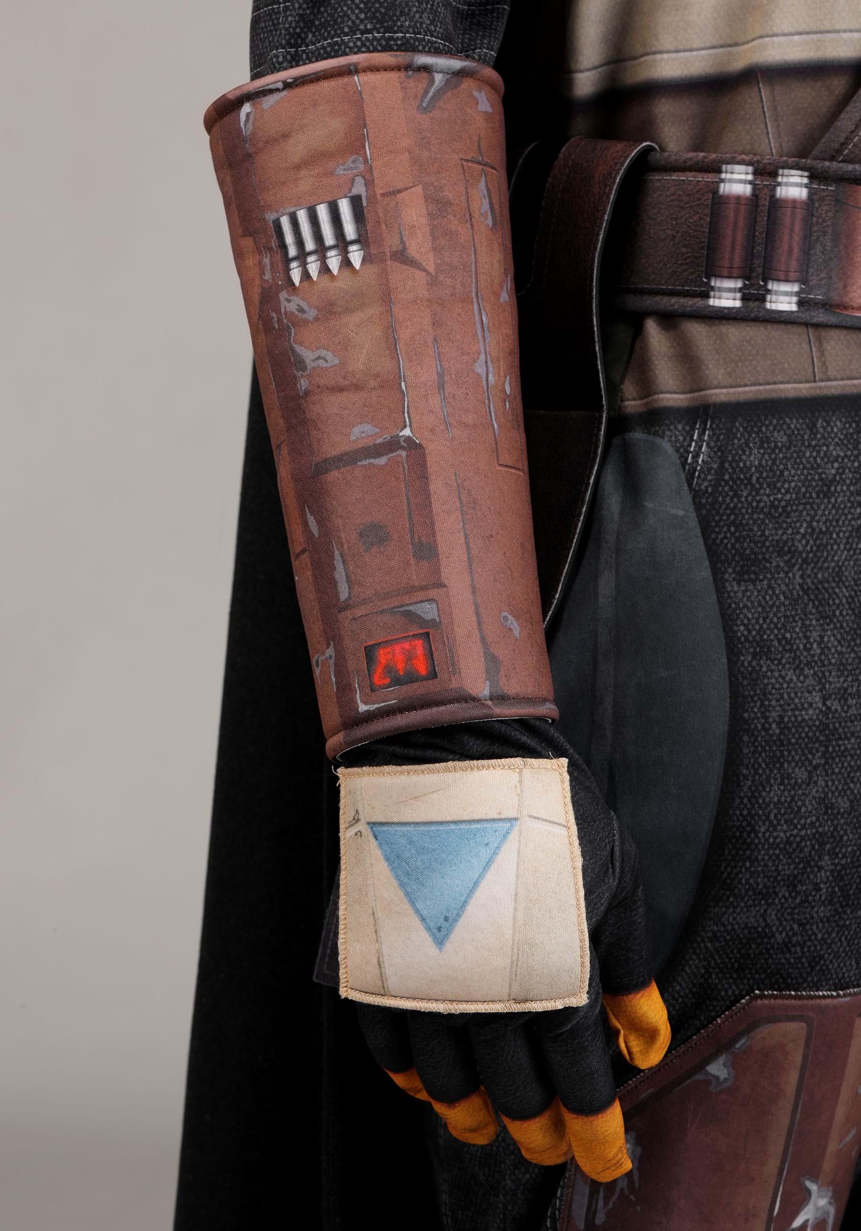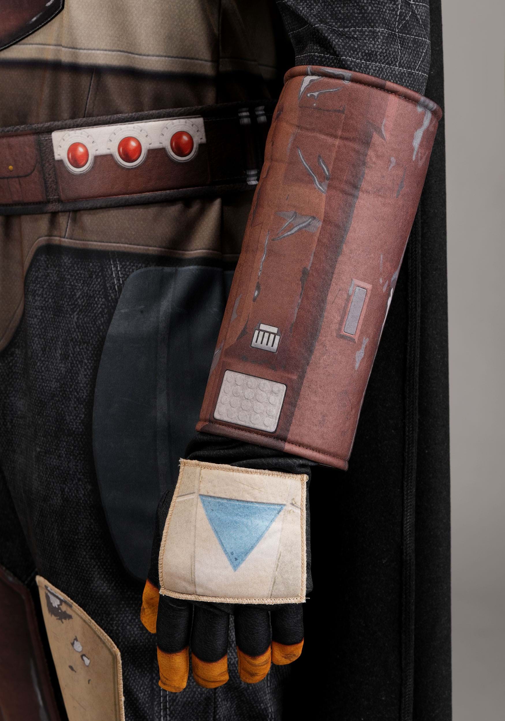 A faux leather belt harness wraps around the suit to mimic the tactical look Din wears while collecting bounties and navigating the underworld. Matching gloves finish off the outfit, designed from the same jersey material for a seamless armored appearance.