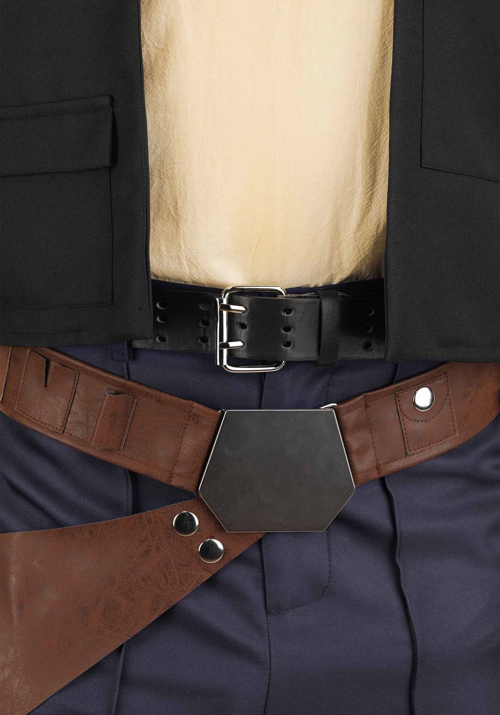 Han Solo's unmistakable gear includes two belts: a classic faux leather waist belt with a metal buckle, and a matching utility belt that wraps around the waist and thigh. The utility belt is designed to echo the look of his holster rig, lending an air of action-ready readiness to the ensemble.