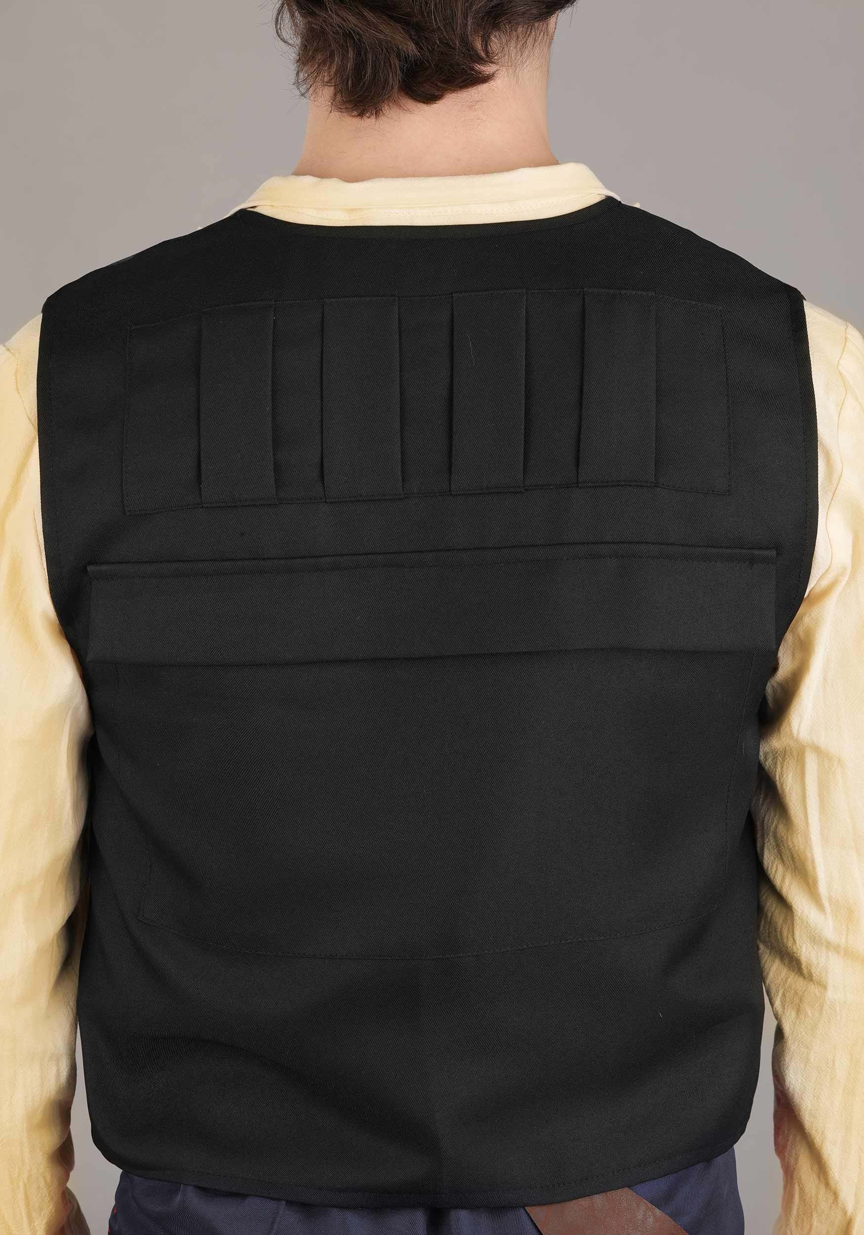The cream-colored shirt sets the tone with a breezy linen-blend fabric and a daring deep V-neck cut, straight from Han's unforgettable look aboard the Millennium Falcon. It pairs perfectly with the dark black vest, which features an open front, subtle texture, and real, functional pockets, which are ideal for stashing credits, spare tools to fix the hyperdrive, or a quick escape plan.