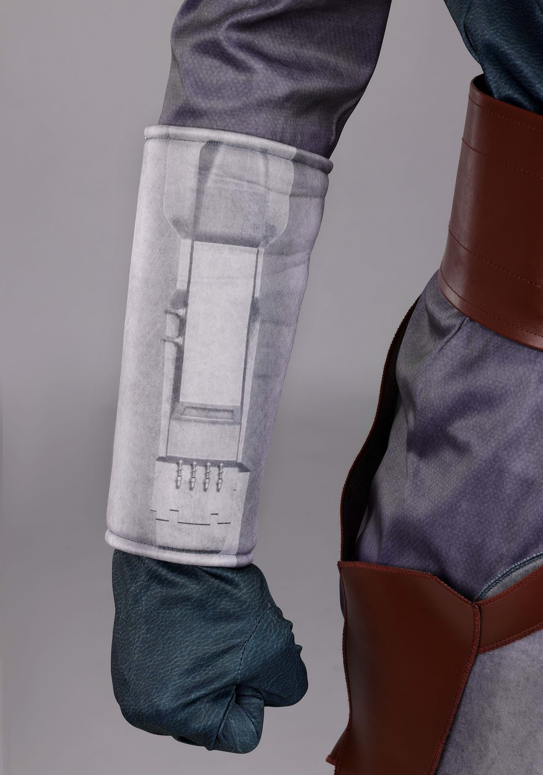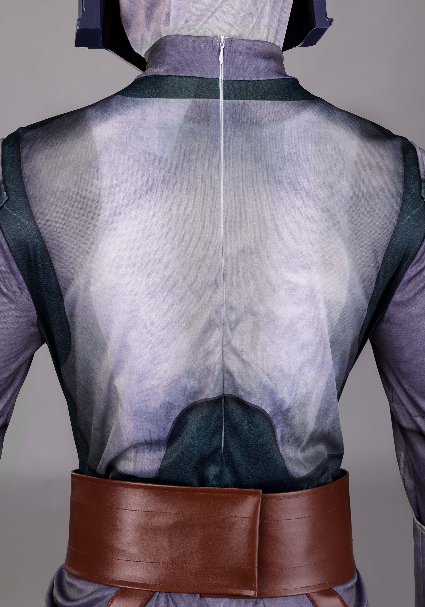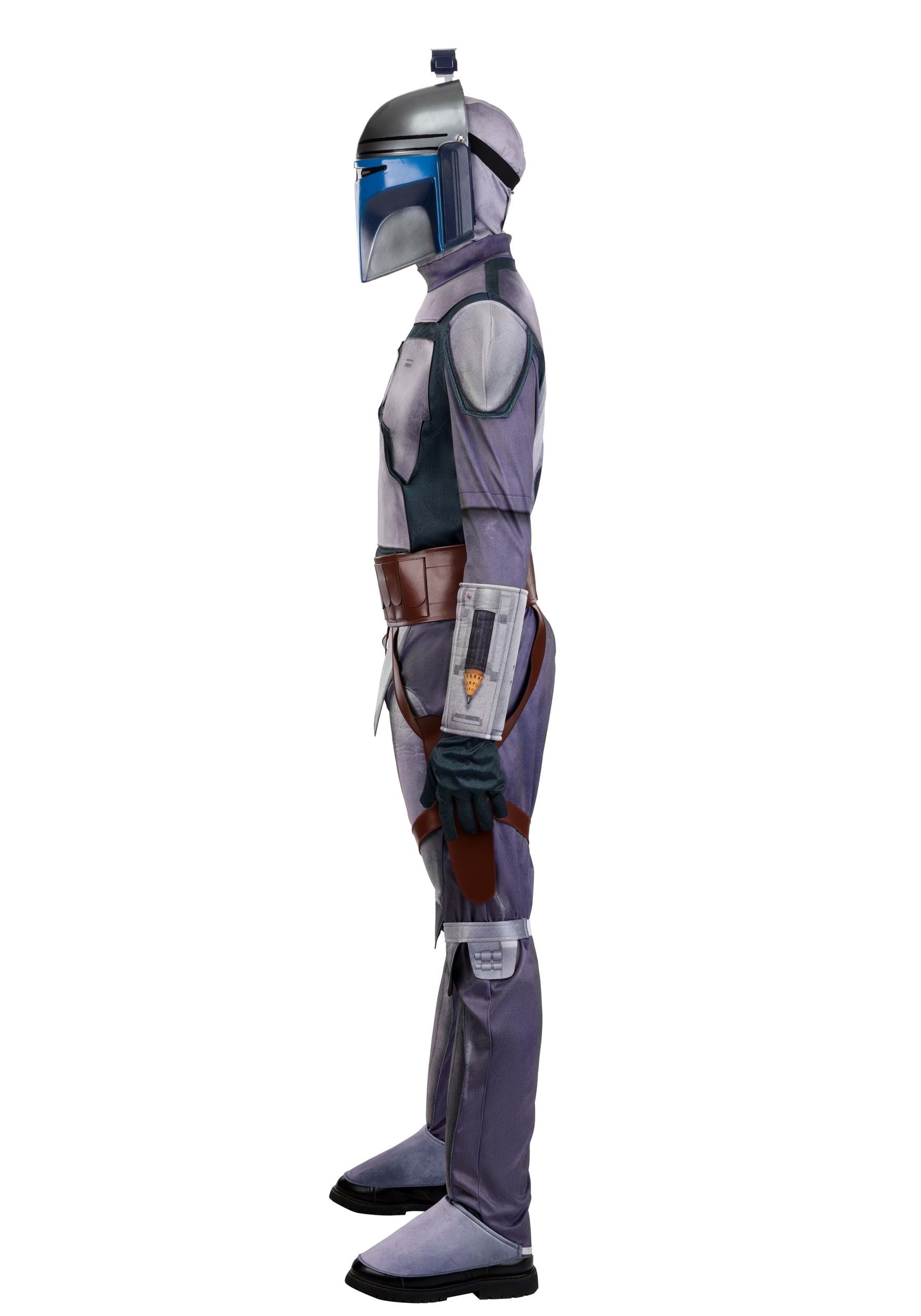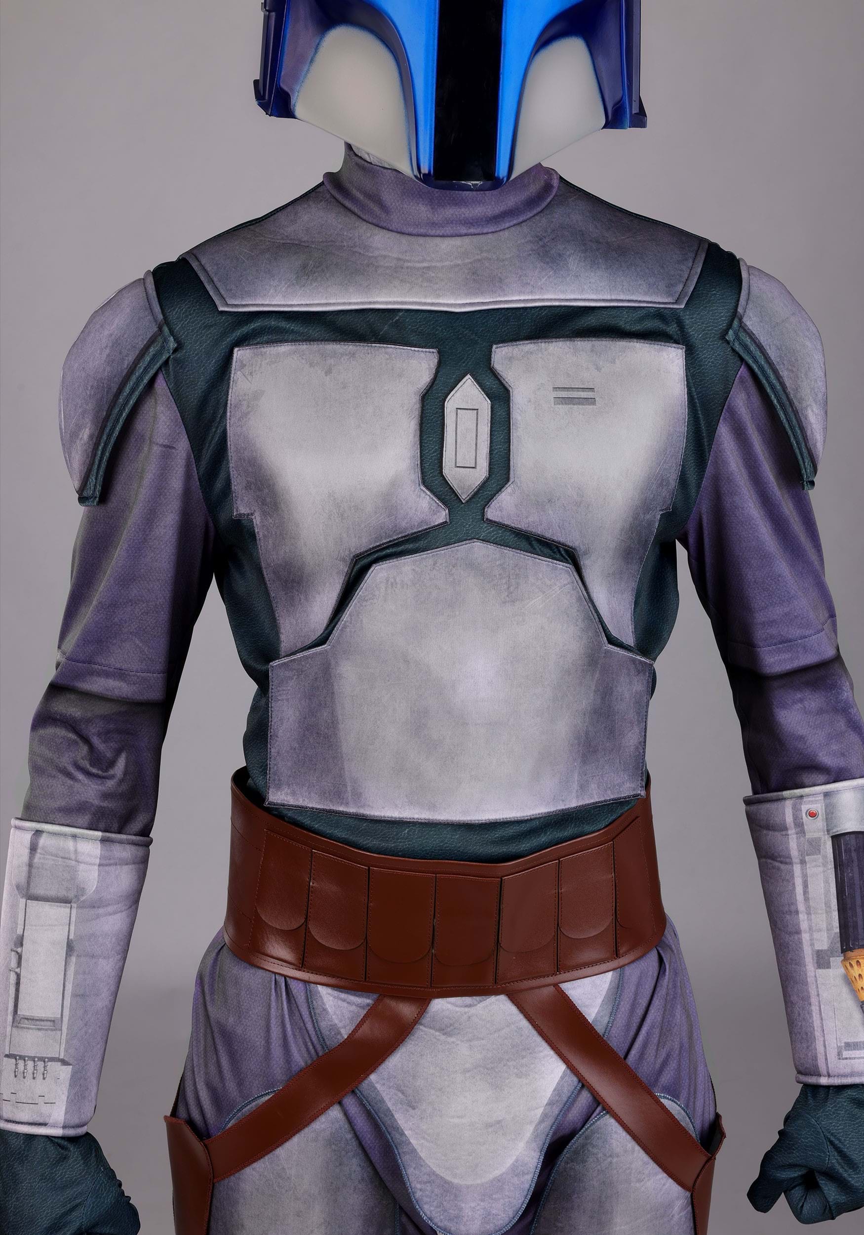 Crafted from soft jersey material, the jumpsuit offers the look of battle-worn armor without the bulk. Printed detailing throughout the suit recreates the steel-blue plating of Jango's gear, while strategically placed foam backing in the chest, legs, and sleeves adds dimension—mimicking molded armor and giving you the heroic stature of a seasoned warrior.