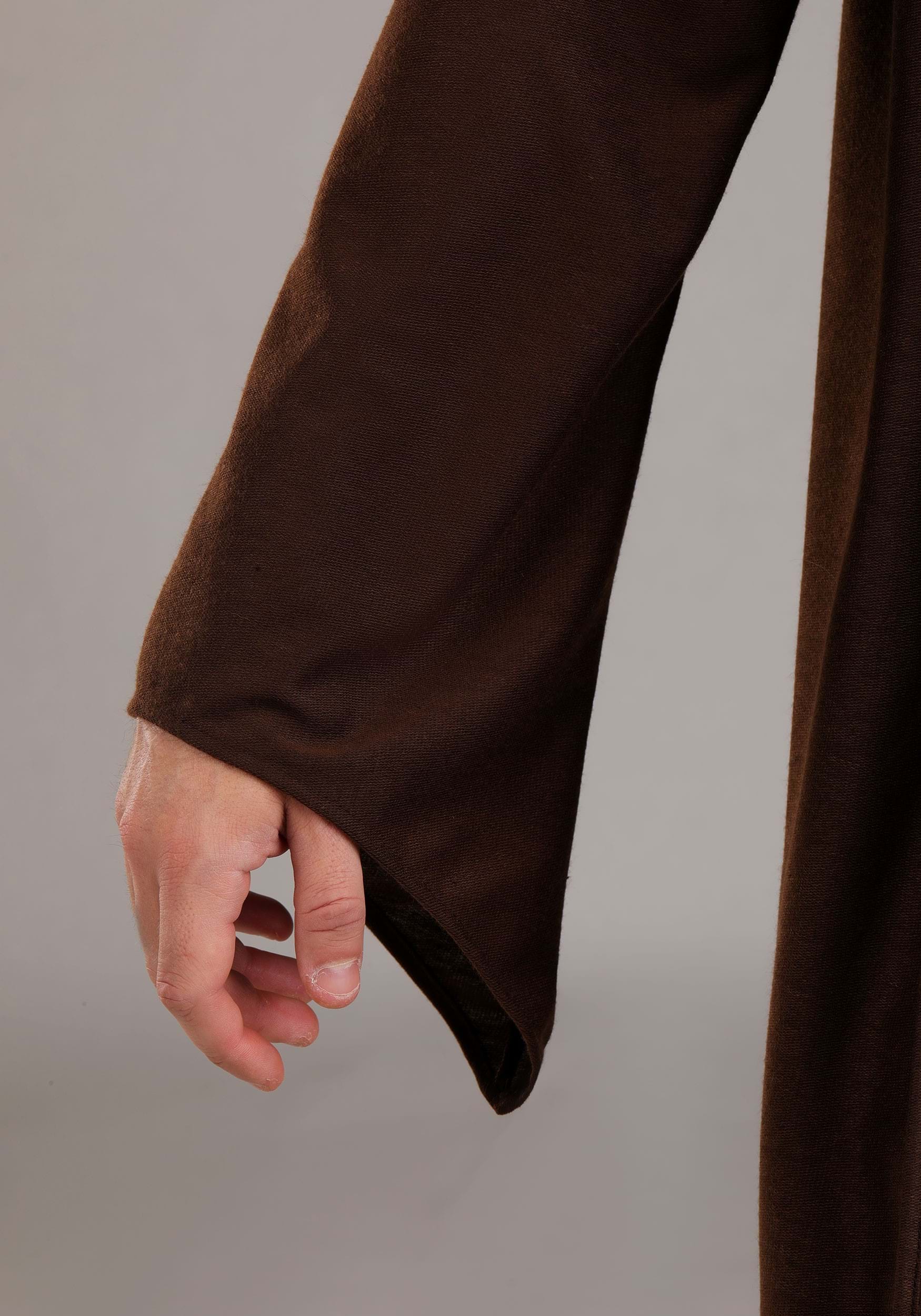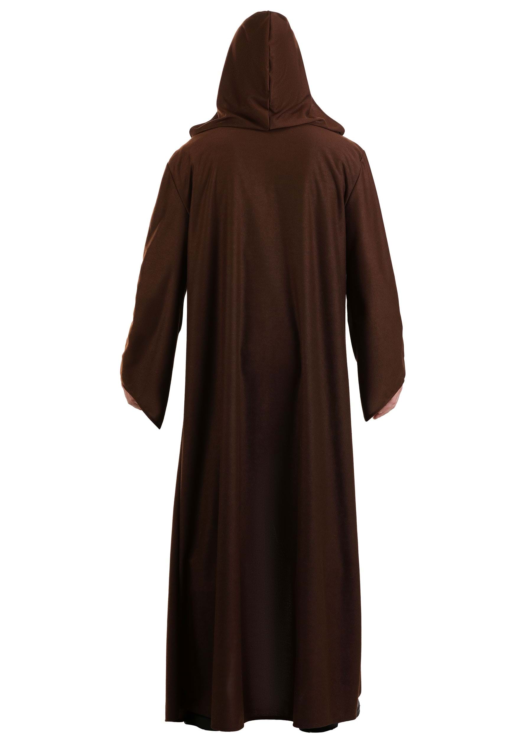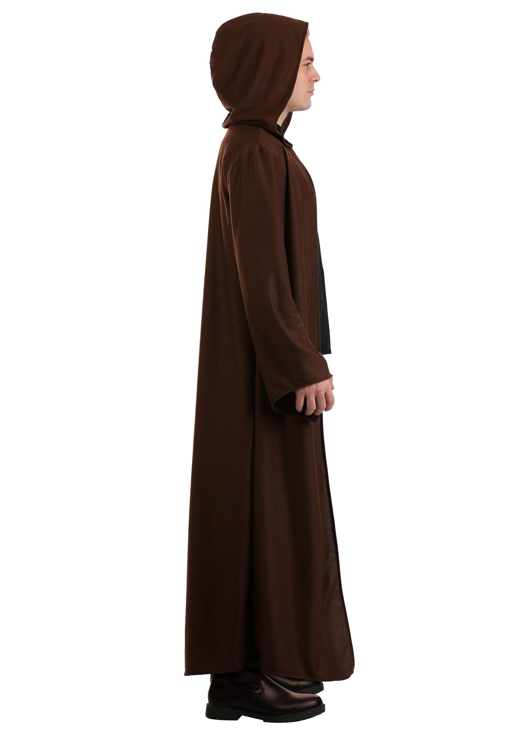Crafted from dark brown jersey fabric, the robe drapes with dramatic weight and movement, capturing the quiet gravitas of a warrior-monk bound by purpose. Its oversized hood falls deep over the brow, concealing the eyes in solemn reflection or when preparing for a sudden, lightsaber reveal.