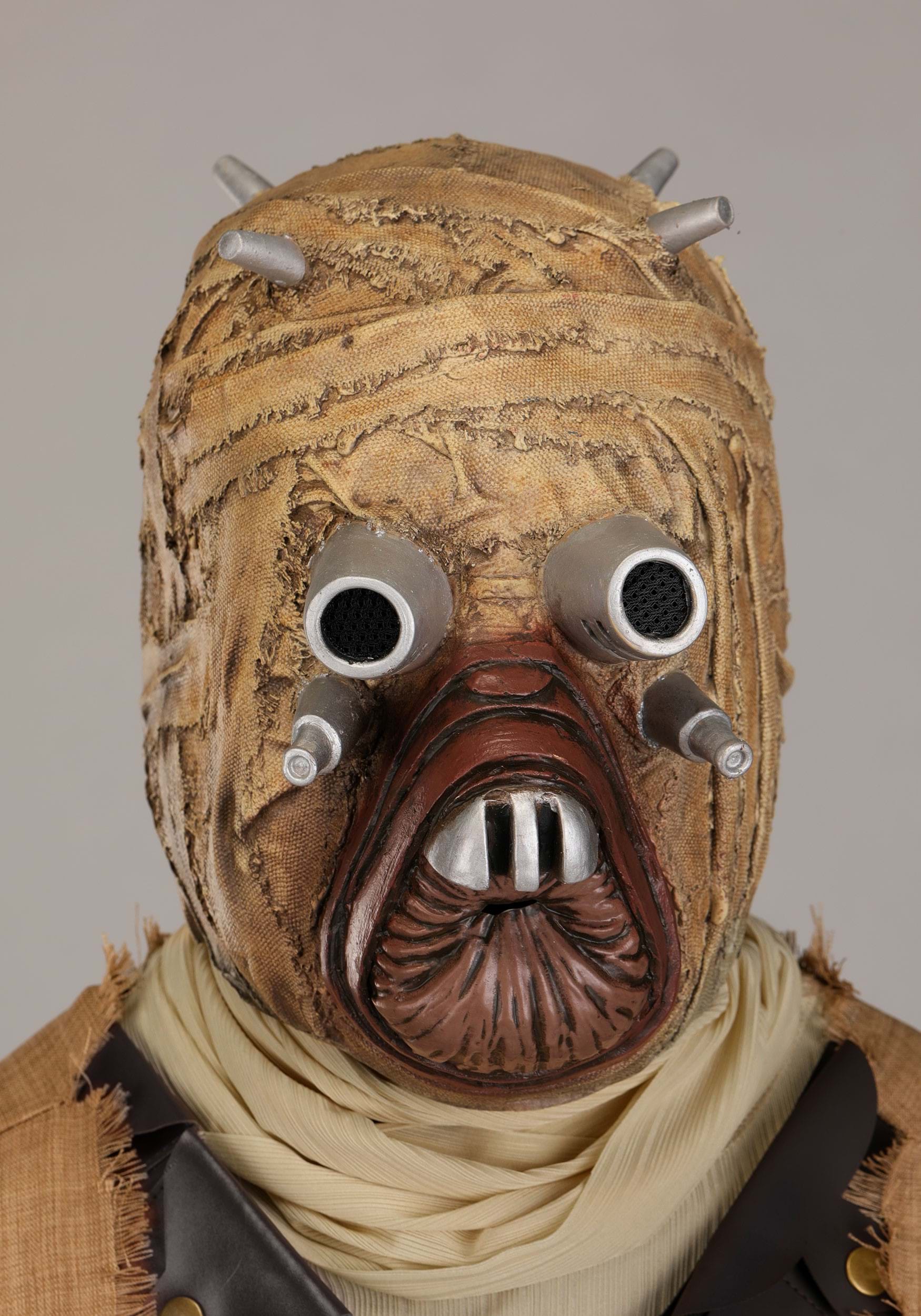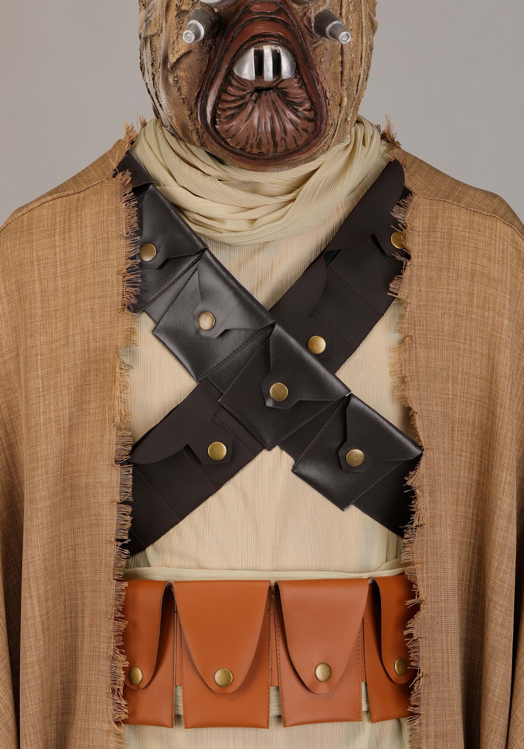 The included latex mask brings the eerie Tusken Raider visage to life with molded goggle lenses, metal-look details, and dimensional snout. Carefully placed woven fabric strips give the headpiece its unmistakable wrapped pattern, creating a tactile, lived-in effect. It pairs perfectly with the matching scarf and sash to cover the neck and shoulders for a complete transformation.