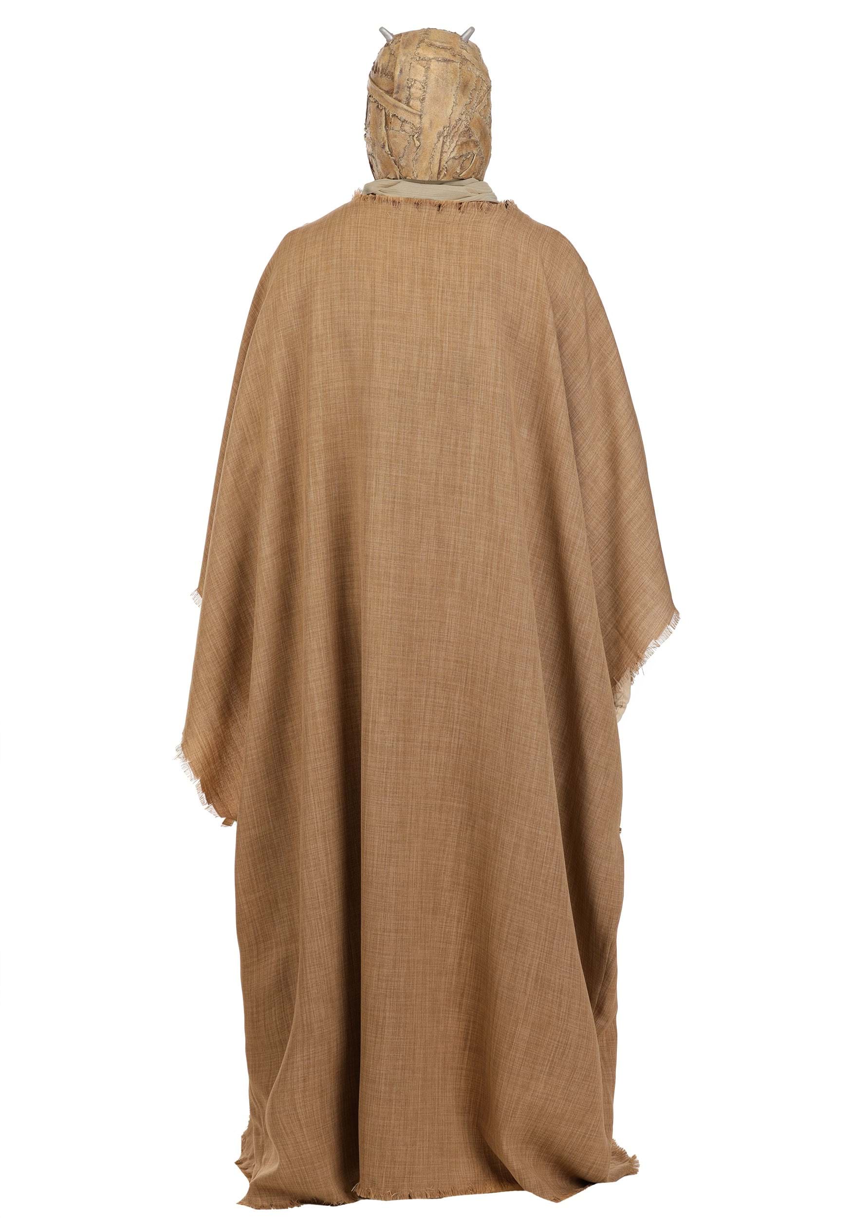 The foundation of the costume is a long, crinkle-woven robe with raw edges that hang rough and authentic, just like a true Tusken's survival-worn clothing. Layered over top is a boucle-textured cloak with wide sleeves and tattered hems, adding weight and texture to the silhouette. Together, these pieces create a windswept, weather-beaten appearance that looks right at home under twin suns.