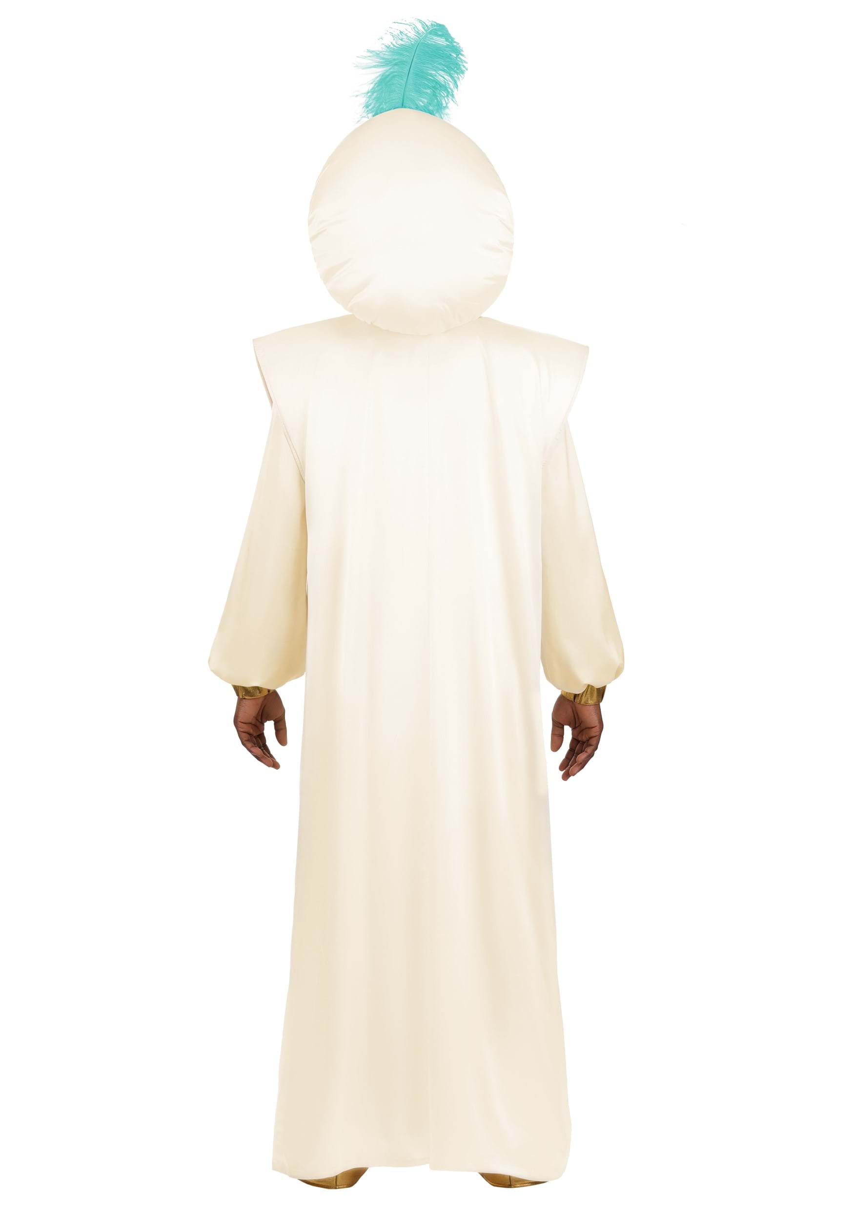 This Made By Us design includes a matte satin robe with metallic lamé accents and padded shoulders for a majestic silhouette. The turban, made of satin and lamé, is topped with a faux feather and jewel for royal flair. Complete with a satin shirt, elastic-waist pants with attached sash, and metallic shoe covers, it's a perfect choice for any Disney fan!