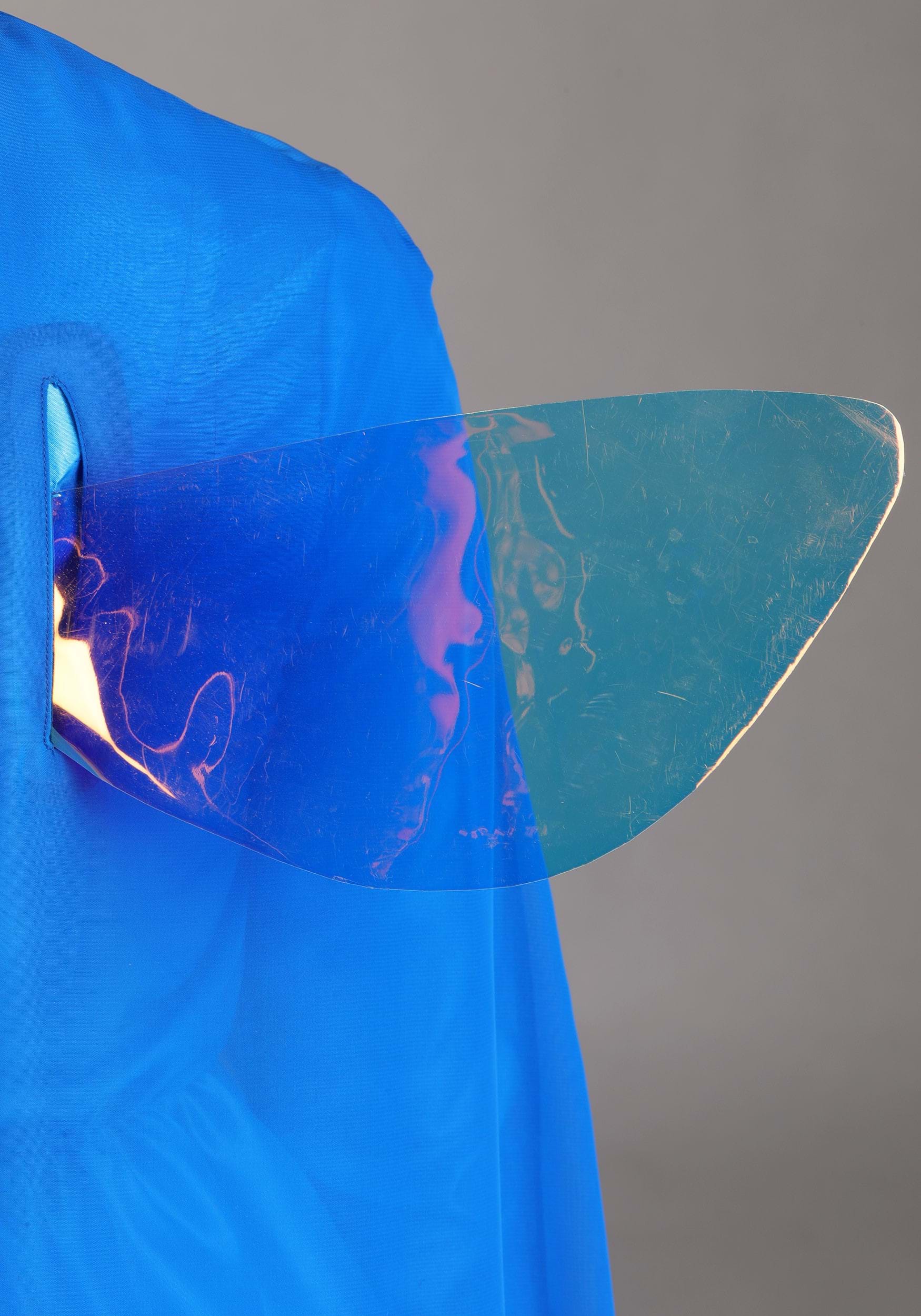 A shimmering blue taffeta dress with long, fitted sleeves, a princess seamed bodice, glittery filigree print details, and a simple zipper closure sets the tone for this Made By Us costume. Bringing whimsical movement to the costume is a lightweight chiffon cape that closes in the front with a faux gem fastener at the base of its high tulle collar. Snap-on iridescent vinyl wings and a chiffon-wrapped taffeta hat completes the look.
