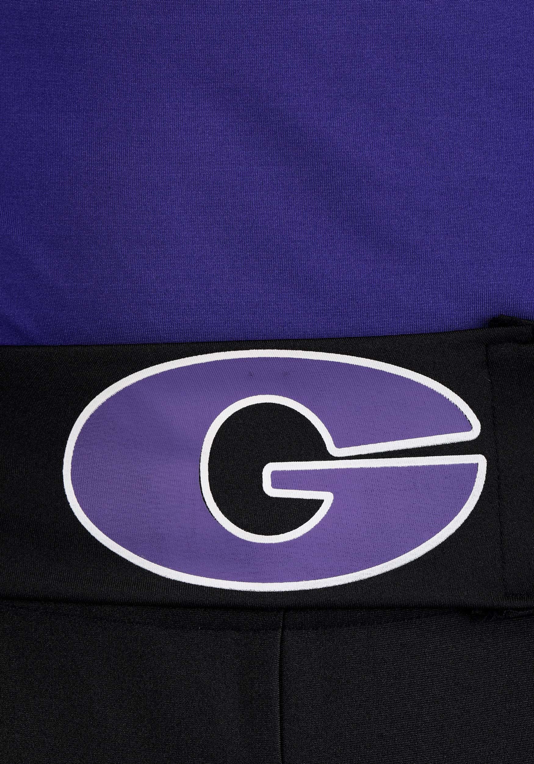 The stretchy spandex purple shirt is comfortable for all-night wear, with a bold embroidered cobra on the chest to show off your team pride. The black spandex pants, complete with purple printed graphics, have an elastic waistband for easy movement.