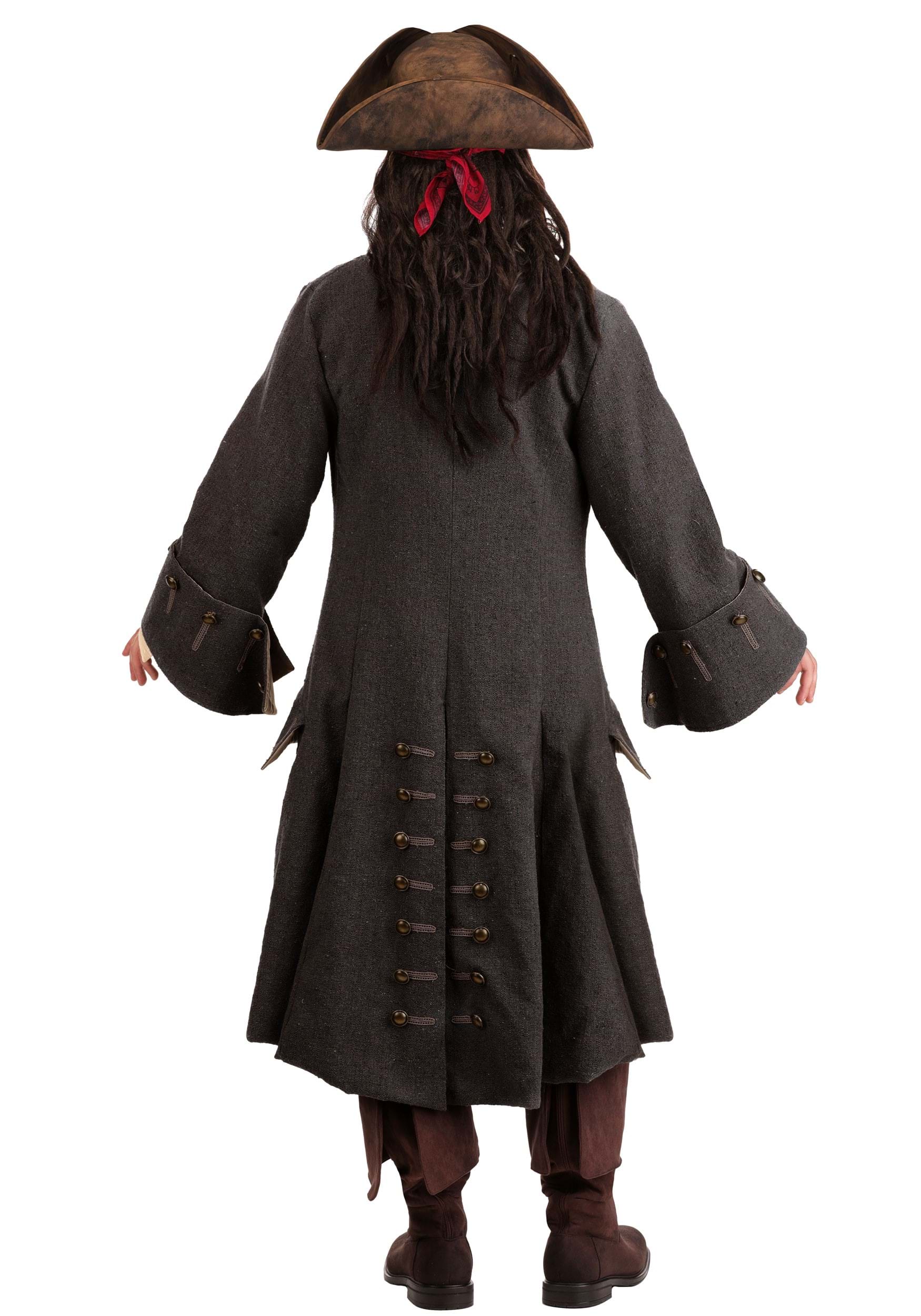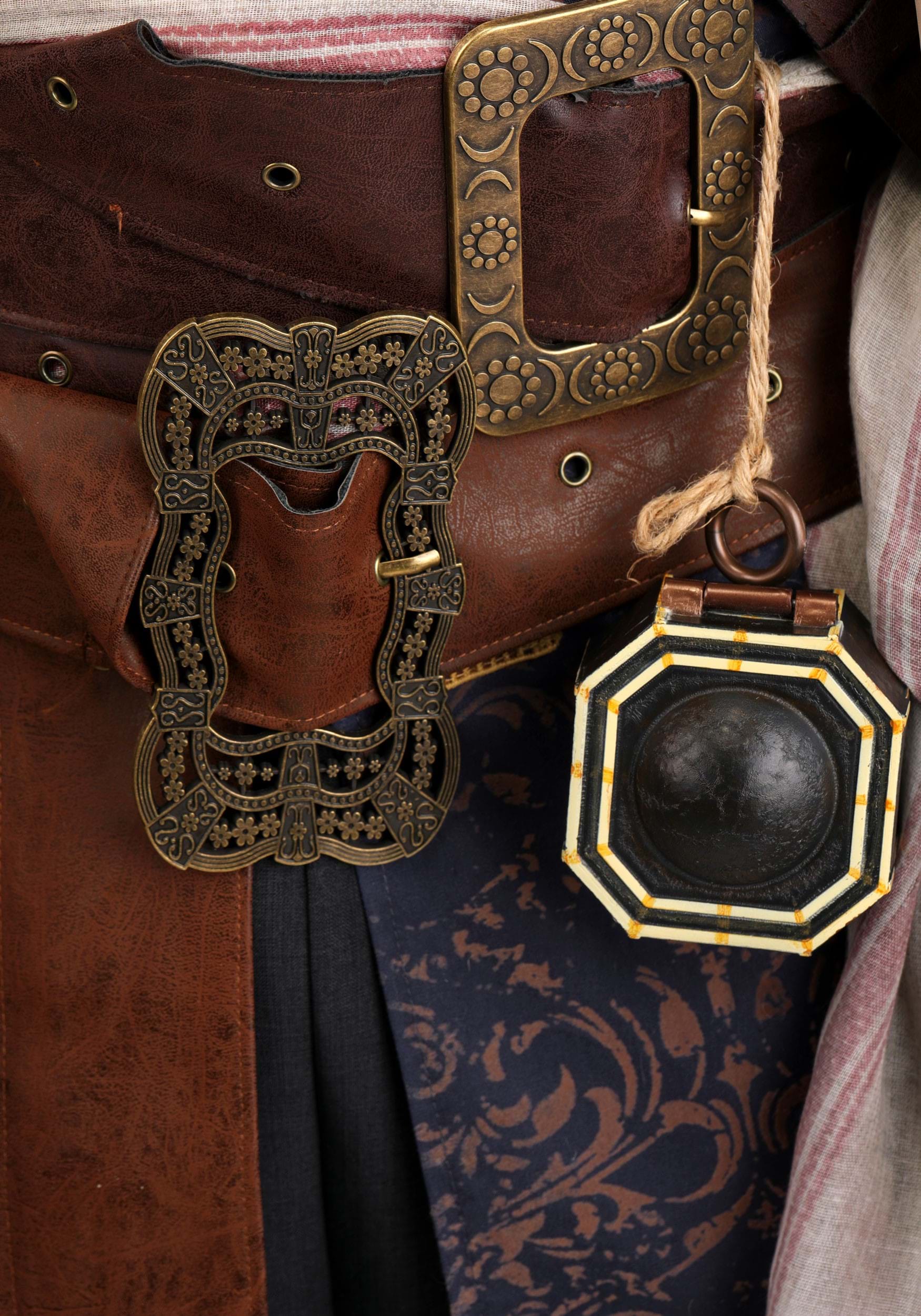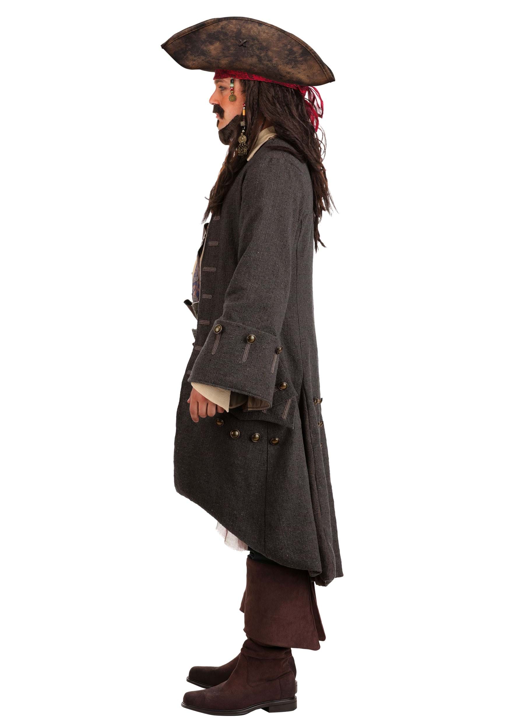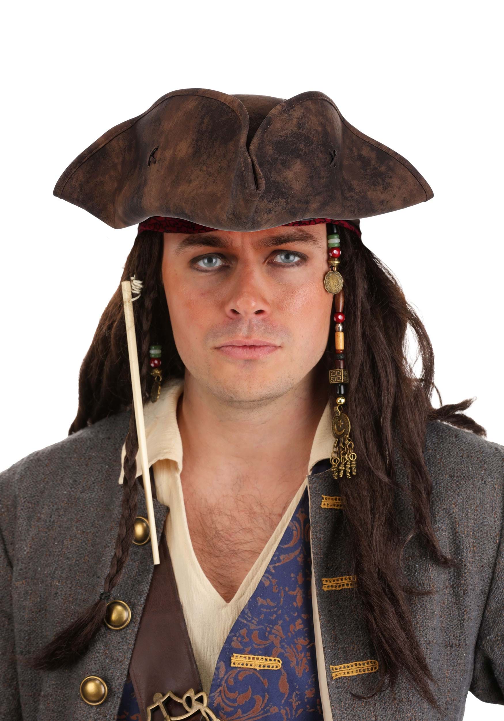 The classic tricorn hat and printed stretch bandana with bead clips top off the authentic Jack Sparrow style, further accented by a long sash with raw edges and four distinct faux leather belts (each with their own textures and buckles). The detailed compass accessory and wearable braided facial hair complete this swashbuckling ensemble.
