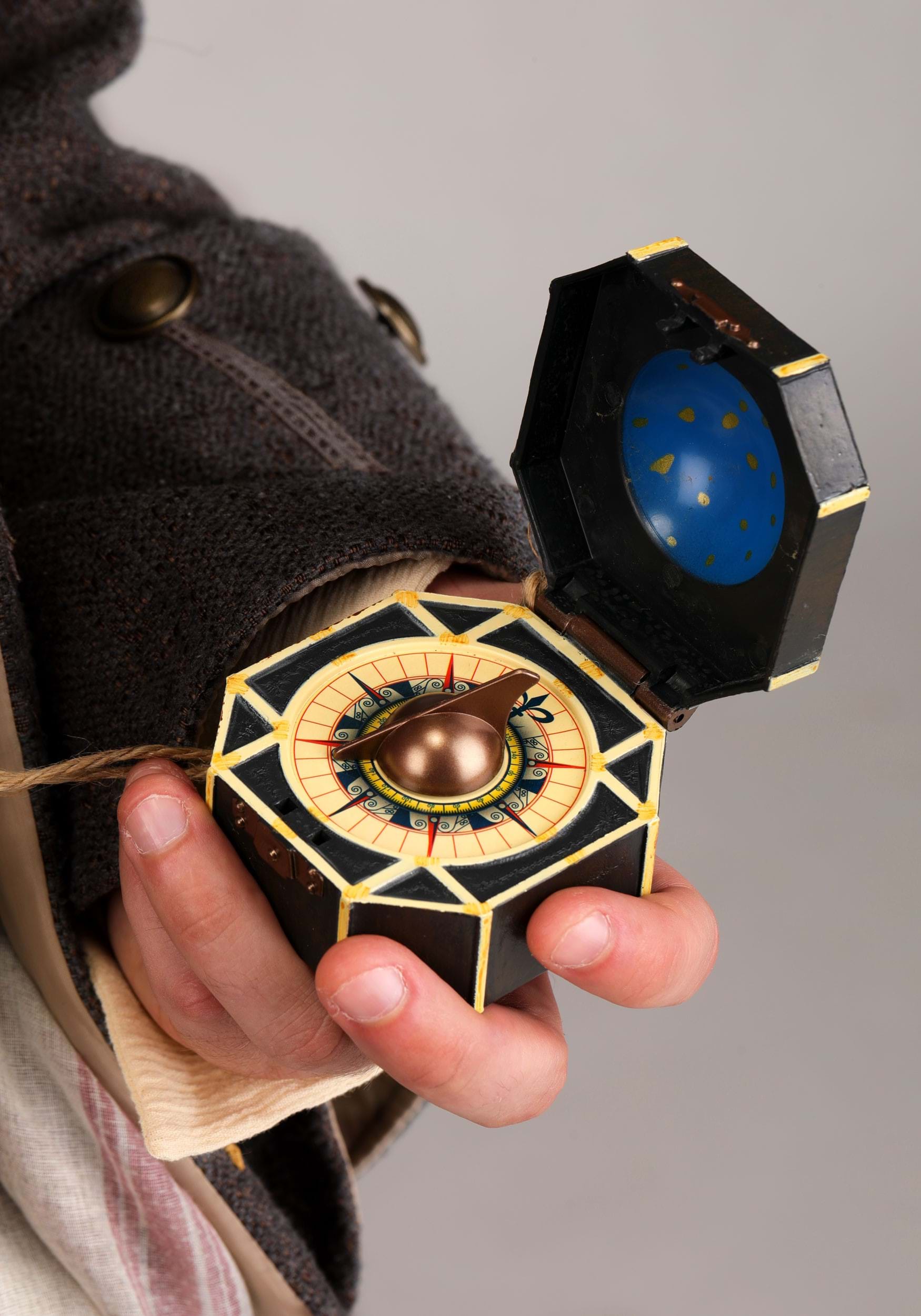 - Plastic compass has moving parts, faux rawhide cord