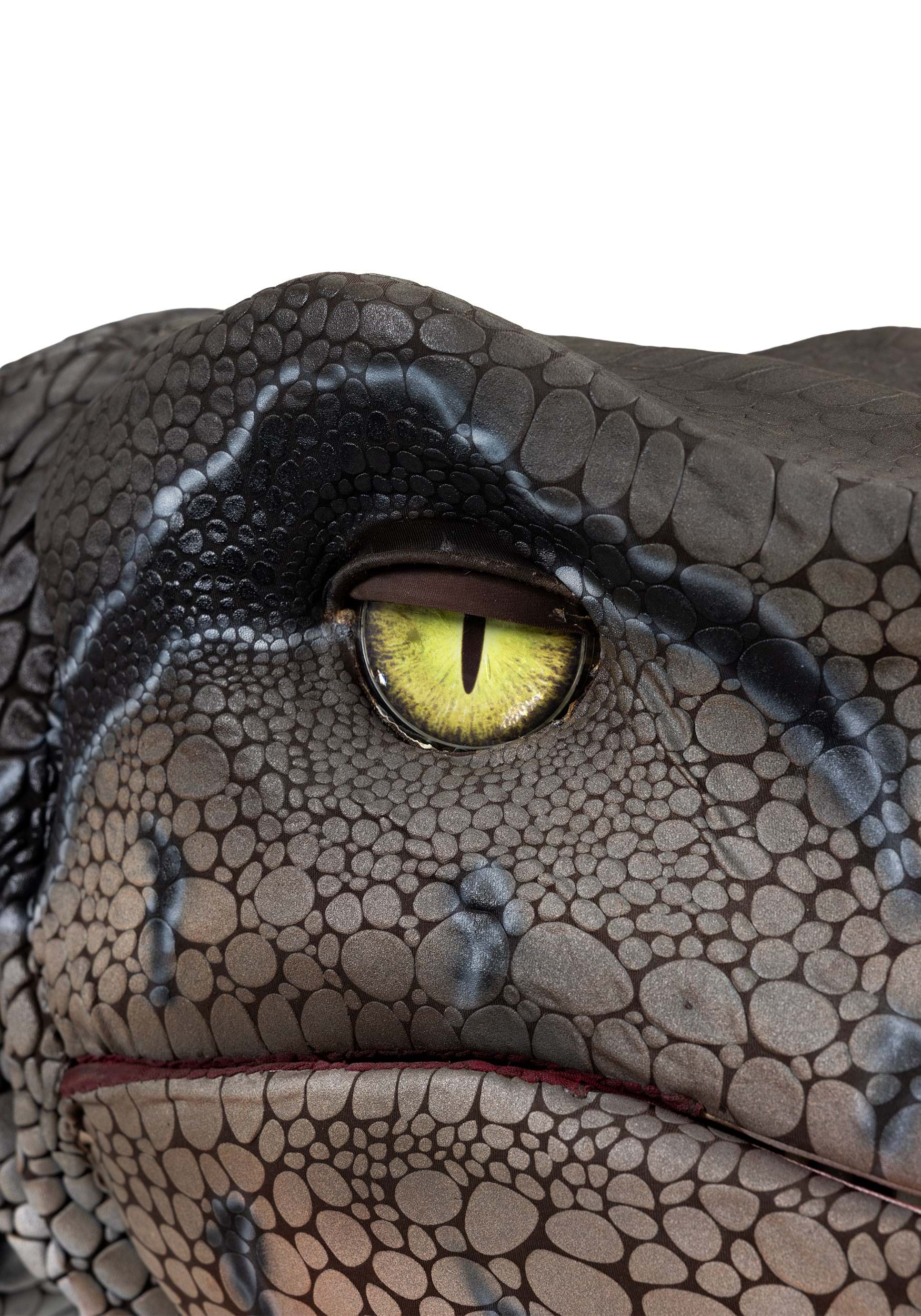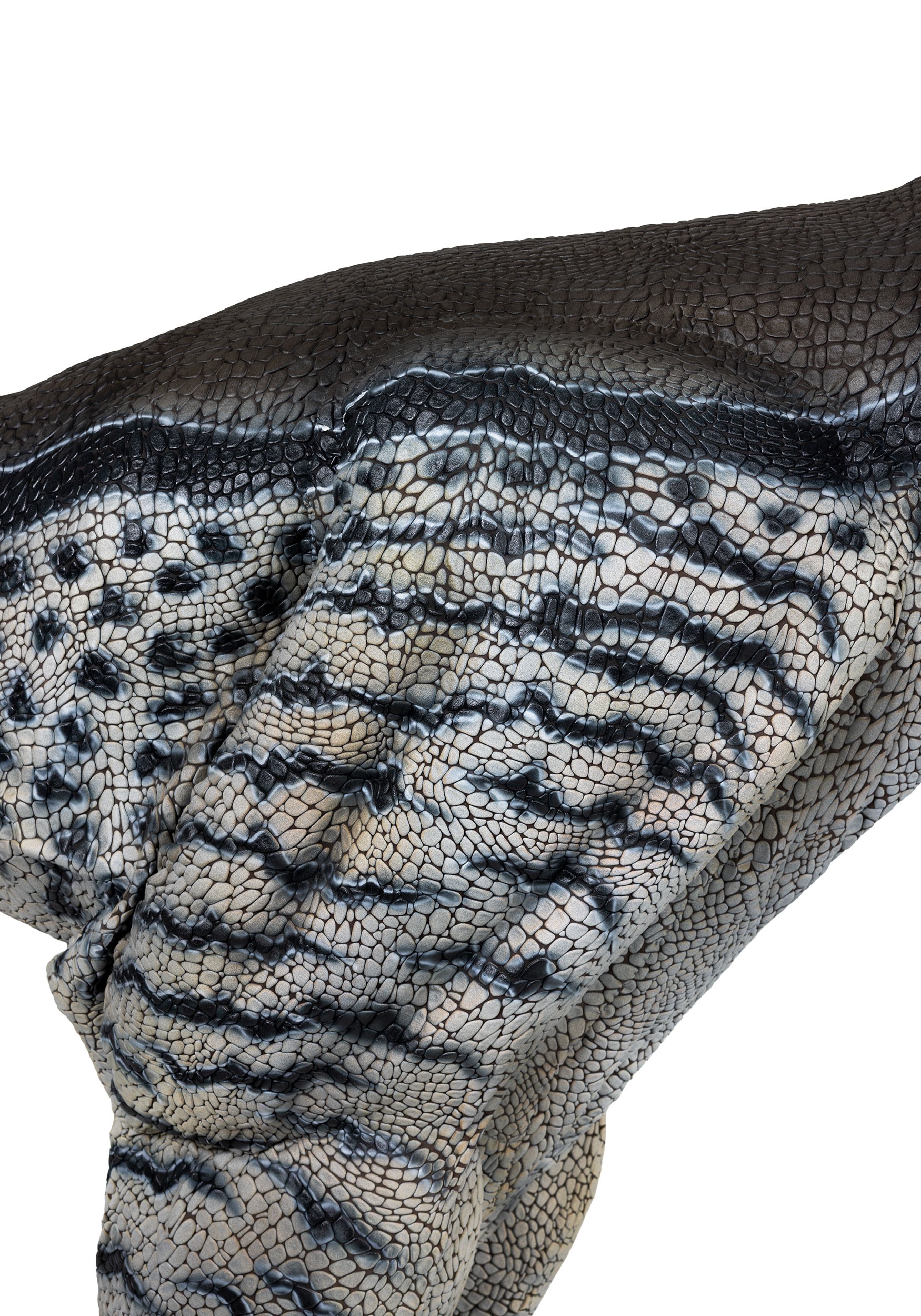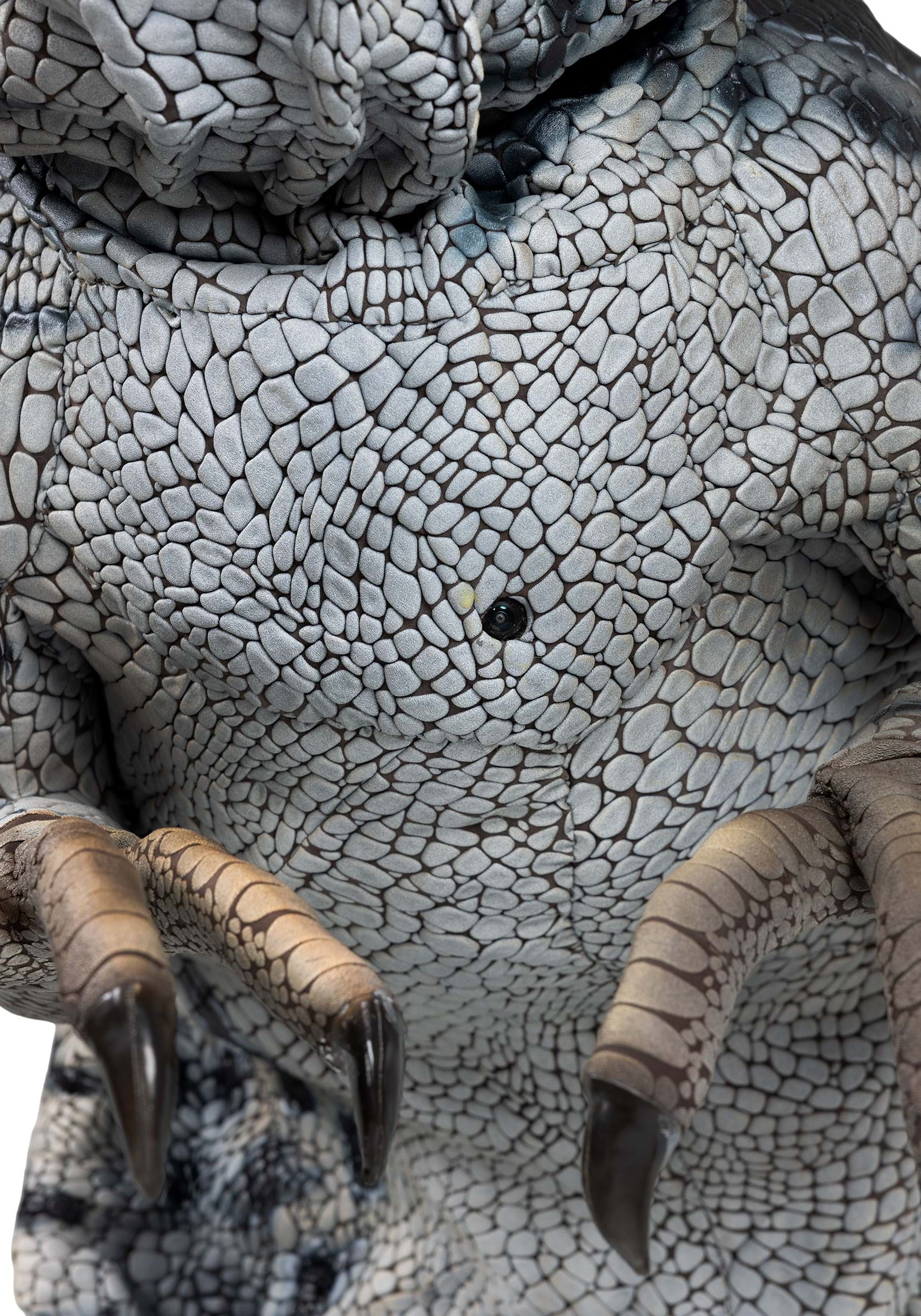 The exterior features a textured, vinyl-like skin layered over a thick foam interior, giving the body its muscular bulk and convincing mass. Sculpted contours ripple along the legs, torso, and tail, while thick plastic teeth and a foam tongue fill the snarling mouth with visceral realism. Stretchy fabric interior cheeks allow the jaw to open and close smoothly without breaking the illusion. Vinyl foam talons cap the feet, grounding the creature with a heavy, clawed stance that feels powerful and authentic.