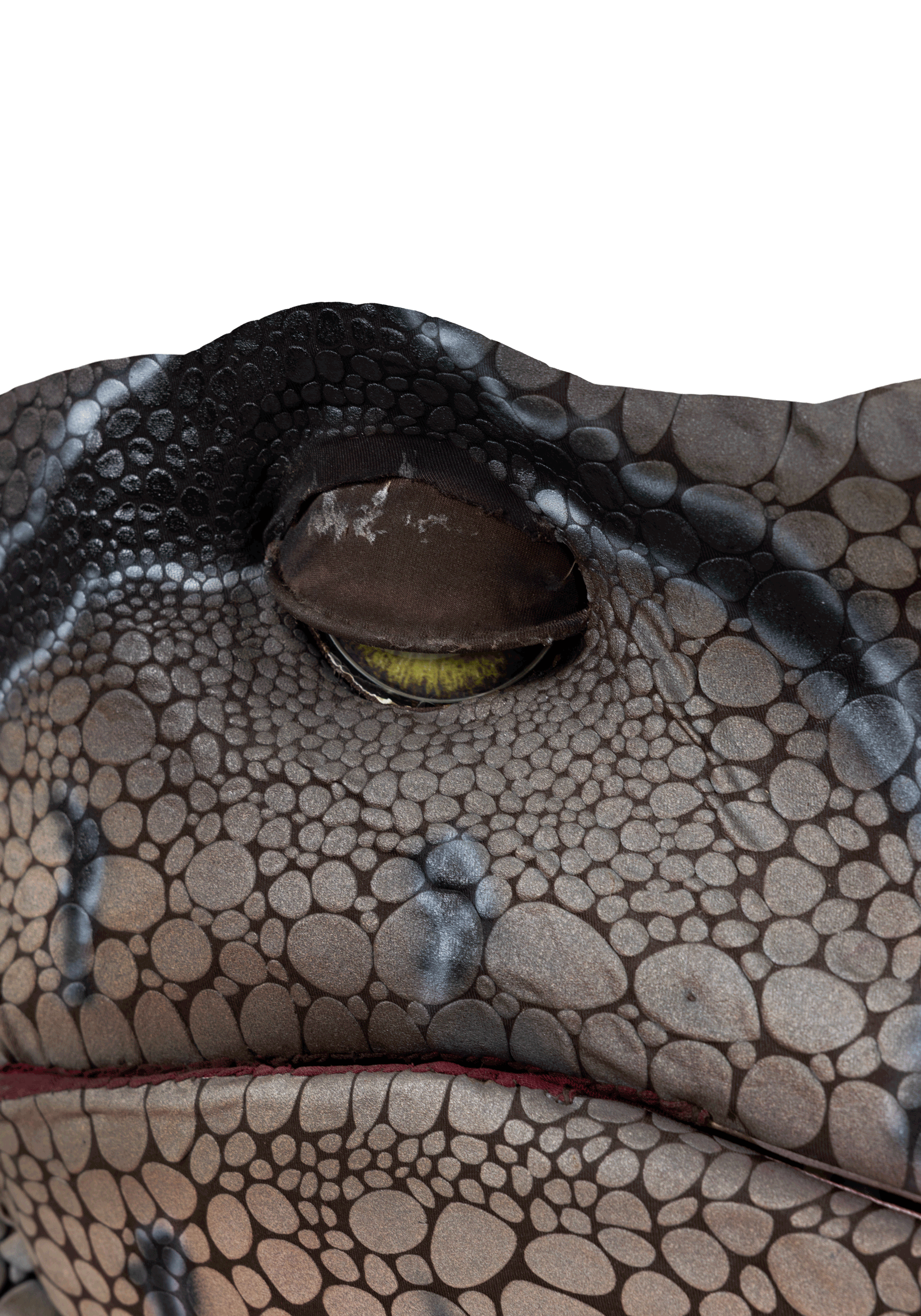 Entry is seamless thanks to a concealed zipper that runs from the base of the tail to the shoes, allowing the occupant to step directly inside. Once zipped, the performer is completely obscured, with the feet fully enclosed and hidden from view. Inside, a shoulder-worn harness buckles securely. A 3-by-5-inch internal screen displays a live camera feed from the lens positioned in the center of the chest, offering a forward view while the raptor's eyes blink open and close automatically.