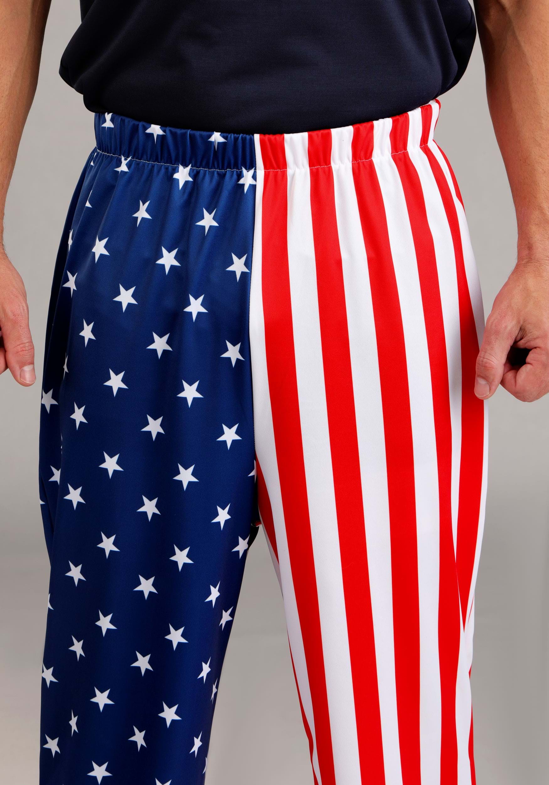 - Polyester poplin pants have sublimated stars and stripes, elastic waistband and ankle cuffs