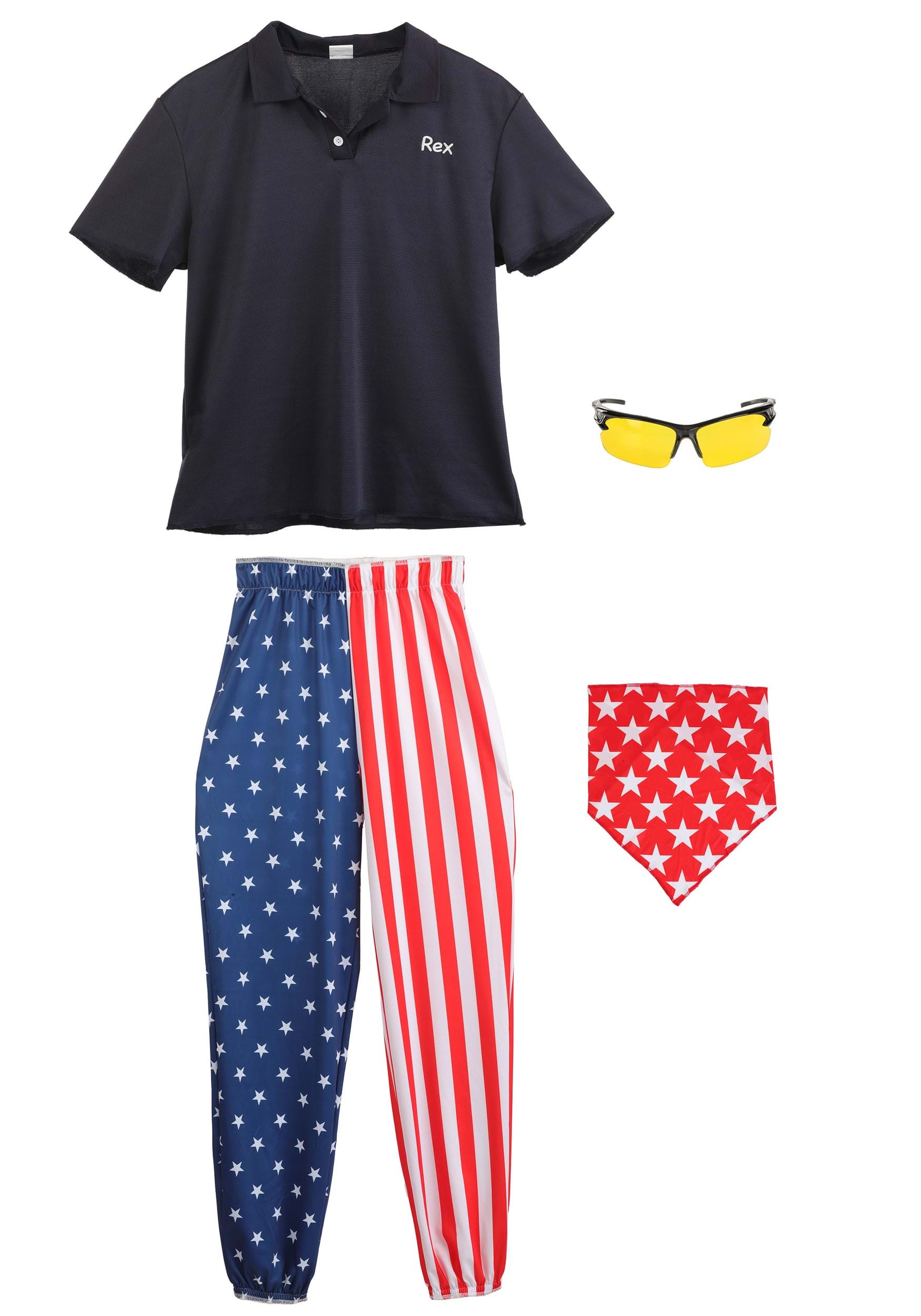 The costume begins with a classic black pullover shirt, built from comfy jersey knit and designed with faux buttons and "Rex" embroidered right across the chest. It's tough, it's authoritative, and it commands respect (or at least polite confusion at the Halloween party).