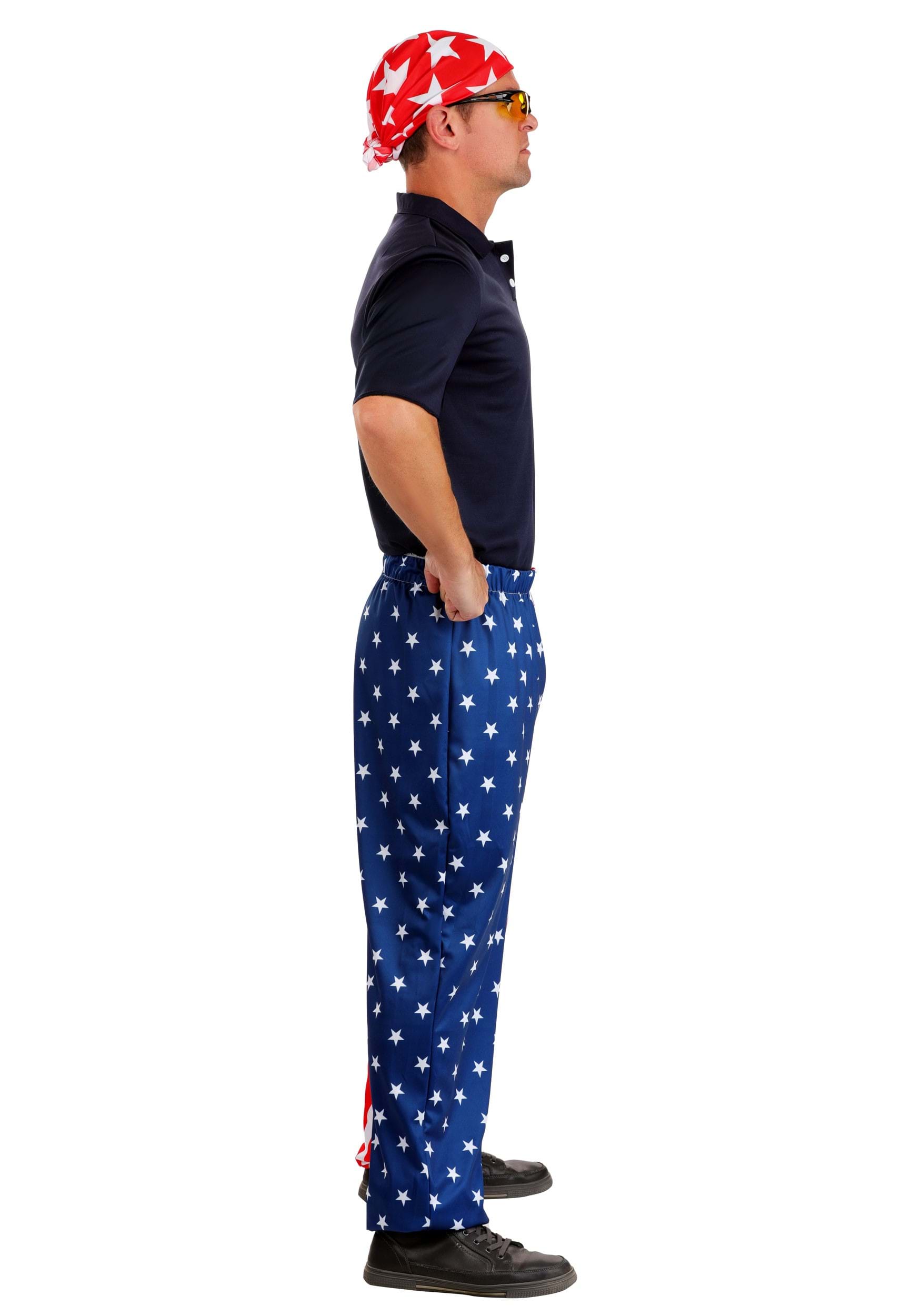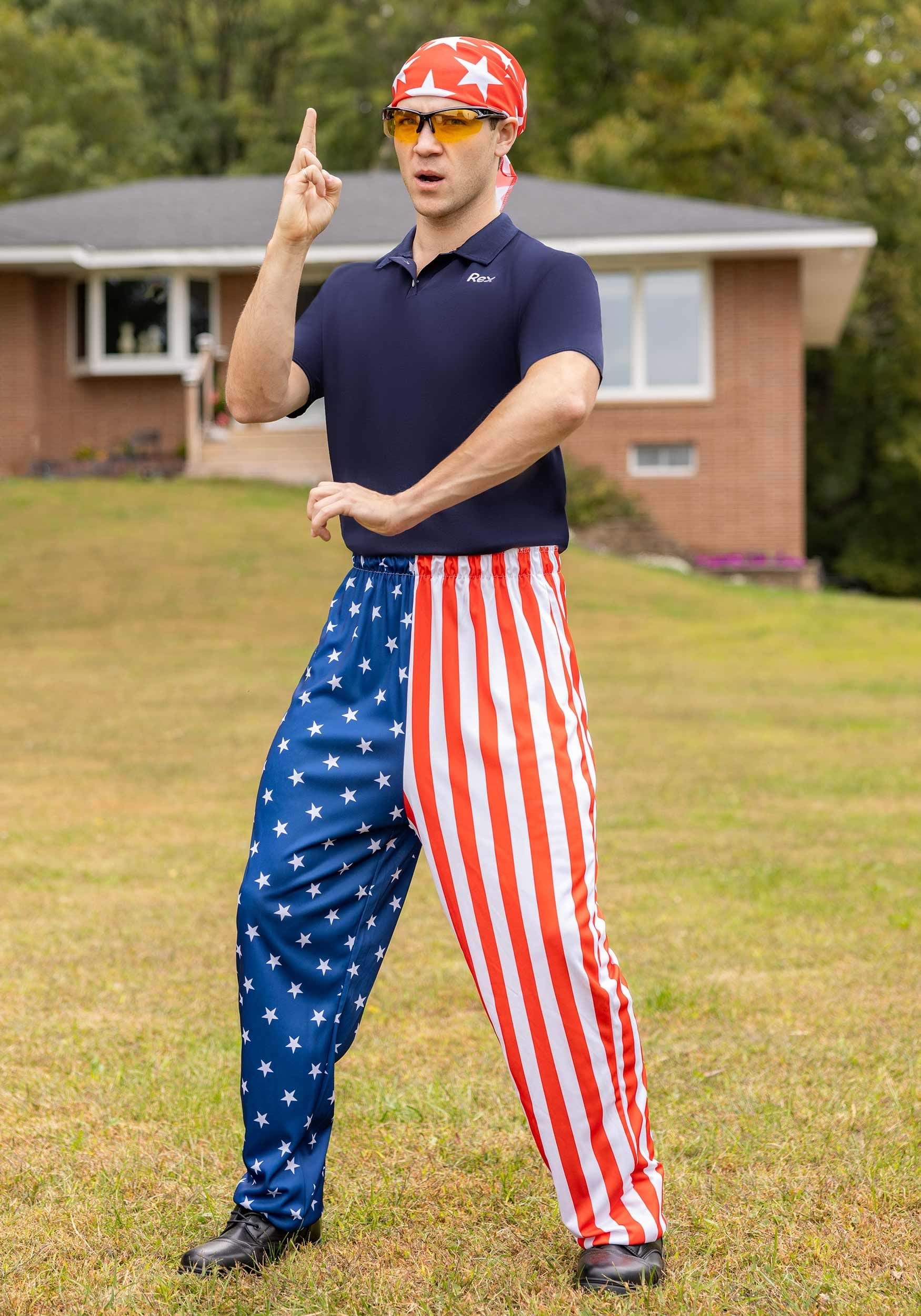 The pants? Oh, they're glorious. Crafted from polyester poplin and printed with a sublimated stars-and-stripes design, they're equal parts freedom and fury. Elastic waistband and ankle cuffs keep things flexible—perfect for demonstrating high kicks or jumping dramatically out of a low-slung van.