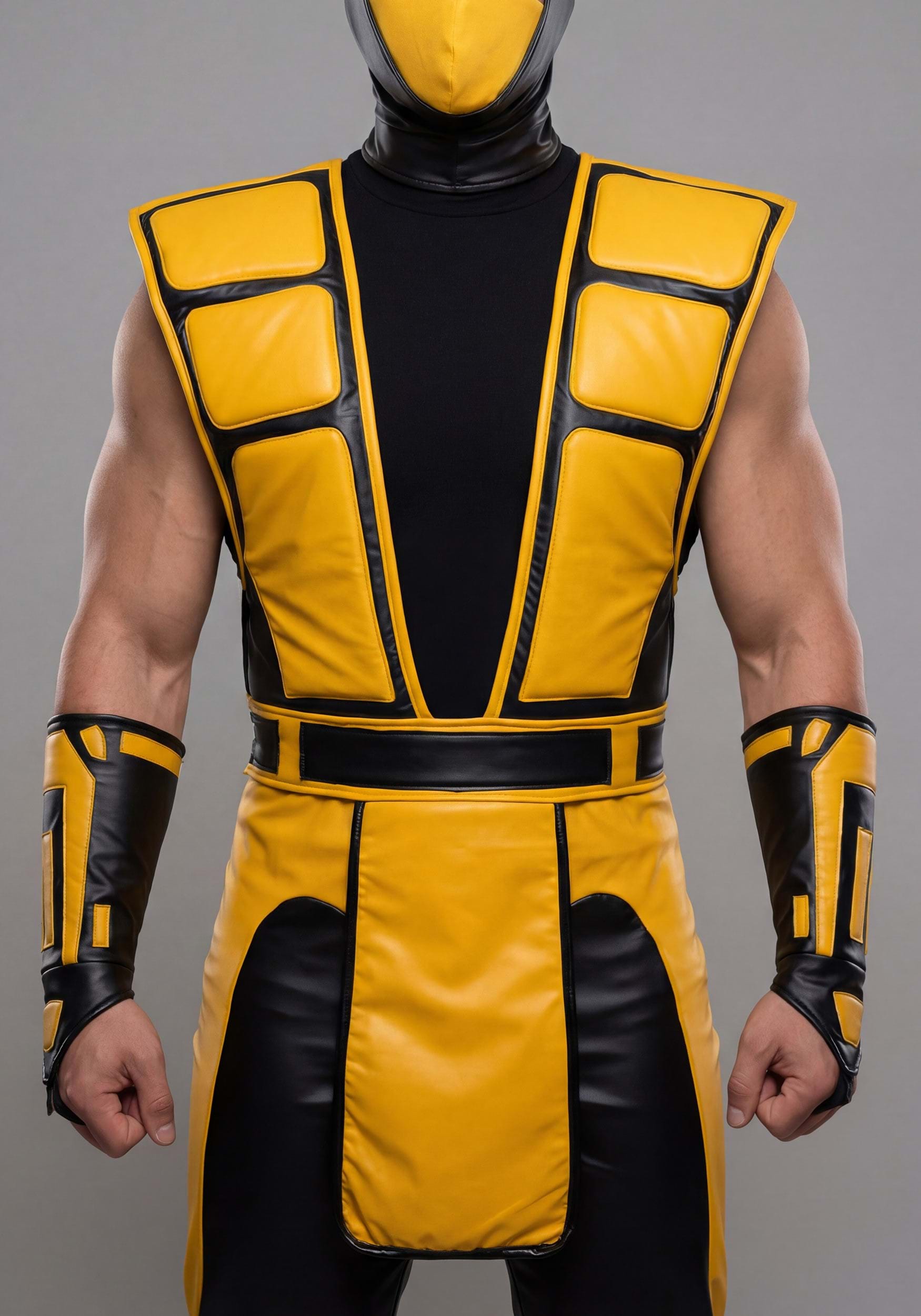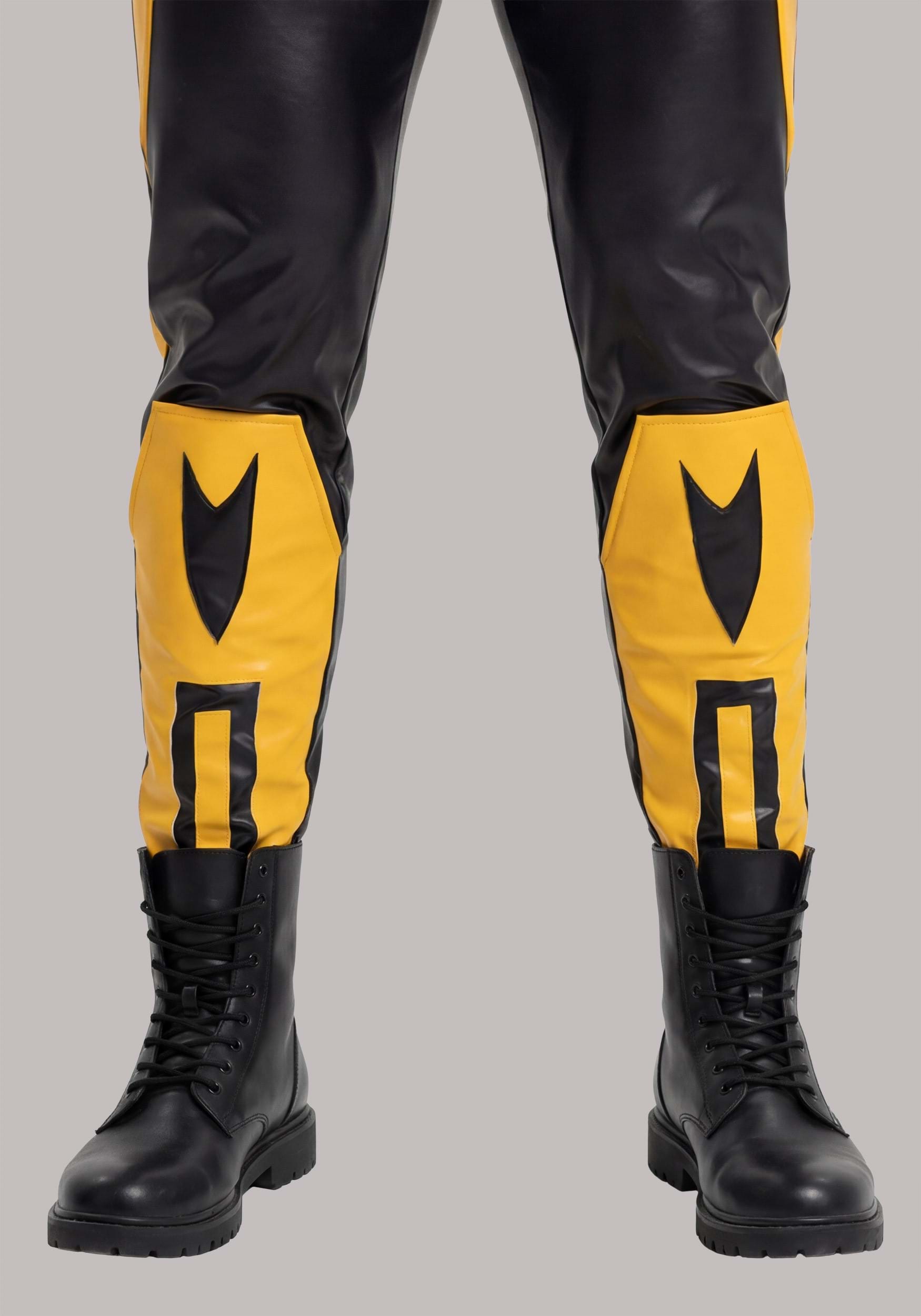 The centerpiece of this costume is the striking faux leather vest, rendered in Scorpion's signature yellow and black color scheme with bold geometric paneling visible across both the chest and back. It fastens securely along the sides for a snug, tailored fit. The sleeveless silhouette pairs with a matching shirt underneath, while the pants continue the dramatic two-tone design with angular black striping running down the legs. All these pieces are constructed from 4-way stretch faux leather polyester, so the fit moves naturally without sacrificing that sharp, armored aesthetic.