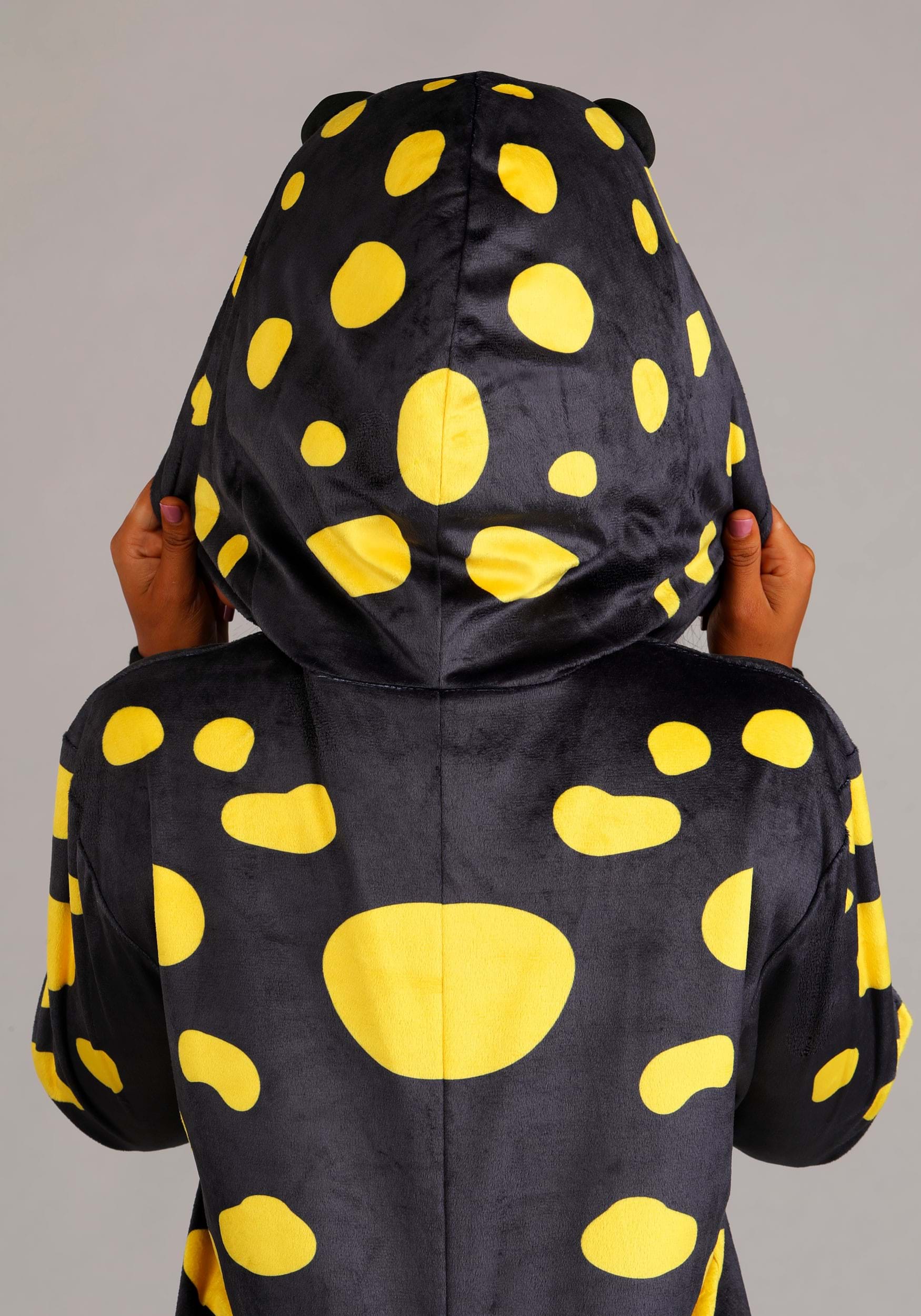 Crafted from plush polyester fleece, this cozy jumpsuit is covered in vibrant yellow spots, just like its real-life counterpart. It zips up the front for quick changes and has rib-knit cuffs at the wrists and ankles to help keep its shape. The back features an attached tail for extra salamander swagger, and the hood transforms into the critter's face, with large, rounded eyes for a wide-eyed woodland stare. The onesie design means it layers easily over clothes, making it great for cool-weather trick-or-treating or hopping from one Halloween party to the next.