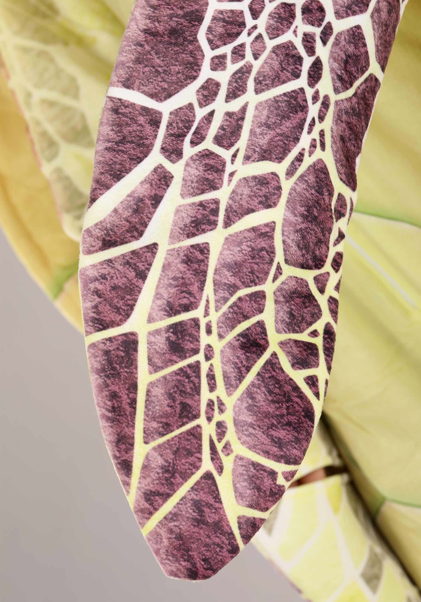 The attached shell on this jumpsuit is breathtaking. Vibrant shades of russet, olive, and amber are printed in a pattern that echoes real sea turtle markings, with subtle shading and linework that make the shell appear almost three-dimensional. The shell features a hidden opening so you can add your own stuffing for extra volume, giving it the perfect domed shape for maximum impact.