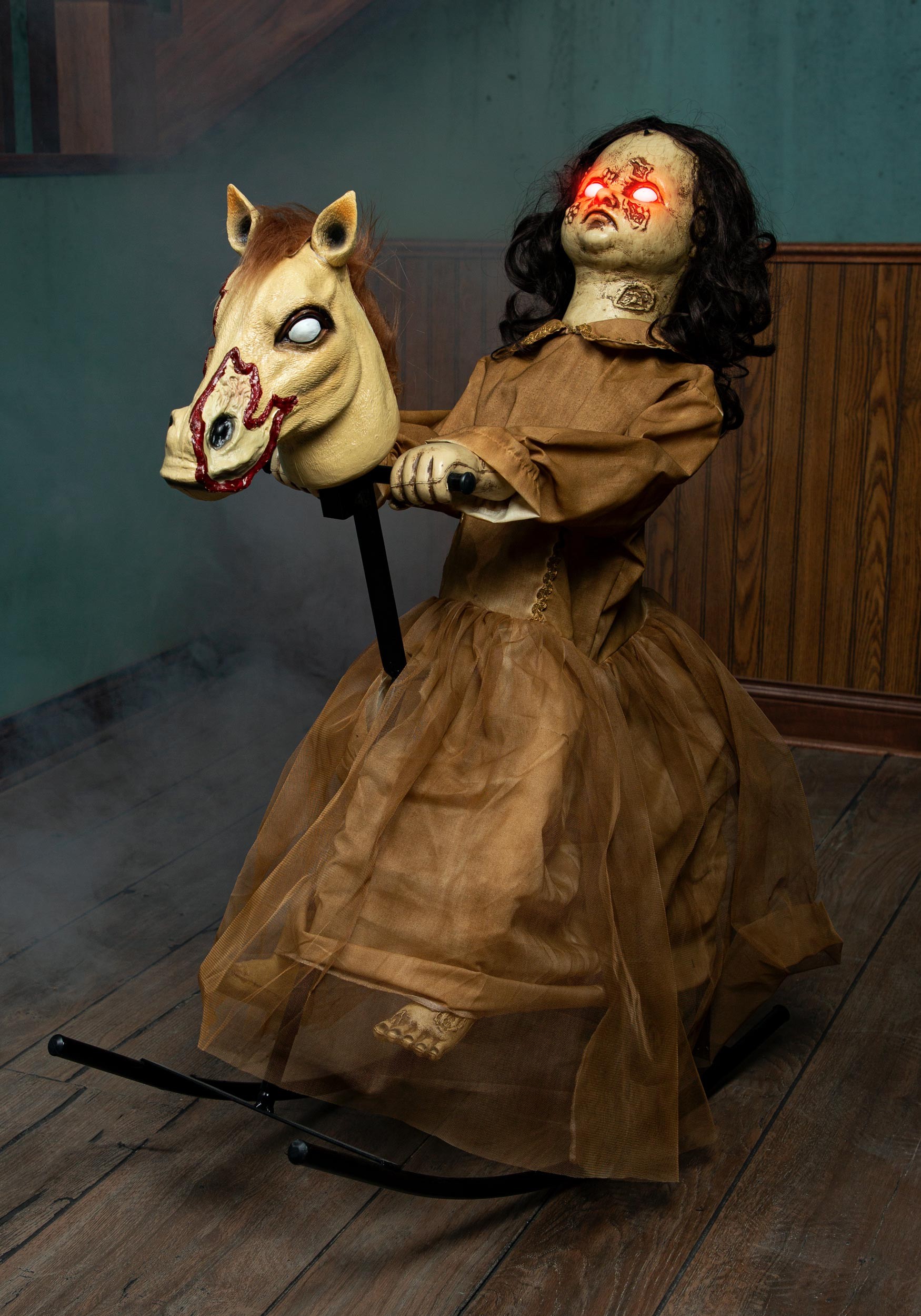 If you dare to embrace the darkness, then this animated rocking horse with doll prop is an absolute must-have for your Halloween collection. Let it be the centerpiece of your creepy carnival, enticing your guests into a world of twisted wonders and frightful delights. With its bone-chilling presence, this prop will ensure your Halloween festivities are unforgettable.
