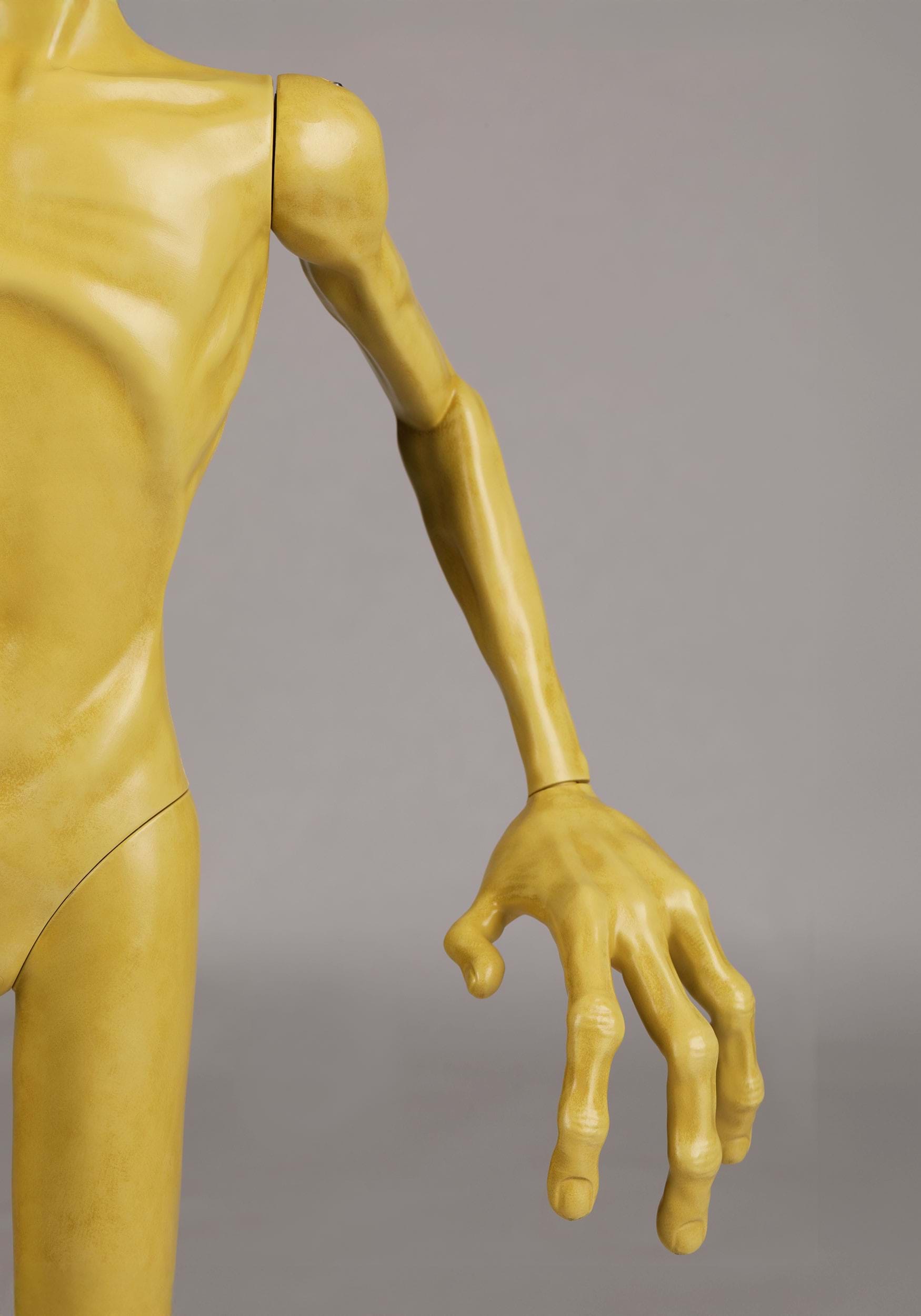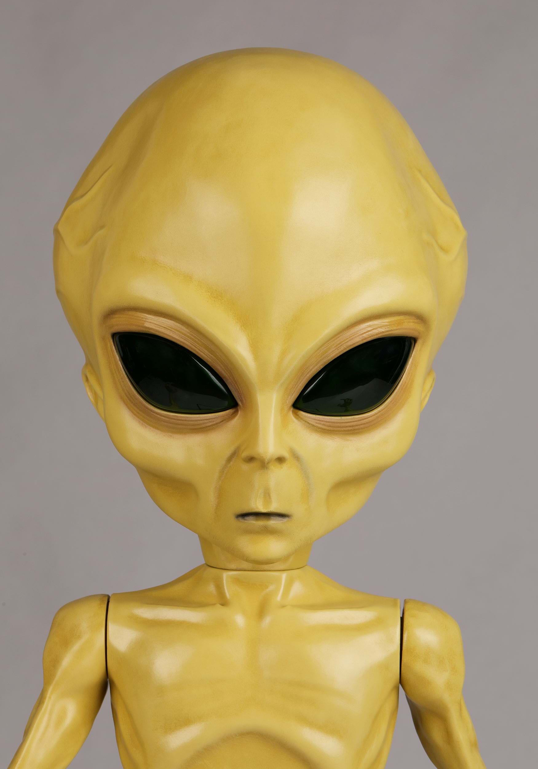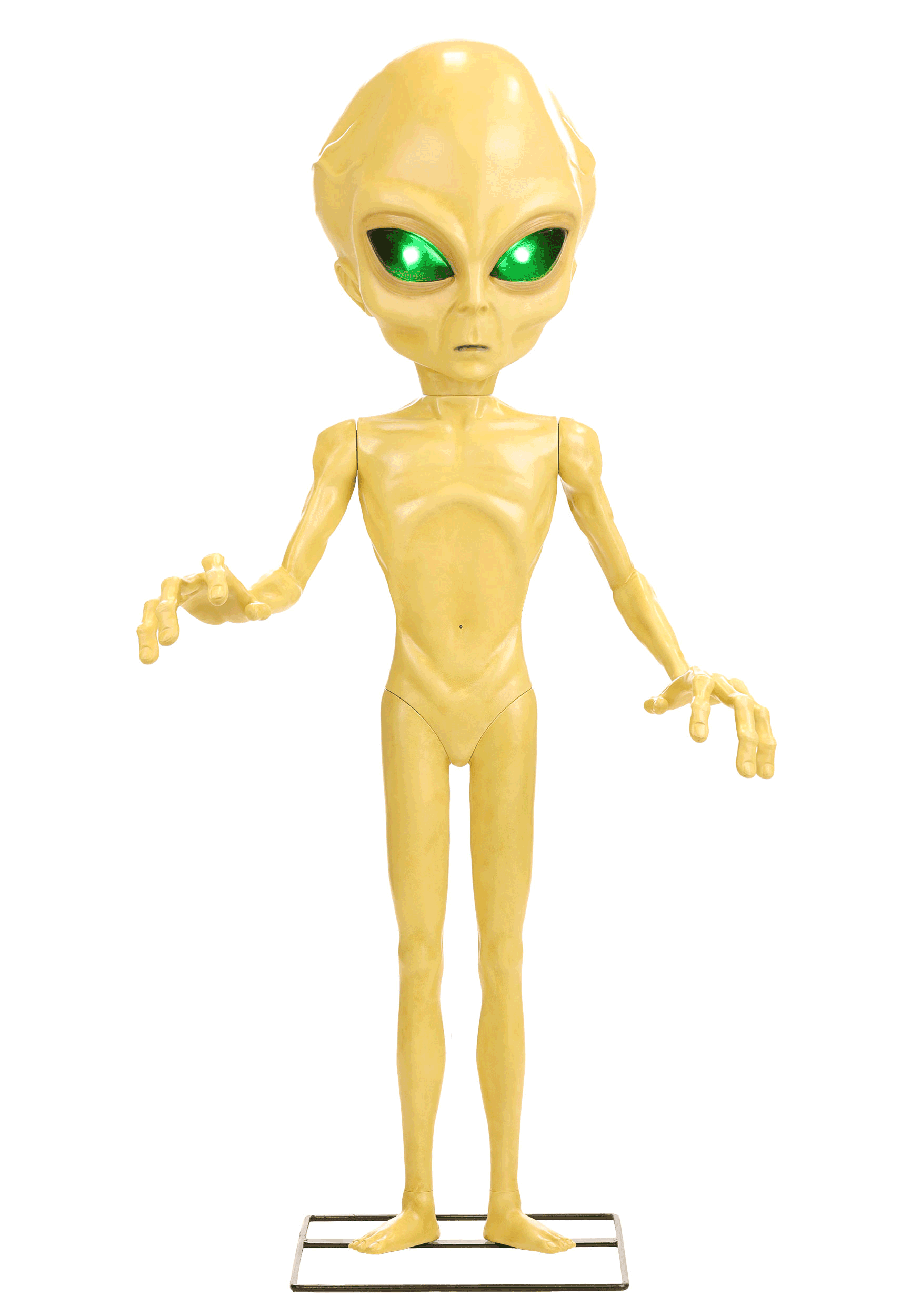 Standing 4 feet 6 inches tall, this interstellar visitor features a disproportionately large bald head, narrow torso, and long, posable arms that hover with unsettling grace. His smooth, plastic body is supported by a sturdy metal stand and draped in minimal polyester clothing to let that uncanny anatomy shine. The giant green eyes light up with an eerie glow as his head slowly pivots from side to side—watching, waiting, observing your every move.