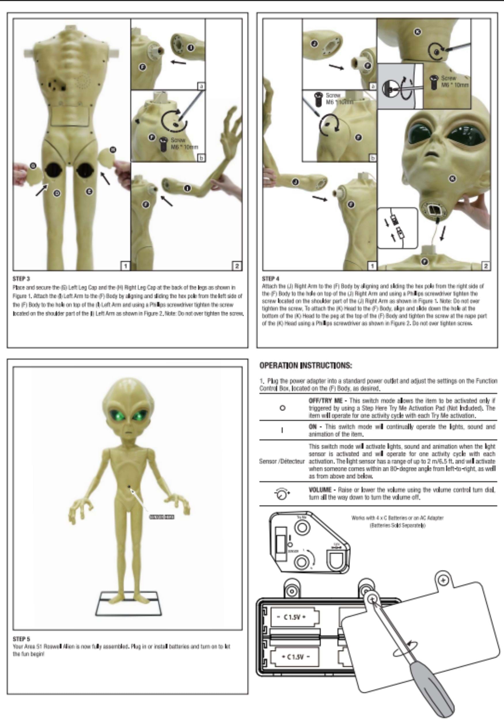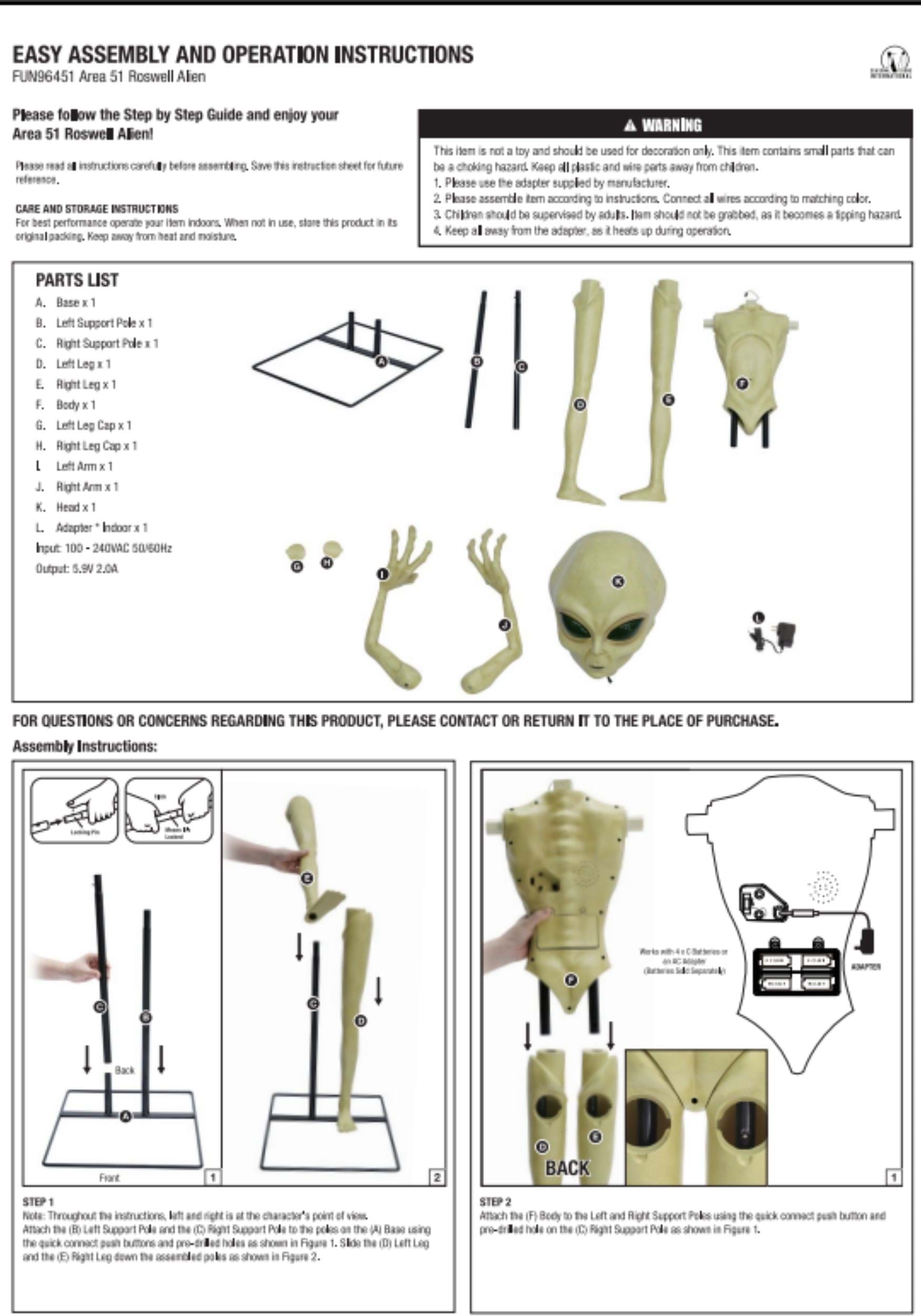 Great for indoor displays or covered outdoor settings, the alien must remain dry and must be plugged into a GFCI outlet if used outside. Note: A plug adapter may be required for use outside the U.S. (not included). From Roswell to your front yard, this alien animatronic proves the truth is out there—and this Halloween, it’s closer than you think.
