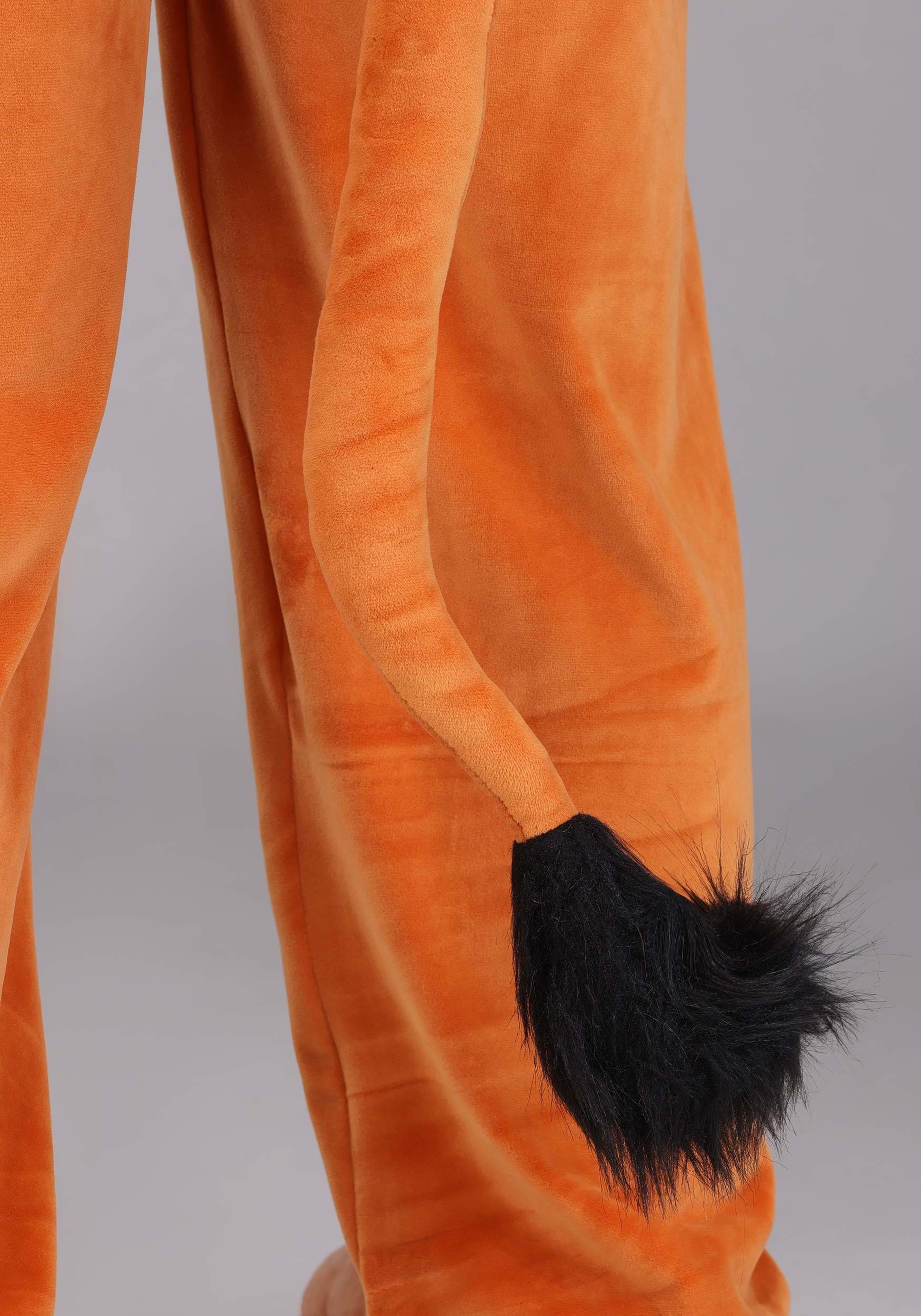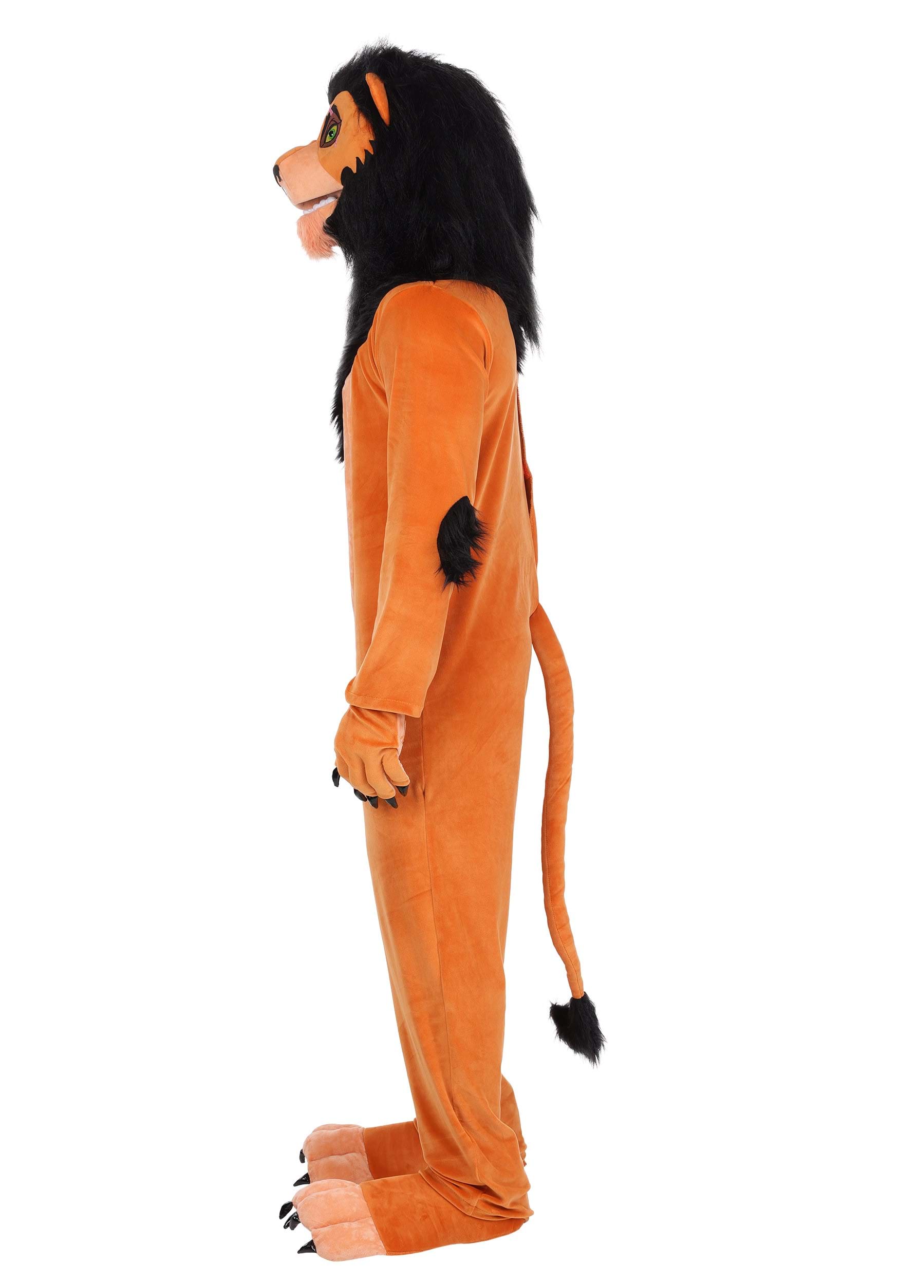 This officially licensed costume is a Minky jumpsuit, boasting a faux fur chest and elbow tufts for a look inspired by Disney's The Lion King character. Faux leather talon nails on the gloves and foot covers as well as the attached tail add fierce flair. The animated mask is a molded face with a faux fur hood, plus a dynamic hinged jaw that moves as you speak, immersing you into Scar's character.