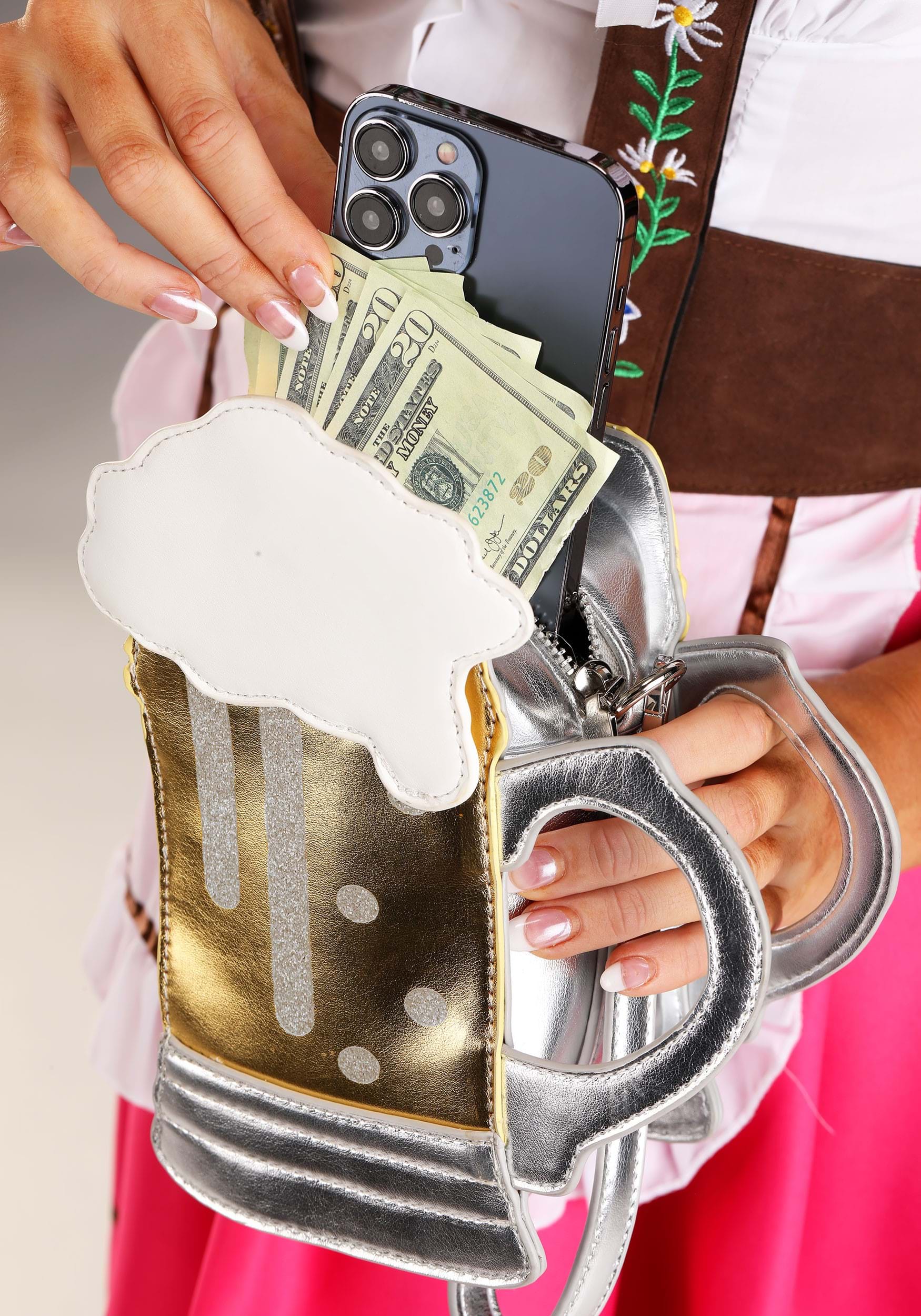 The Beer Mug Purse features a zipper closure to keep your belongings secure while you party the night away. The outer dimensions of this purse measure 4.5" wide, 7" high, and 2" thick, making it the perfect size to carry all your essentials. With a 6" wrist strap and a length-adjustable shoulder strap, you can choose how you want to rock this beer-inspired accessory.