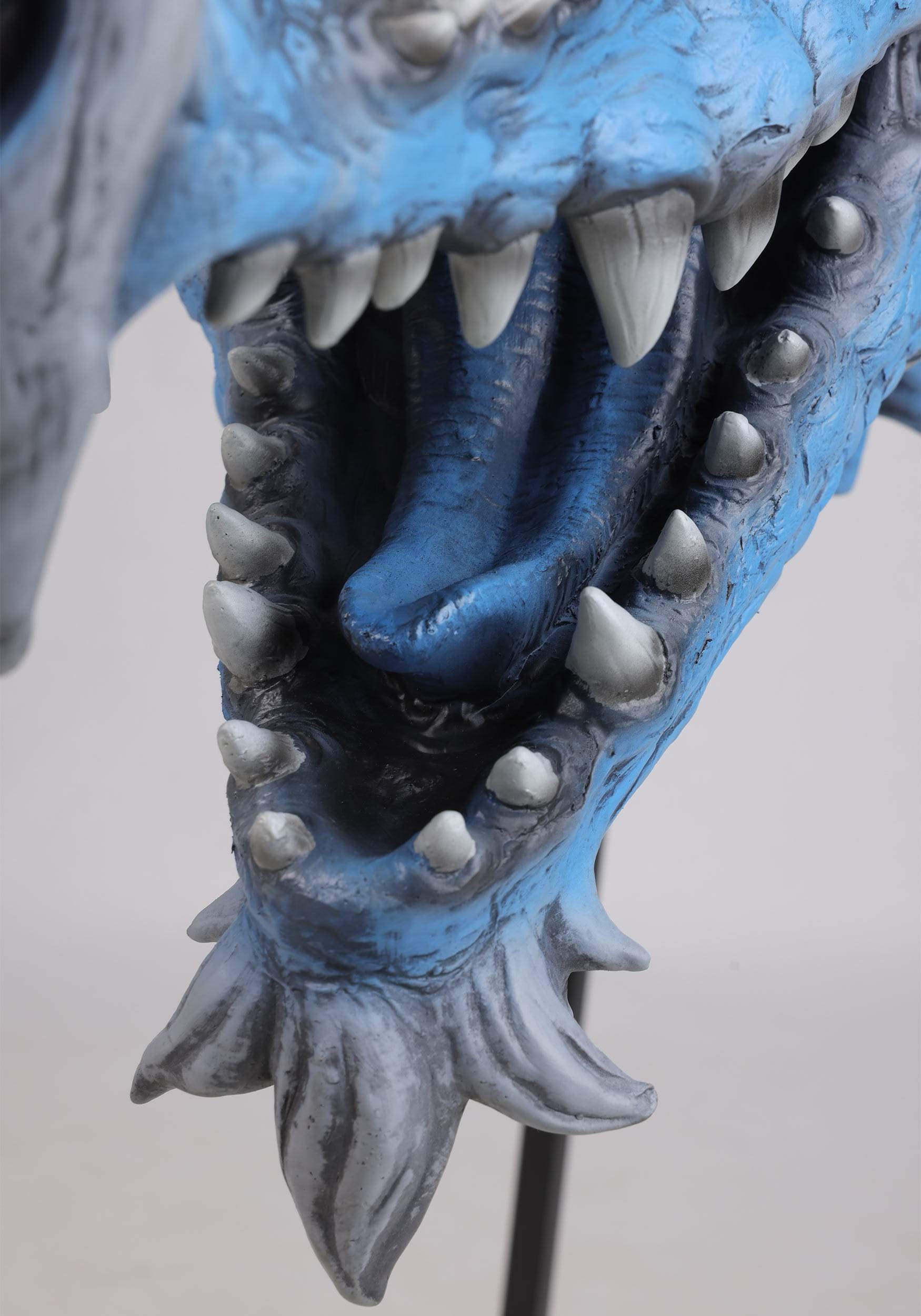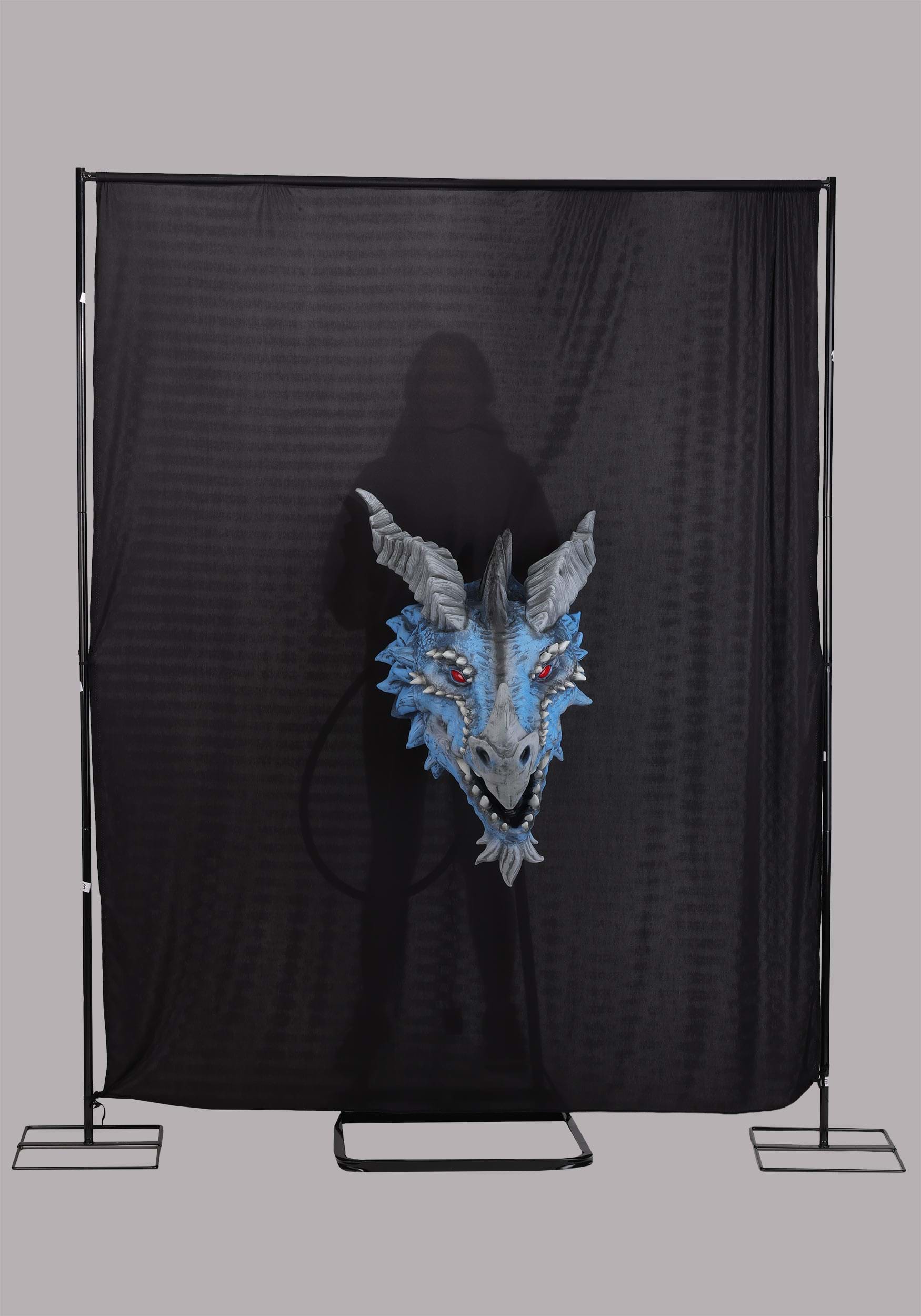 This Halloween, invite a legendary beast into your haunt with the Blue Dragon's Head Actormatronic Decoration. Standing three feet tall and mounted on a sturdy metal frame, this magnificent creature features icy blue scales, fearsome horns, and piercing red eyes that glow with ancient menace. High-quality foam construction brings incredible depth to every ridge, spike, and tooth, while hand-painted graphics capture the dragon's otherworldly presence. A dramatic fabric backdrop frames this mythical guardian, making it the centerpiece that transforms any space into a realm of fantasy and fright.