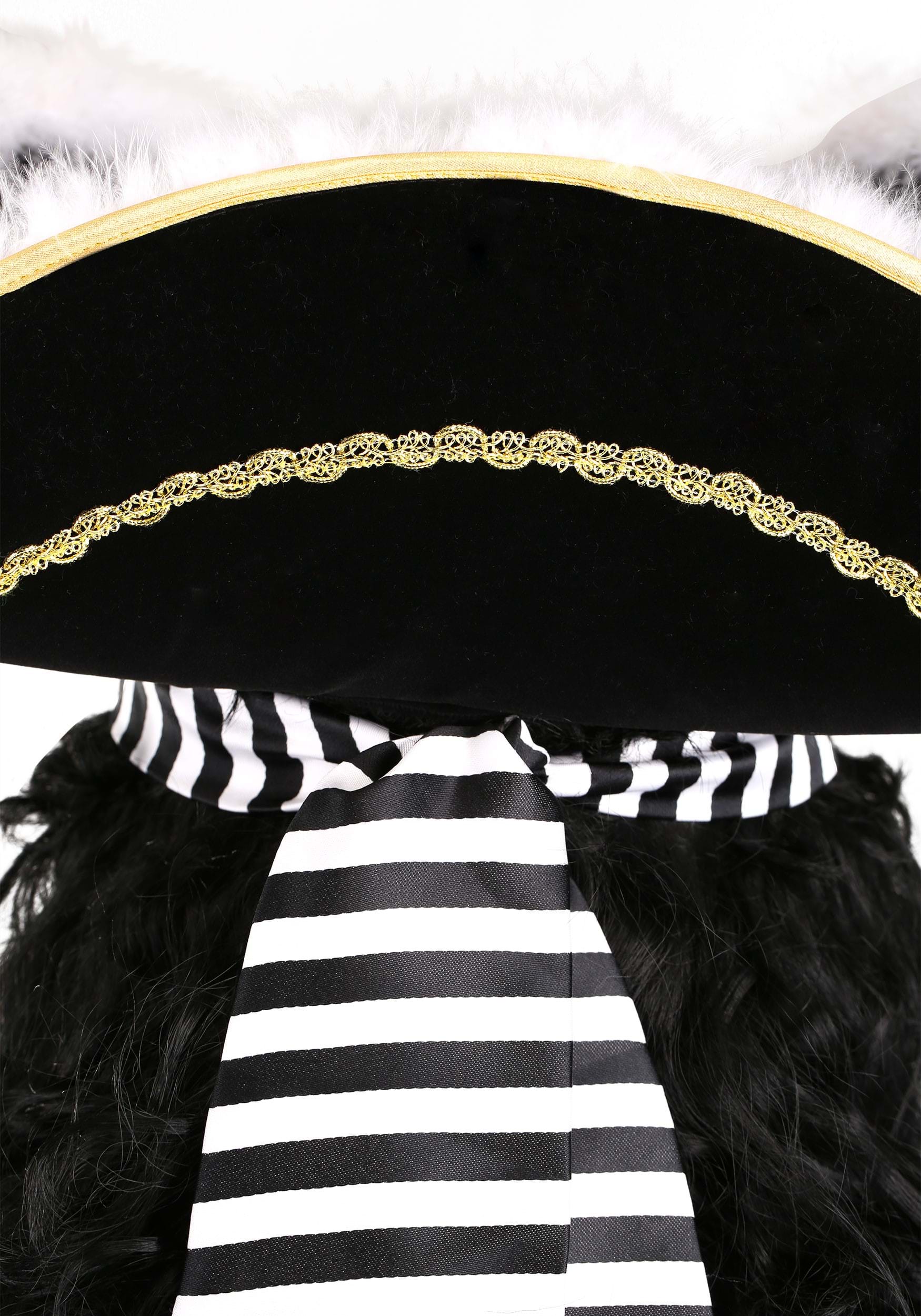 No Captain Hook costume is complete without the iconic accessories. Our costume includes cuffed faux leather boot tops that easily slide on to meet the pants cuffs, giving you the appearance of wearing authentic pirate boots. The foam-backed tricorn hat adds an air of authority with its wire brim edge and features a feather and gold braid trim. An attached striped scarf can be tied as desired, completing the look with a touch of pirate flair.