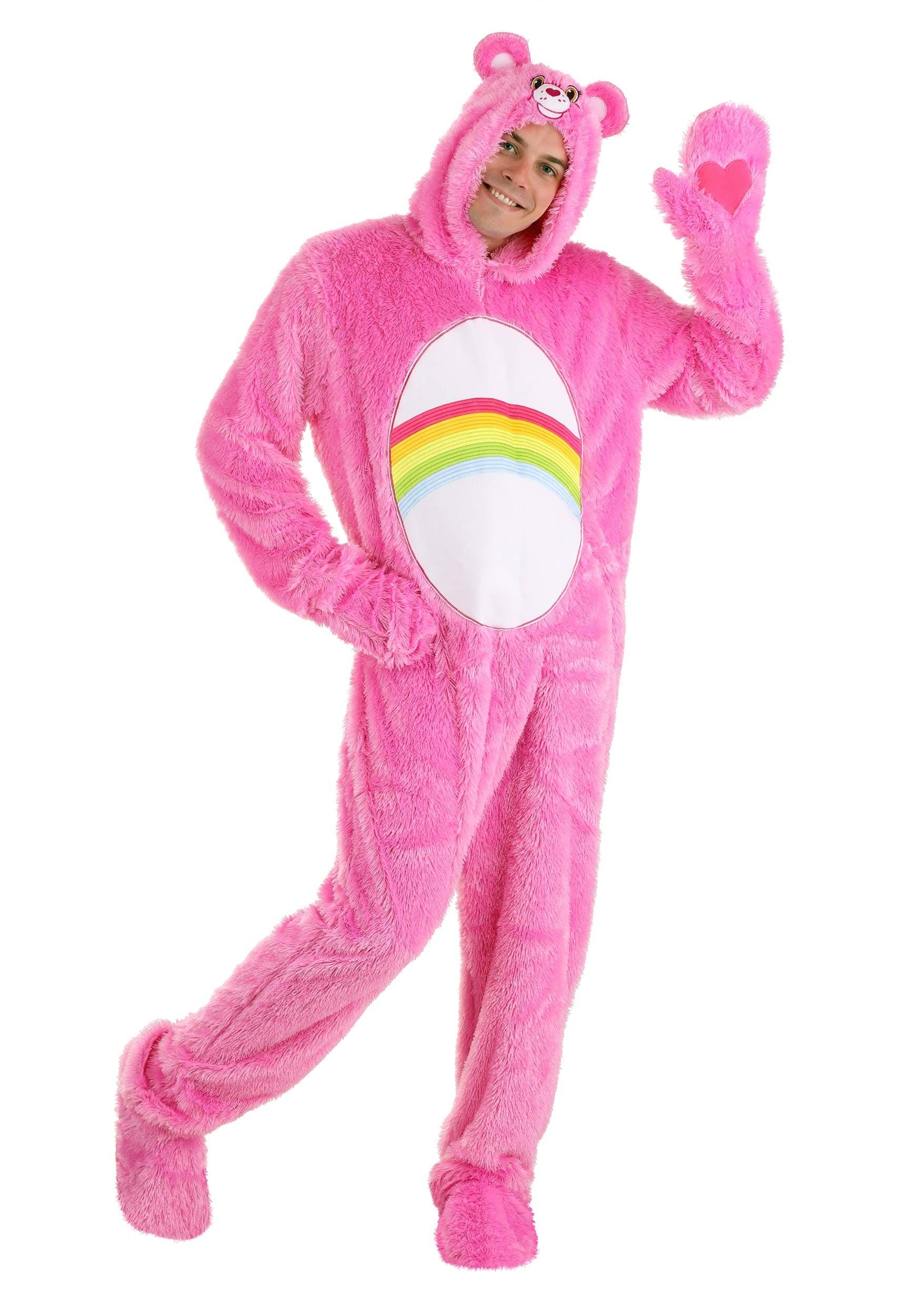 The jumpsuit features a convenient back zipper for easy wear and removal, ensuring a hassle-free costume experience. With an attached hood and mitts, you'll have everything you need to fully transform into the lovable Cheer Bear. The hood even has an embroidered face with attached ears and a 3D nose, giving you an authentic and adorable look.