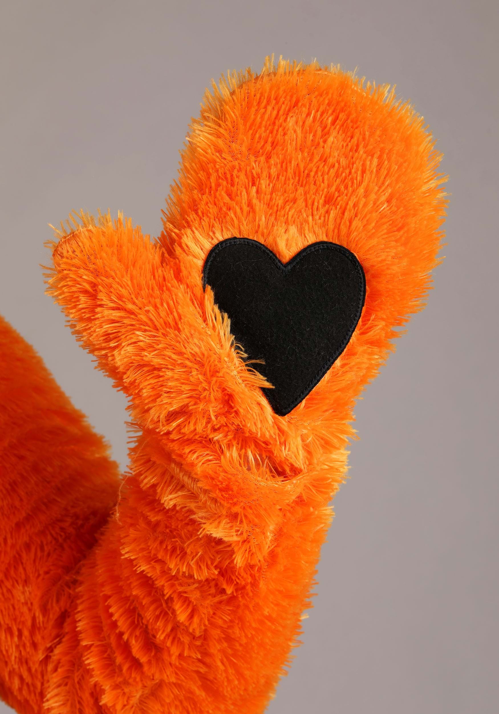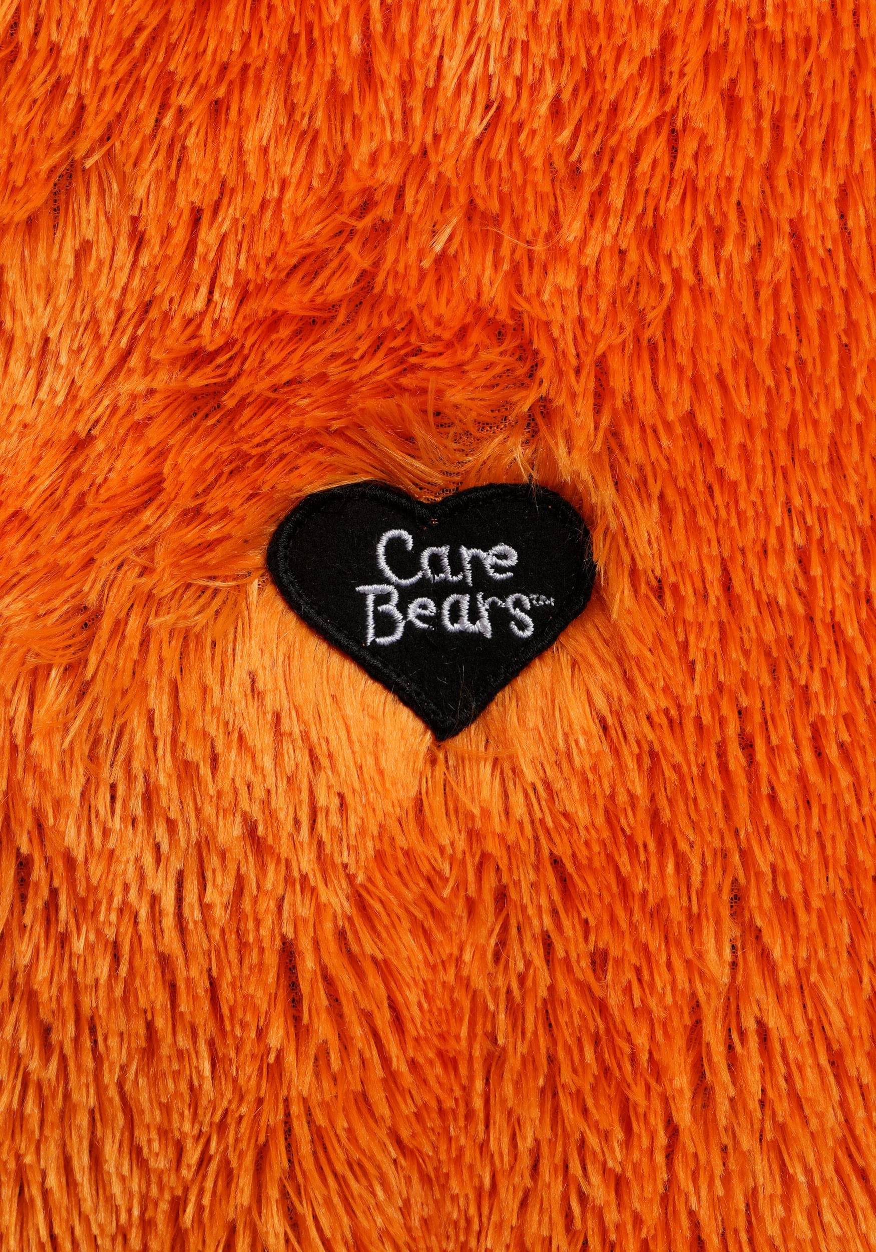 The costume features a rich orange faux-fur jumpsuit that zips up the back, creating a cozy, all-over bear look. A large white belly patch showcases Trick or Sweet Bear's signature jack-o'-lantern emblem, smiling proudly with heart-shaped eyes that celebrate the season of giving (and getting candy!). The back features a classic logo detail to complete the character design. Pull up the attached hood to reveal a friendly embroidered face with plush ears and a soft-sculpted nose. It's as if Trick or Sweet Bear has stepped straight off the clouds and into your Halloween celebration.