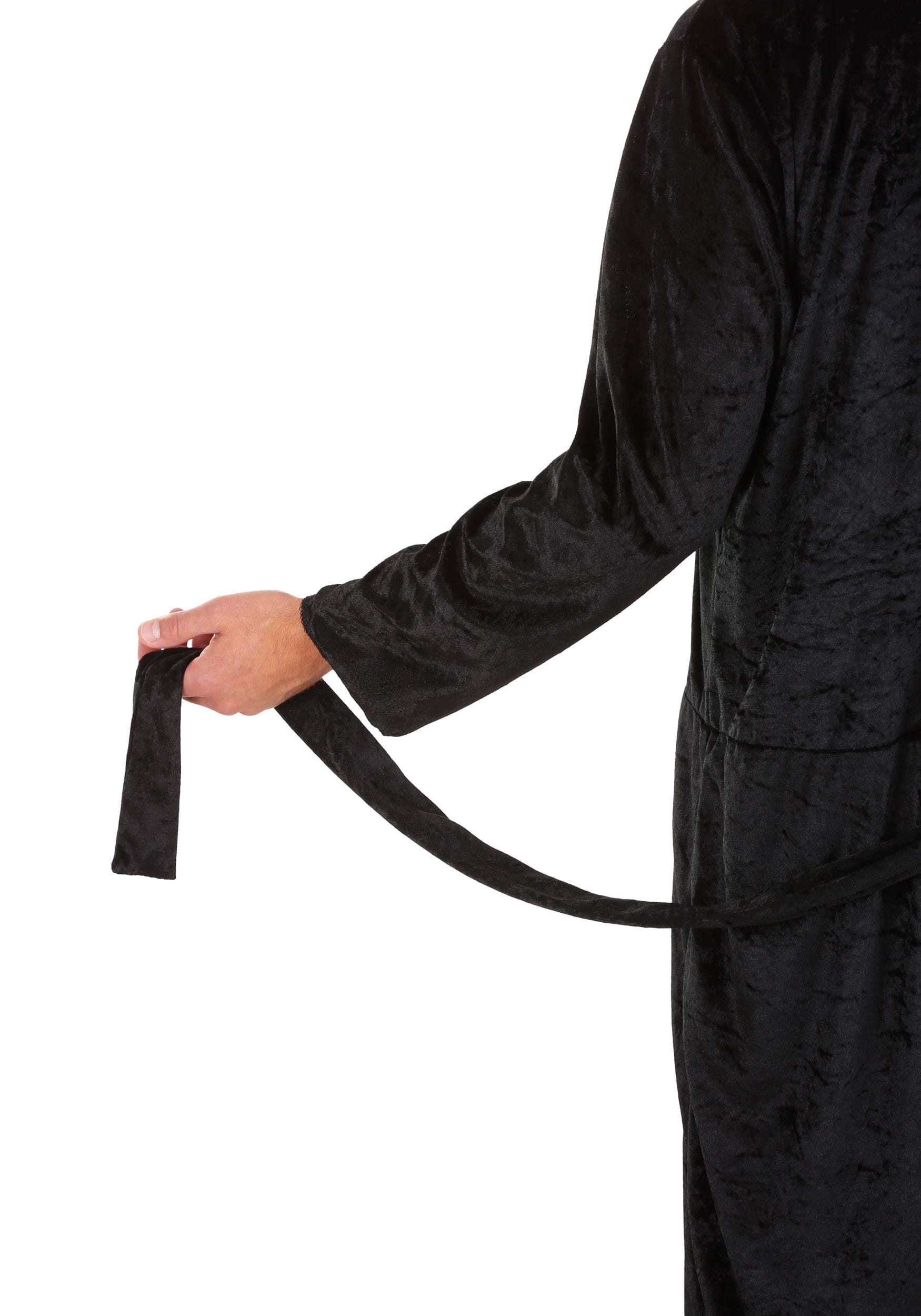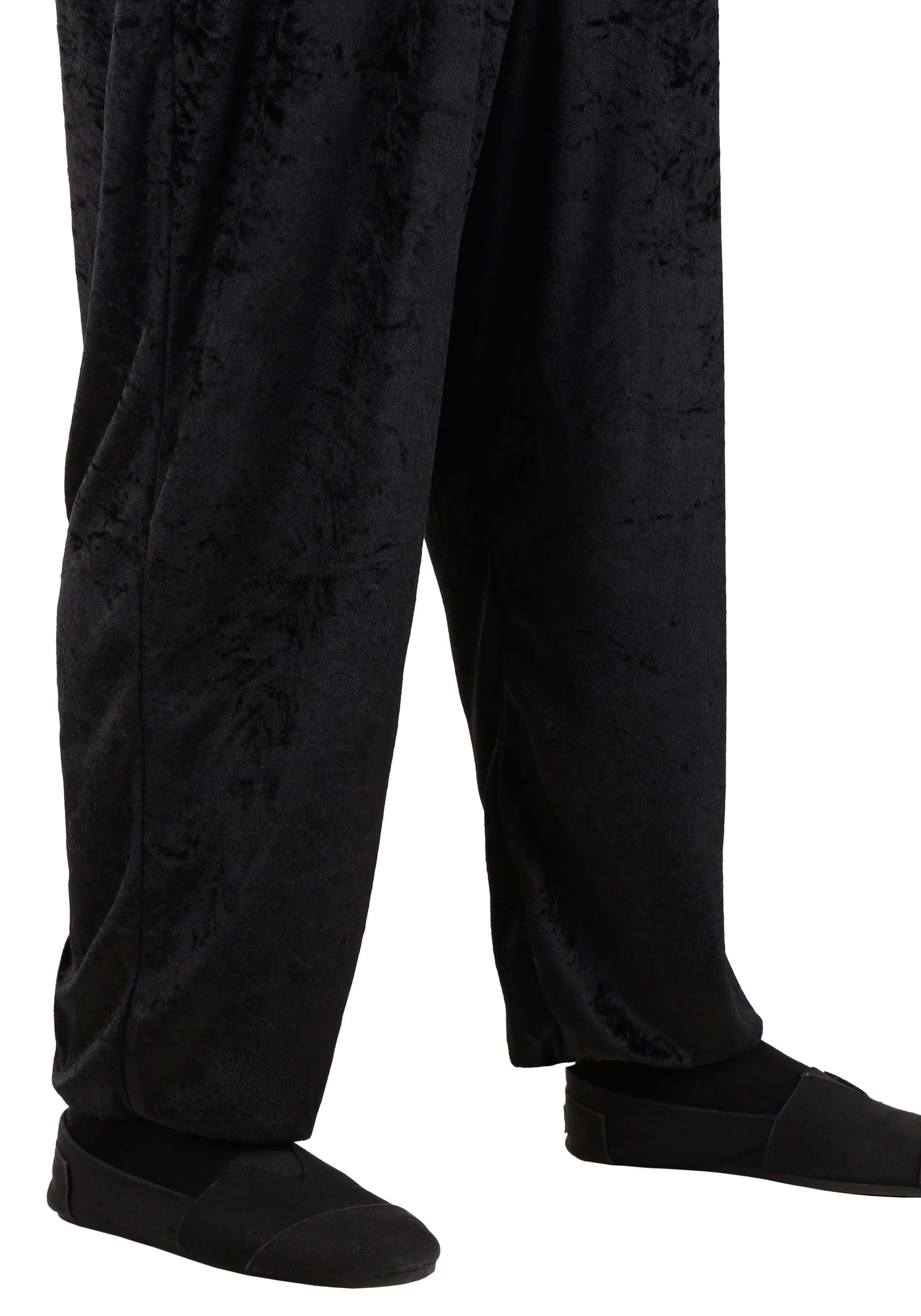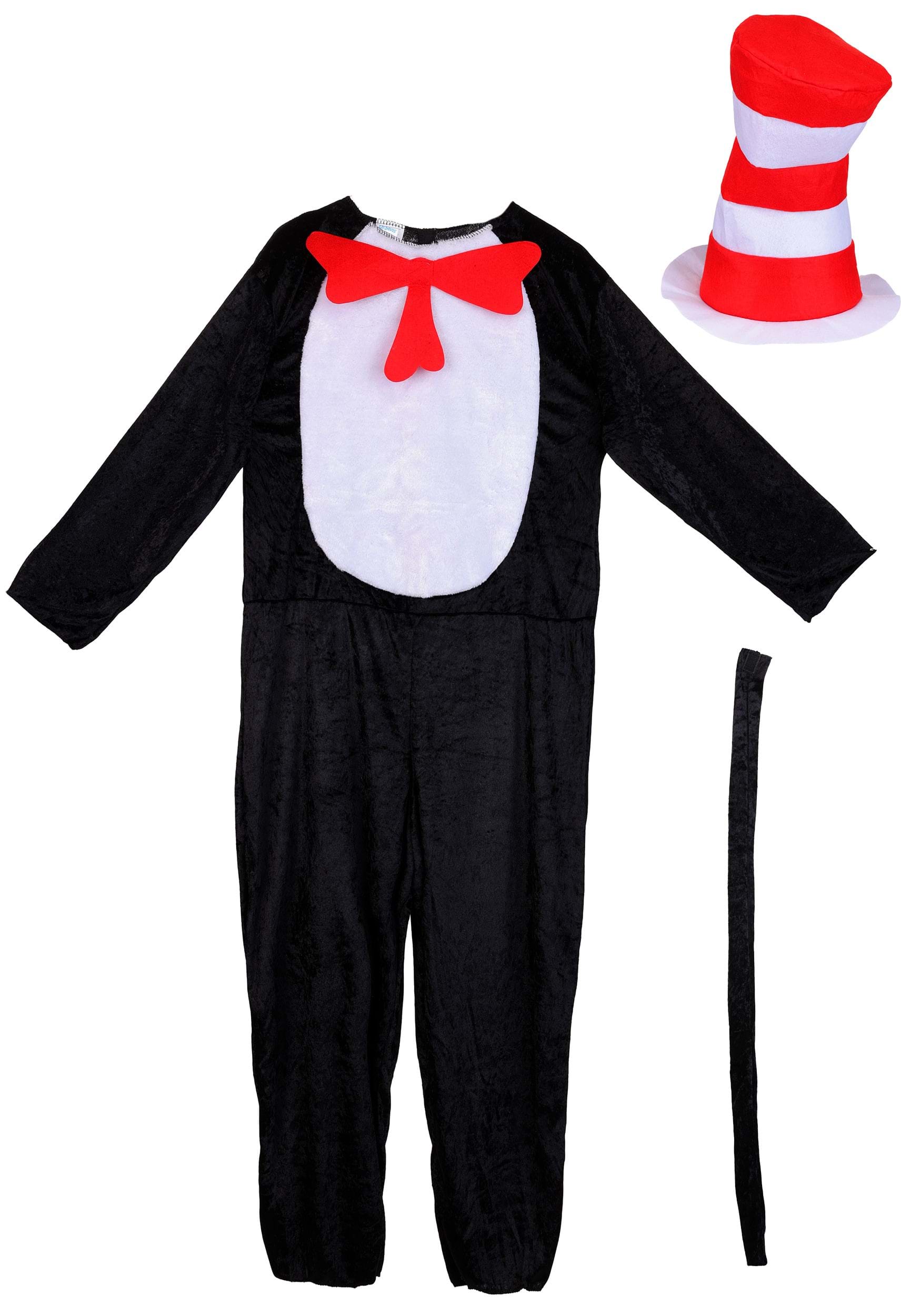 The crushed velvet jumpsuit features a convenient hook and loop fastener at the center back, making it easy to slip on and off. The front of the jumpsuit showcases a white plush fabric inset with a sewn-on red felt bow tie, adding a touch of charm and authenticity to your Cat in the Hat look. The same-fabric tail attaches to the back of the jumpsuit with a hook and loop fastener, completing the playful ensemble.
