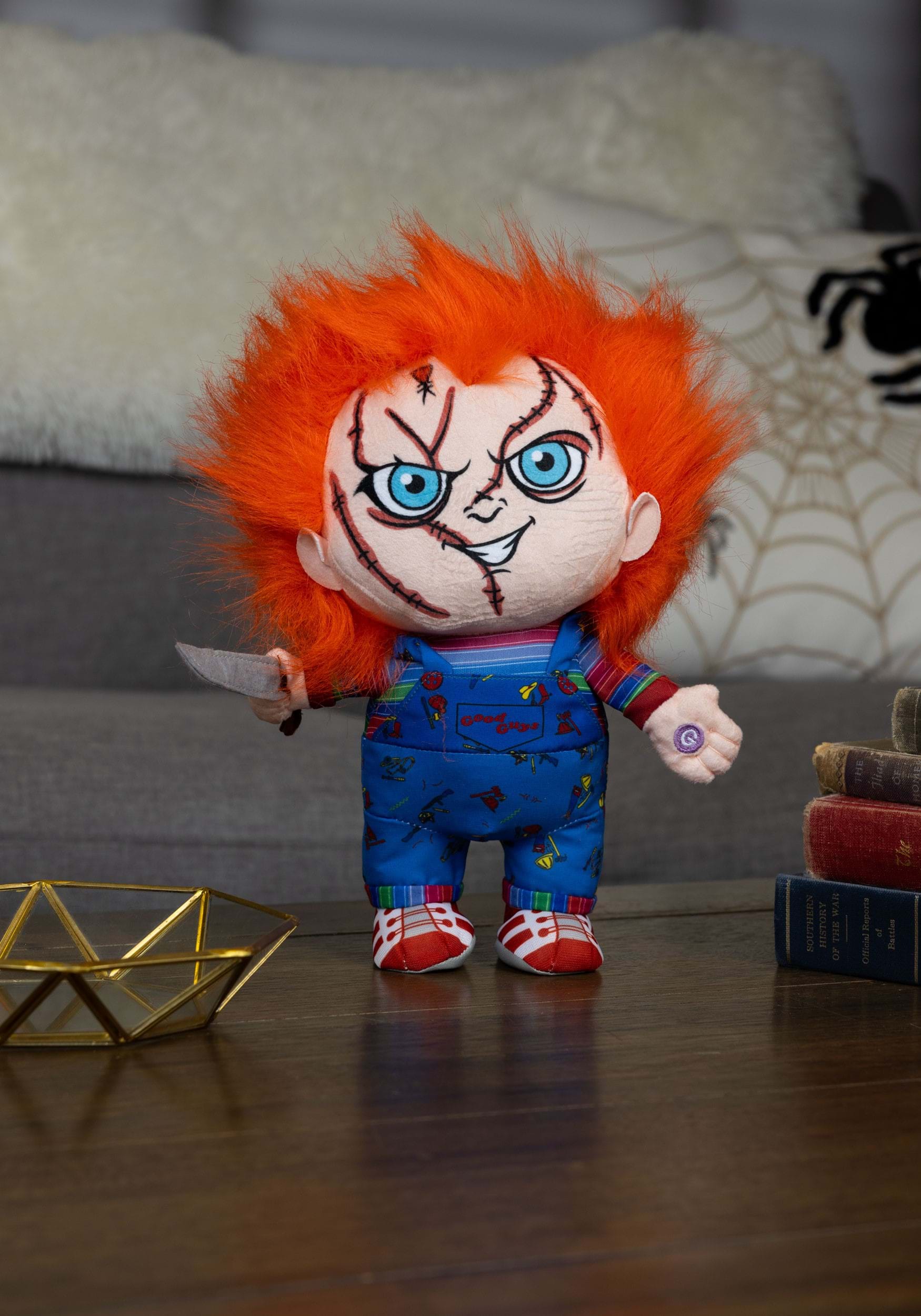 This creepy-cute companion features built-in animatronics that let him shuffle forward with his signature unsettling waddle. With each press of his plush hand, he unleashes one of five chilling phrases straight from the Child’s Play films—instantly recognizable to fans and delightfully eerie to unsuspecting guests. Whether he's patrolling your living room or lurking by the candy bowl, he’s always ready to make his presence known.