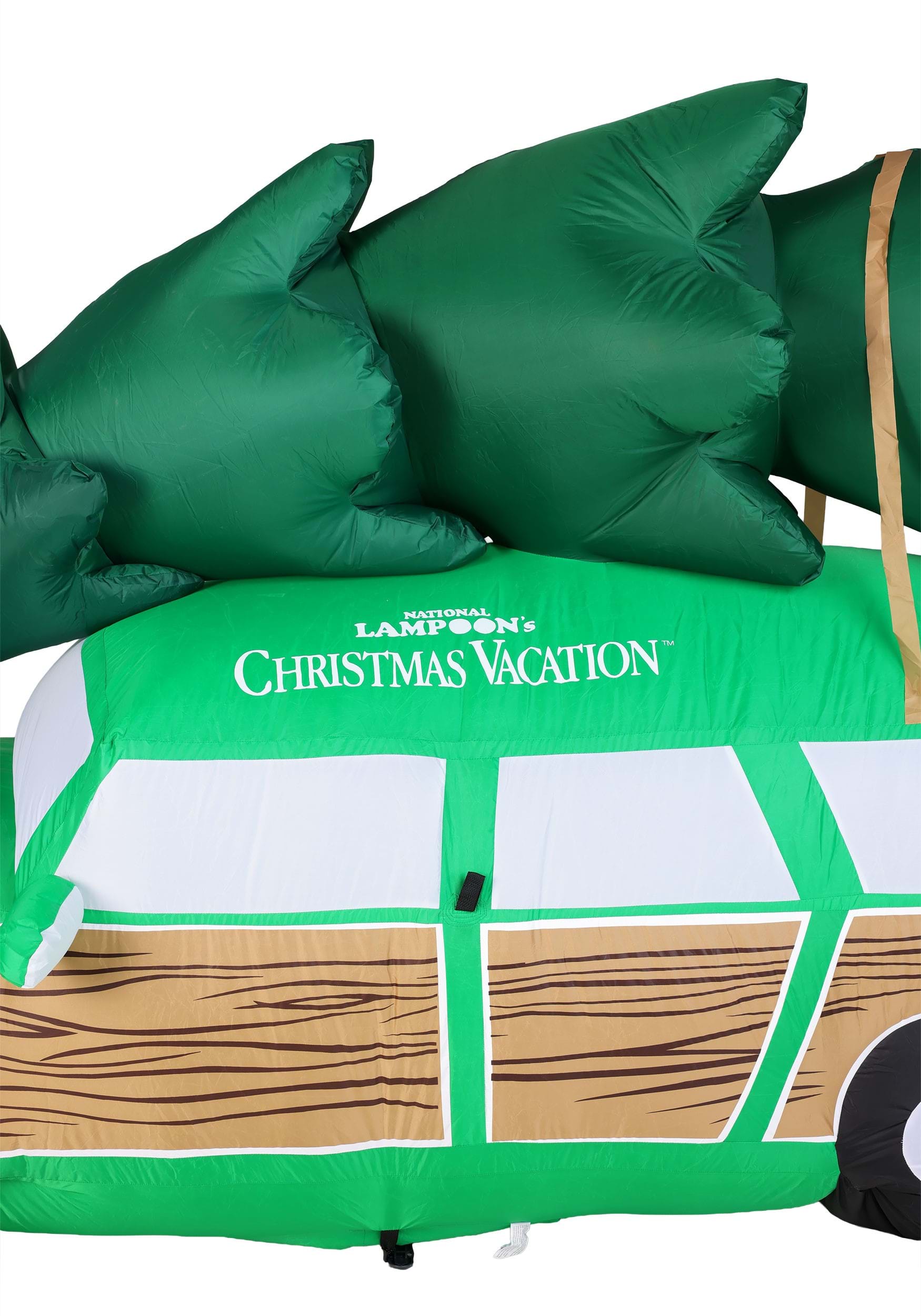 From the faux-wood paneling to the bright green paint job, every inch of this inflatable wagon screams Griswold. The gigantic pine tree sits proudly on top, tied down with tan straps that look one jolt away from snapping—just like Clark’s holiday spirit. The design captures the look and feel of the movie with cartoonish exaggeration, perfect for fans who want their decor as bold as their holiday traditions.