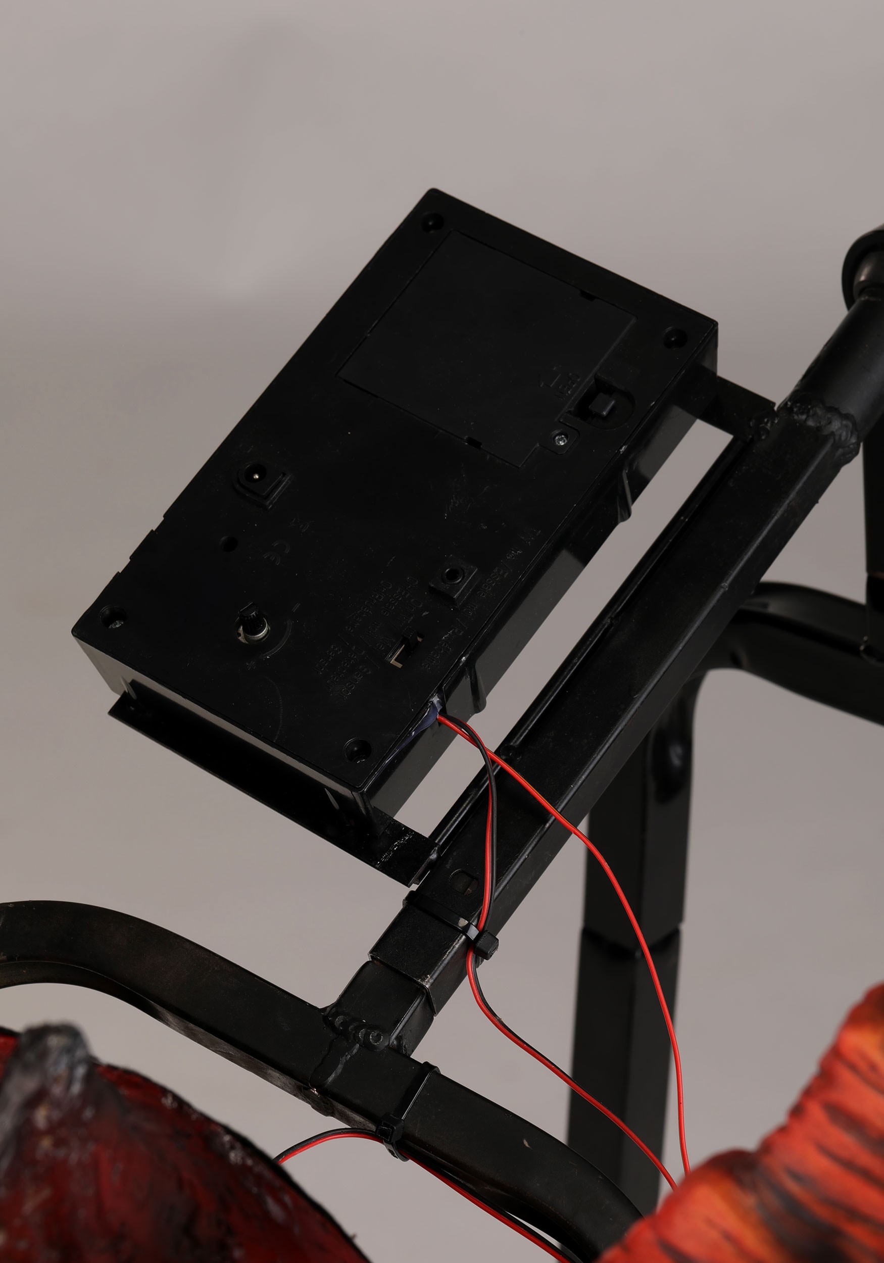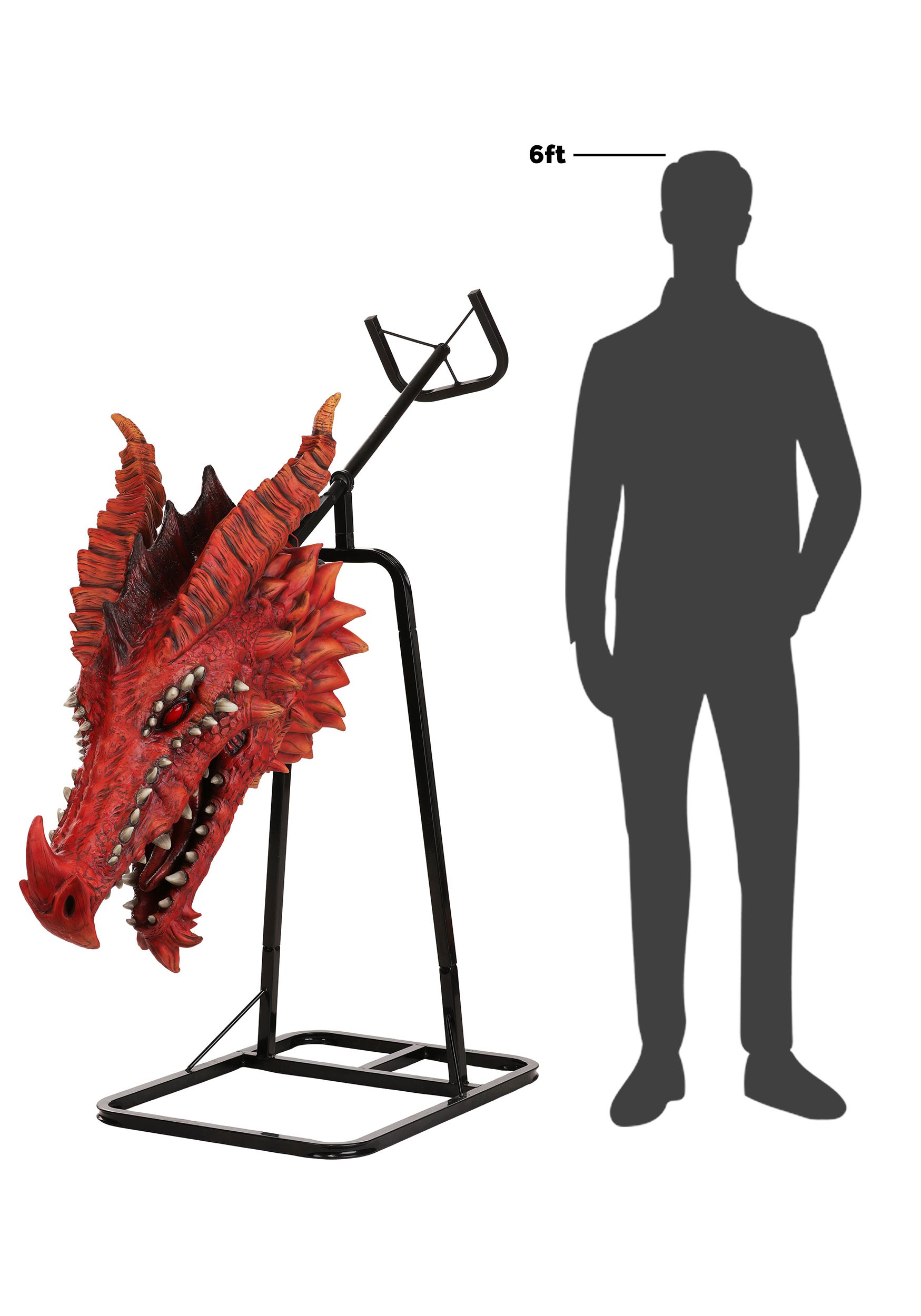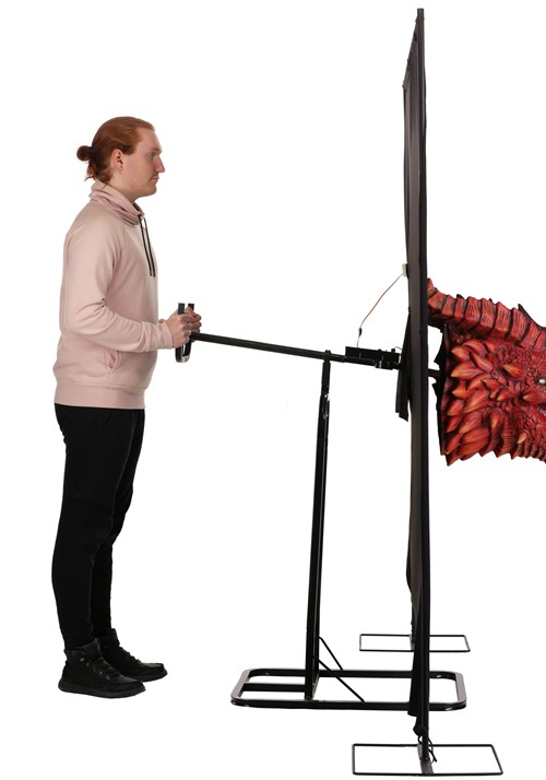 Engineered for both stability and ease of use, the Dire Dragon Decoration is set on a solid metal frame, positioned behind a black fabric backdrop and curtain stand for an immersive effect. A lever system with hand grips allows for simple yet dramatic movement, letting you control the beast's head for added interactivity. Power it with a standard US outlet or optional battery ports, ensuring your dragon is always ready to awaken.