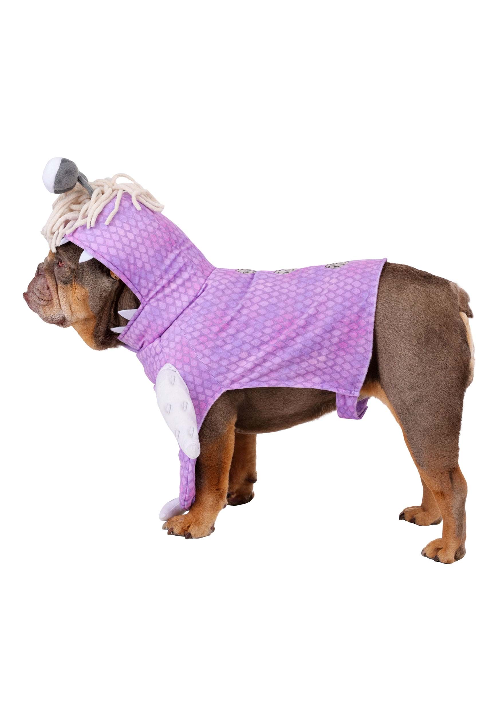 This Boo costume for dogs features a soft Minky body printed with a scaly purple finish and shaped for comfort with a cozy jersey knit lining. The hood completes the look with plush yarn "hair," soft felt monster teeth, and a pair of oversized eyeballs on flexible wire stalks with embroidered expressions. Fastened securely under the belly with hook-and-loop straps, this look stays put for a night of fun.