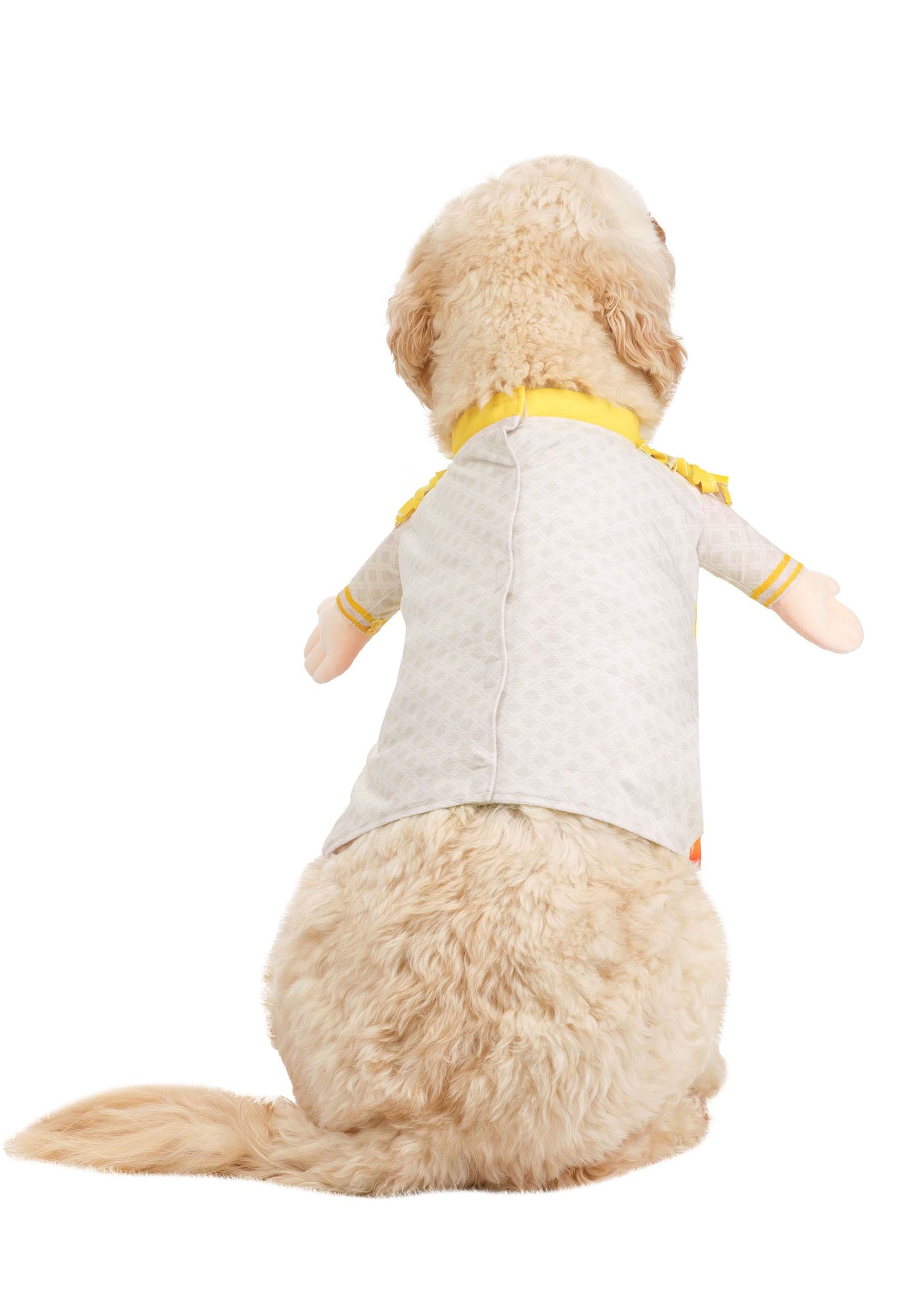 This dog costume starts with super-soft Minky fleece to shape a one-piece costume designed to look like the Prince's formal jacket and red pants thanks to appliqued, embroidered, and printed details. Hook-and-loop fasteners down the back offer easy outfitting. A pair of fiber-filled arms are attached at the sides, featuring a fabric glass slipper in the right hand.