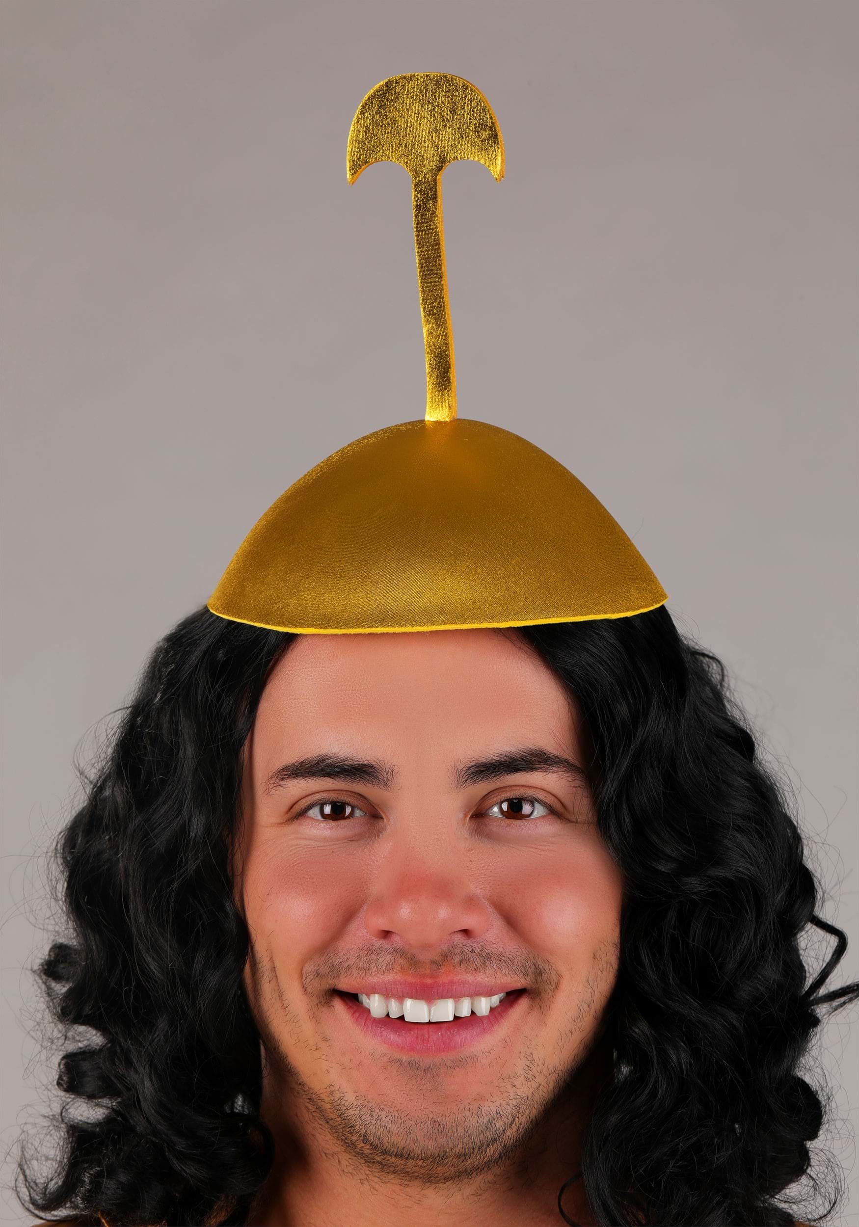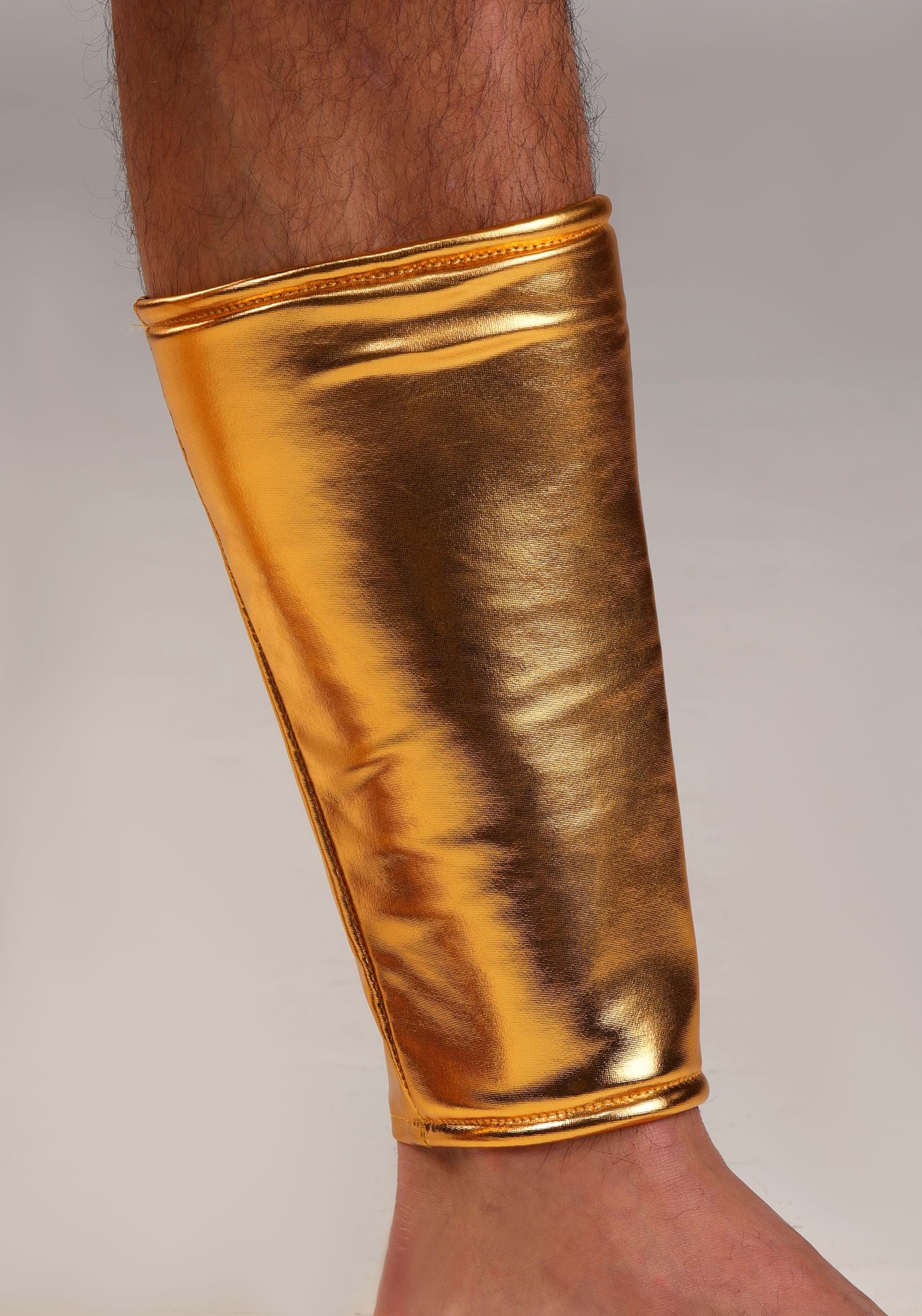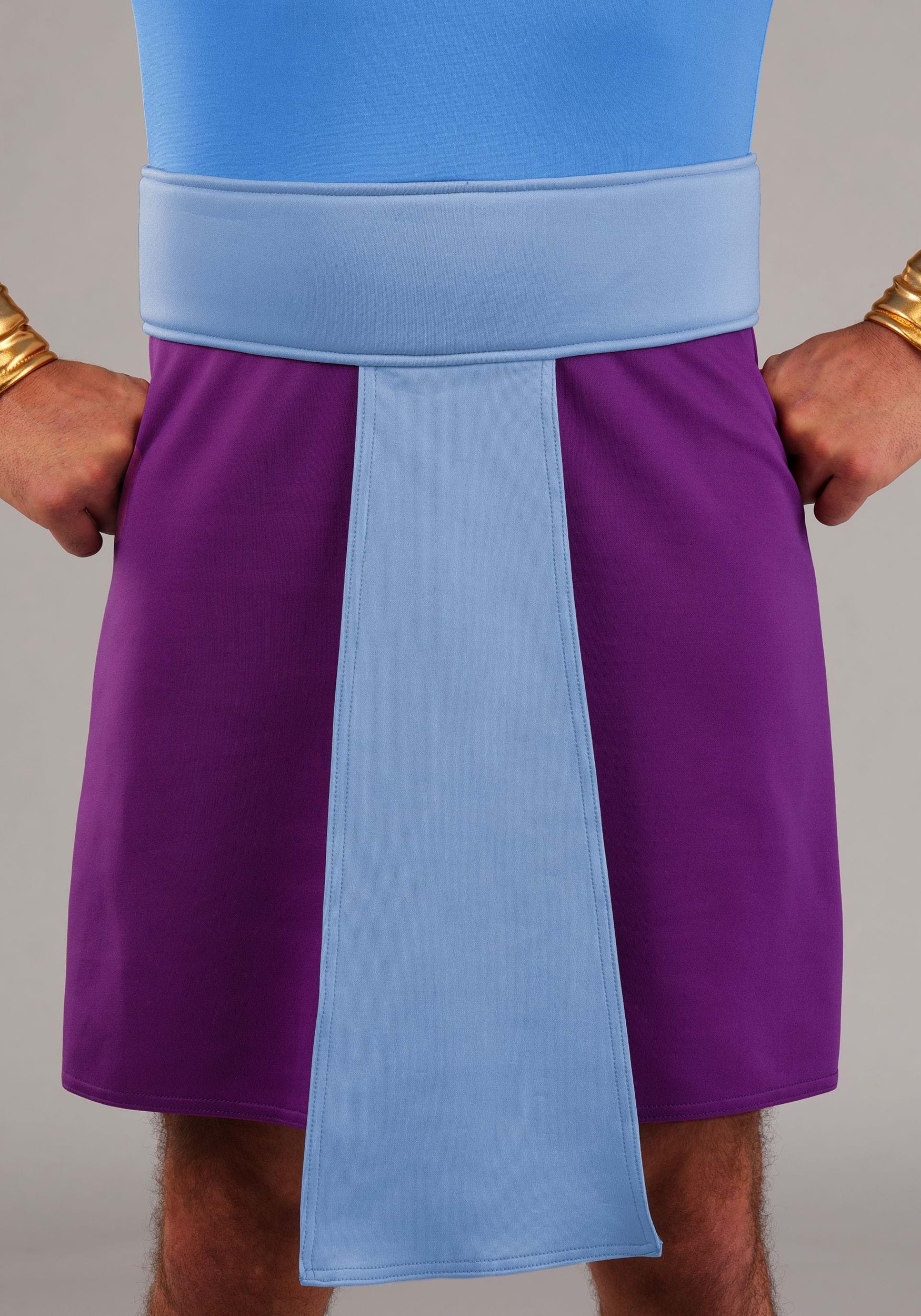 A knee-length tunic with a purple skirt, padded blue bodice, and metallic gold neckline starts the look. It's pullover design and hook-and-loop fasteners in the back ensure quick dressing. Meanwhile, a hook-and-loop fastened sash, metallic gold cap with a decorative comb, and matching gold hook-and-loop fastened cuffs for wrists and ankles ensure a complete look. It's perfect for any costume scene!
